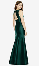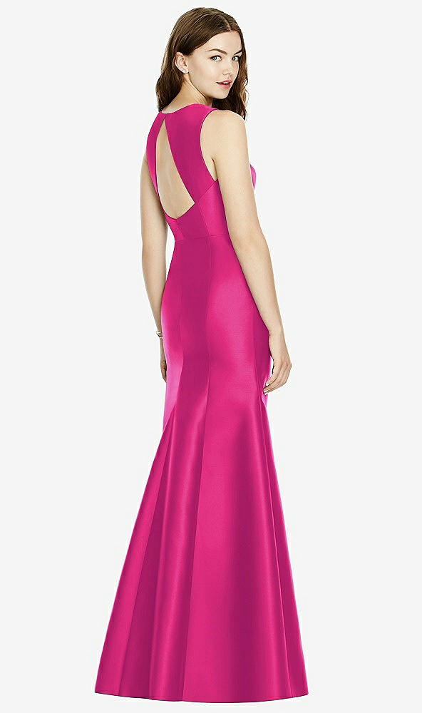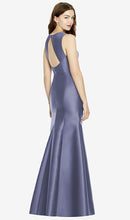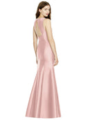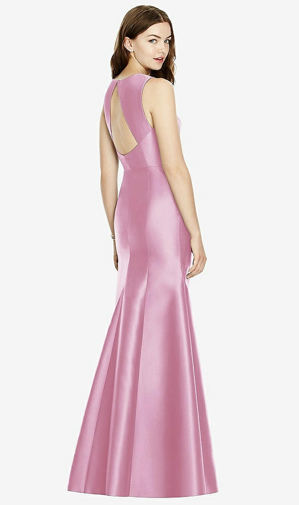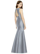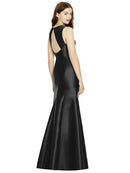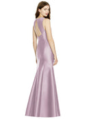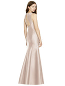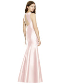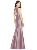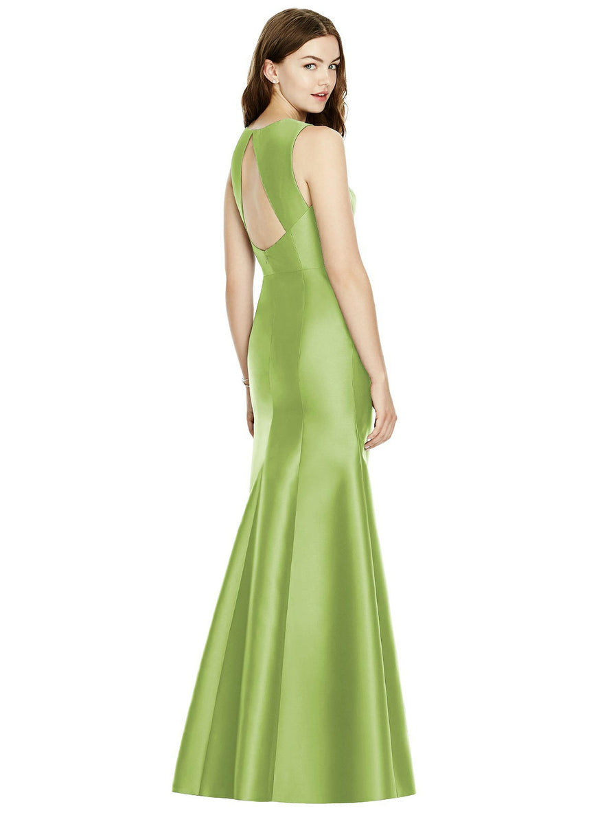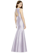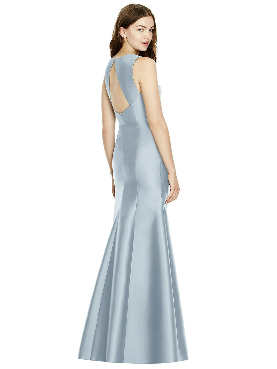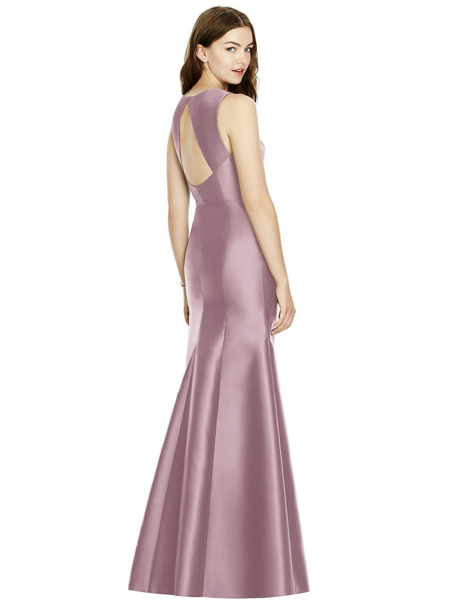 Shiny satin twill elongates the full-length trumpet skirt of this bridesmaid dress. Comfort is upgraded with sleeveless details and a flirty diamond back cut out.