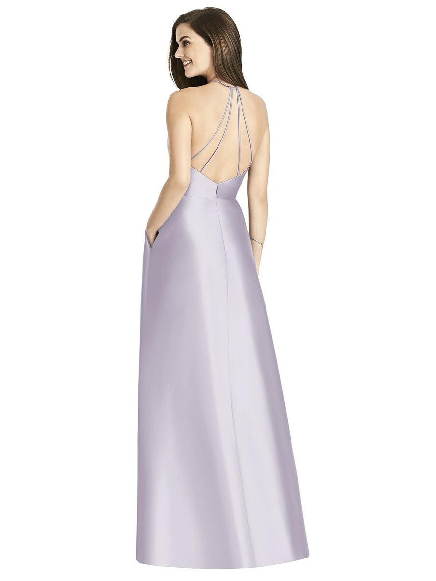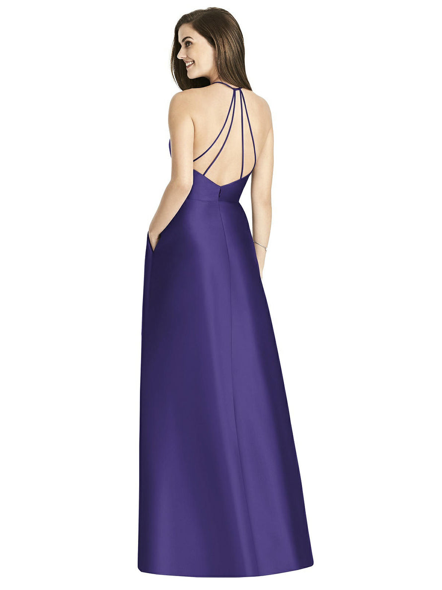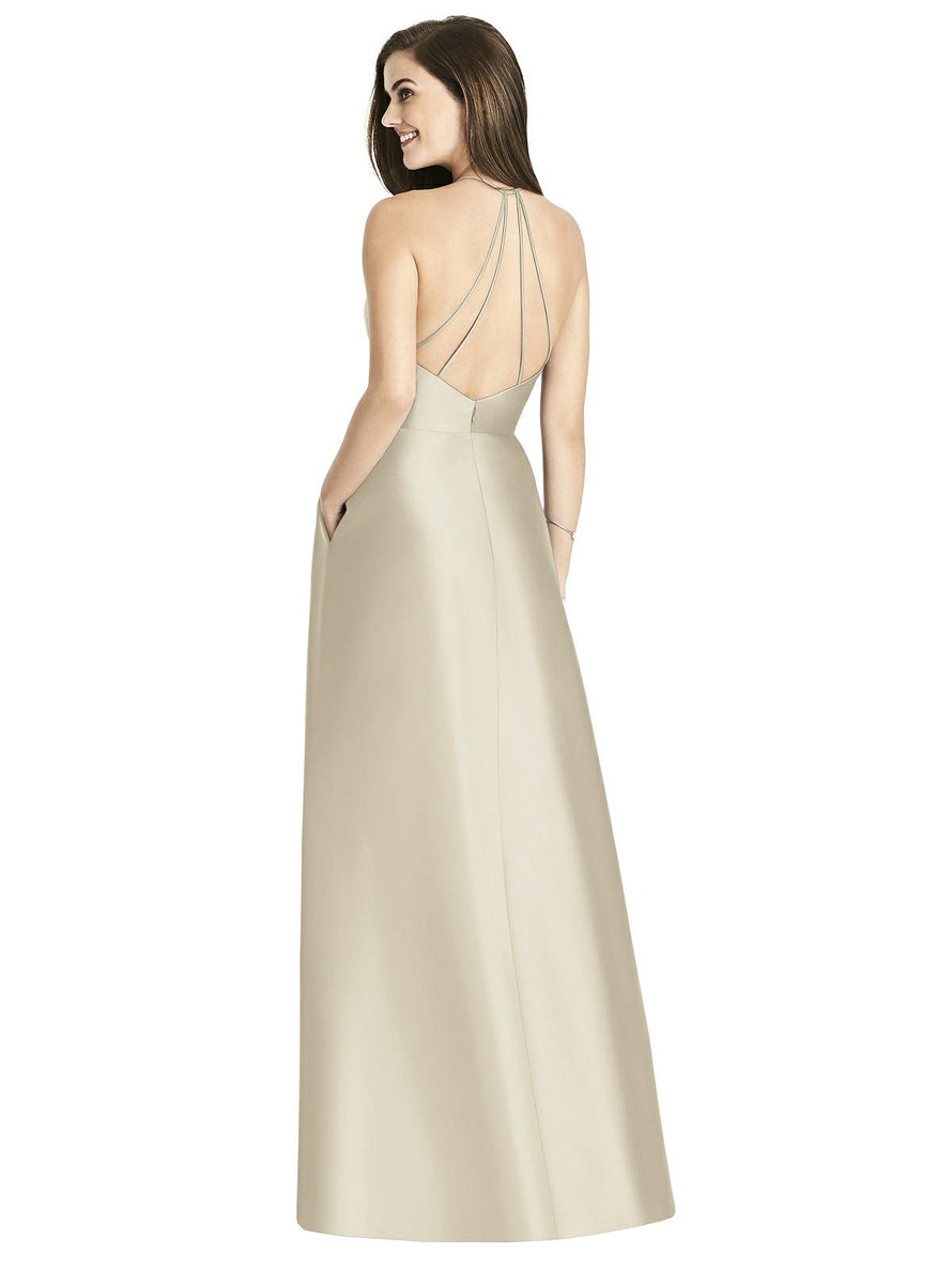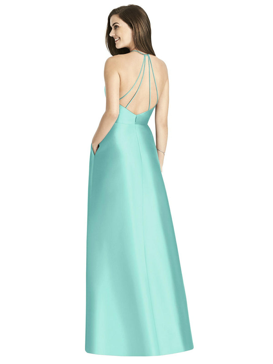 A figure-flattering simple silhouette is complete with the satin twill fabric in this full-length bridesmaid dress, upgraded with an open spaghetti strap back. A modified halter neckline featuring a keyhole cut out adds dimension, balanced out by a full A-line skirt with pockets.