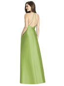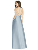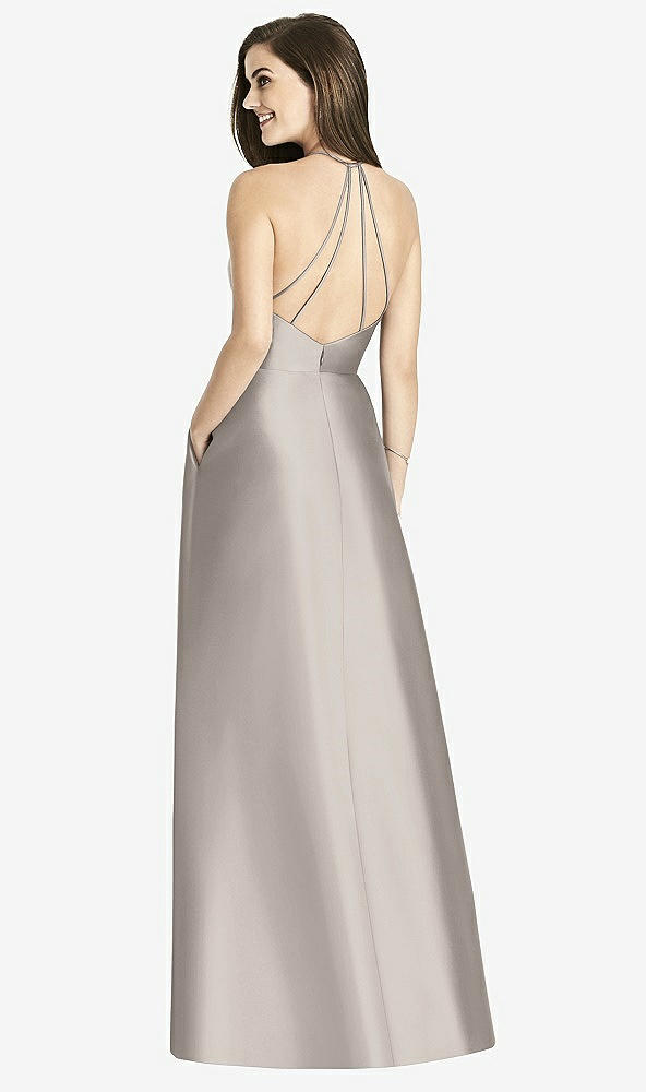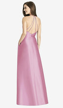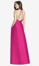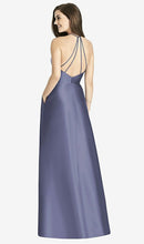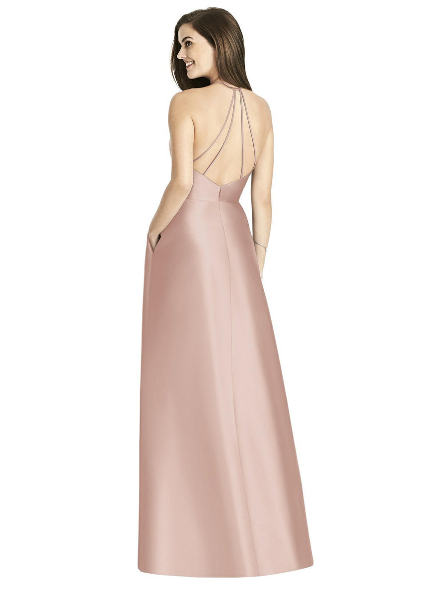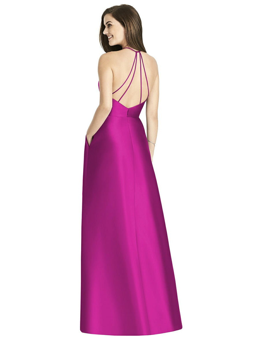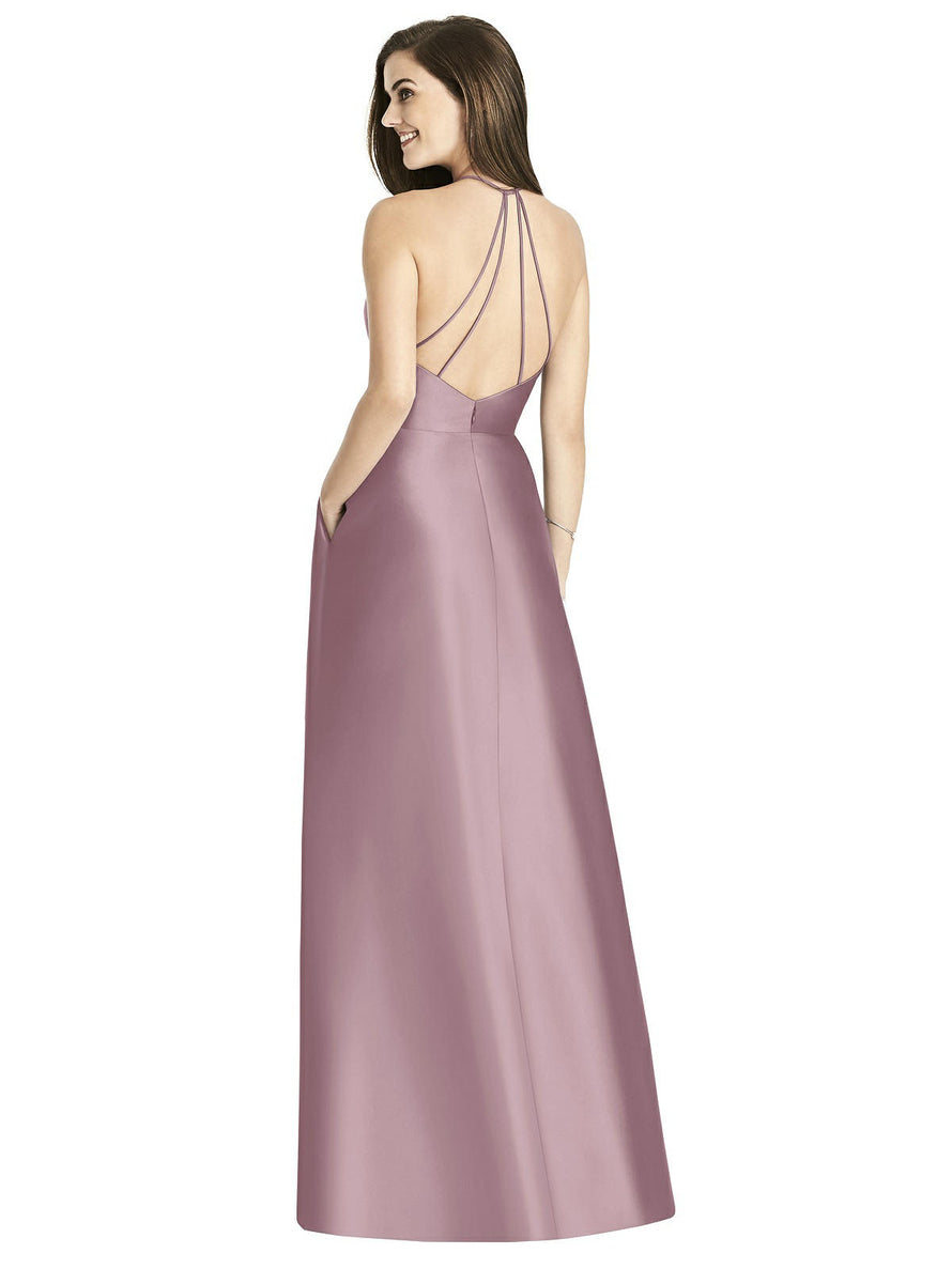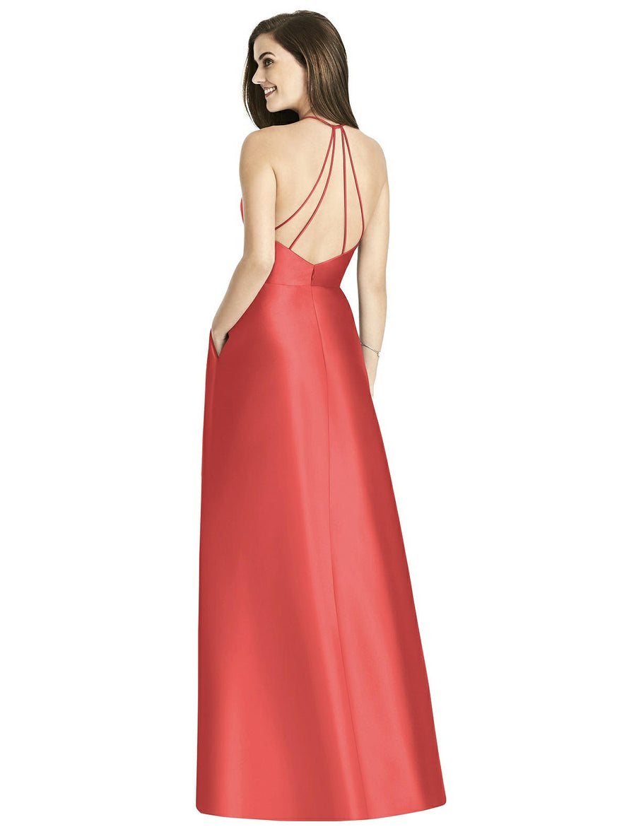 A figure-flattering simple silhouette is complete with the satin twill fabric in this full-length bridesmaid dress, upgraded with an open spaghetti strap back. A modified halter neckline featuring a keyhole cut out adds dimension, balanced out by a full A-line skirt with pockets.