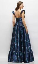 Baroque Rose Damask maxi dress with boned corset style bodice. Delicate layered ruffle spaghetti strap (adjustable). Shirred skirt with ruffle hem and slit at side front.