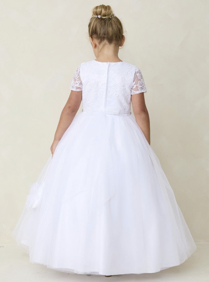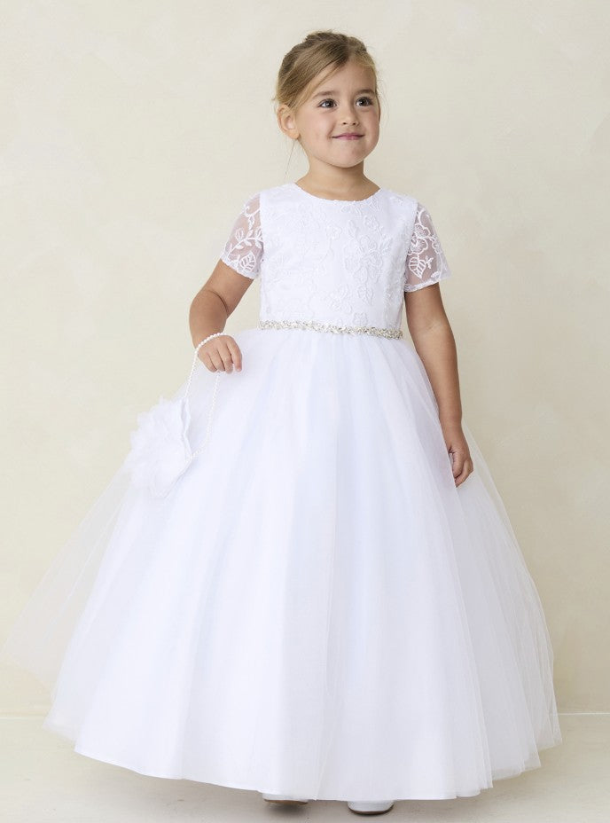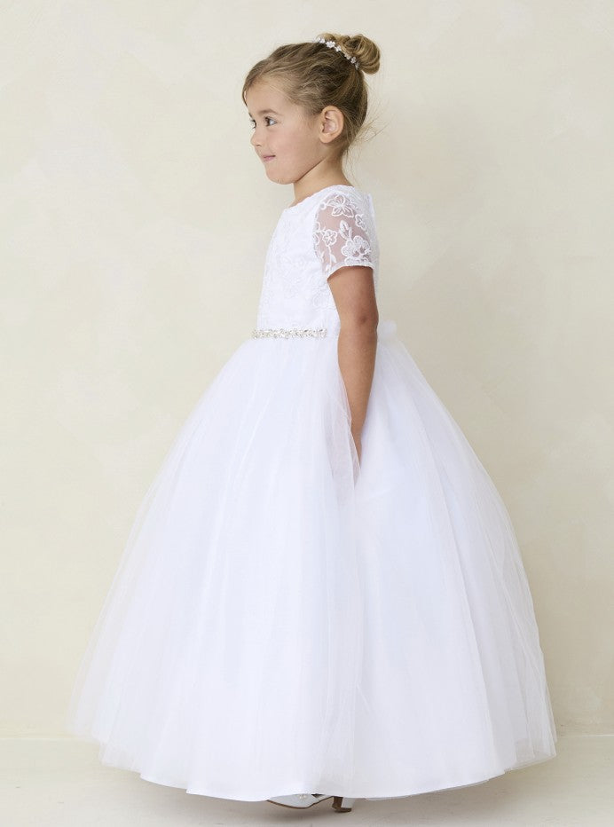 • Girls Short Sleeve Floral Embroidery Bodice with Rhinestone Waist and Tulle Skirt