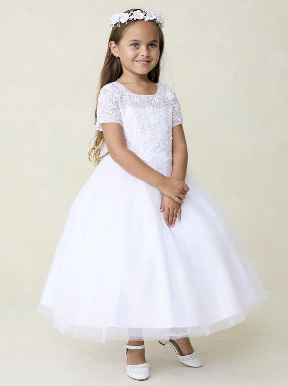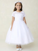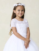 • Girls Short Sleeve Lace Applique with 3D Flowers and Tulle Skirt