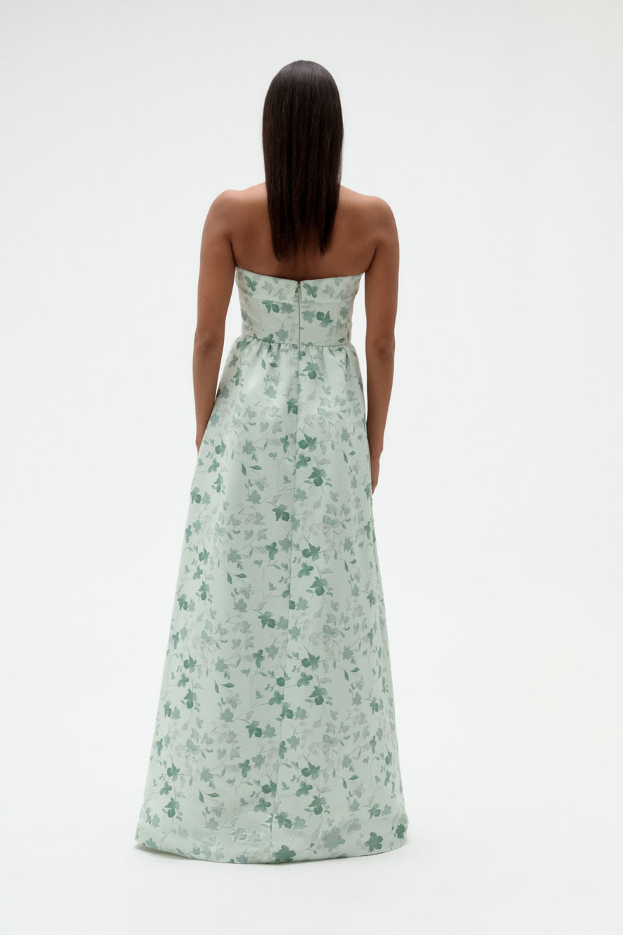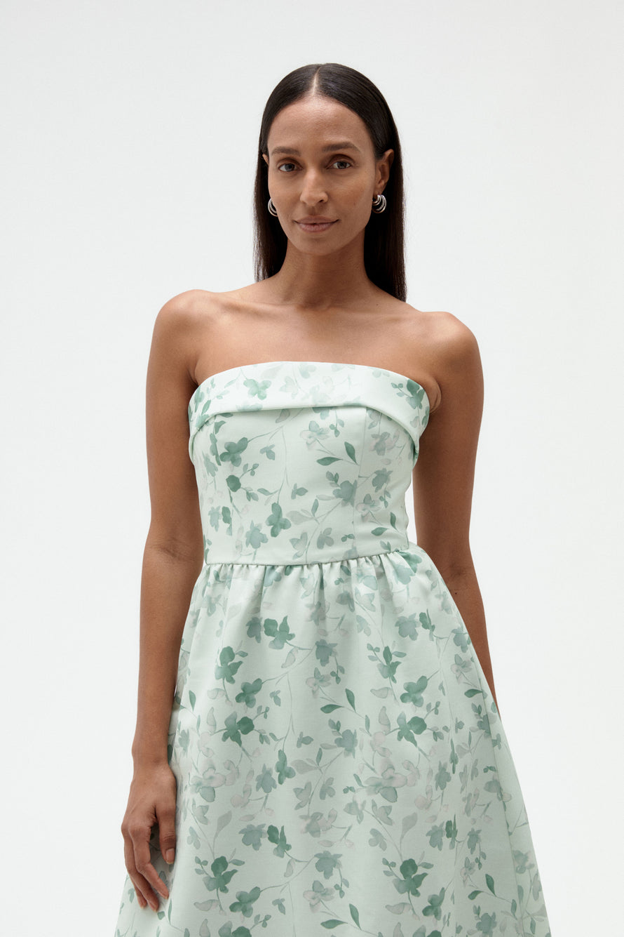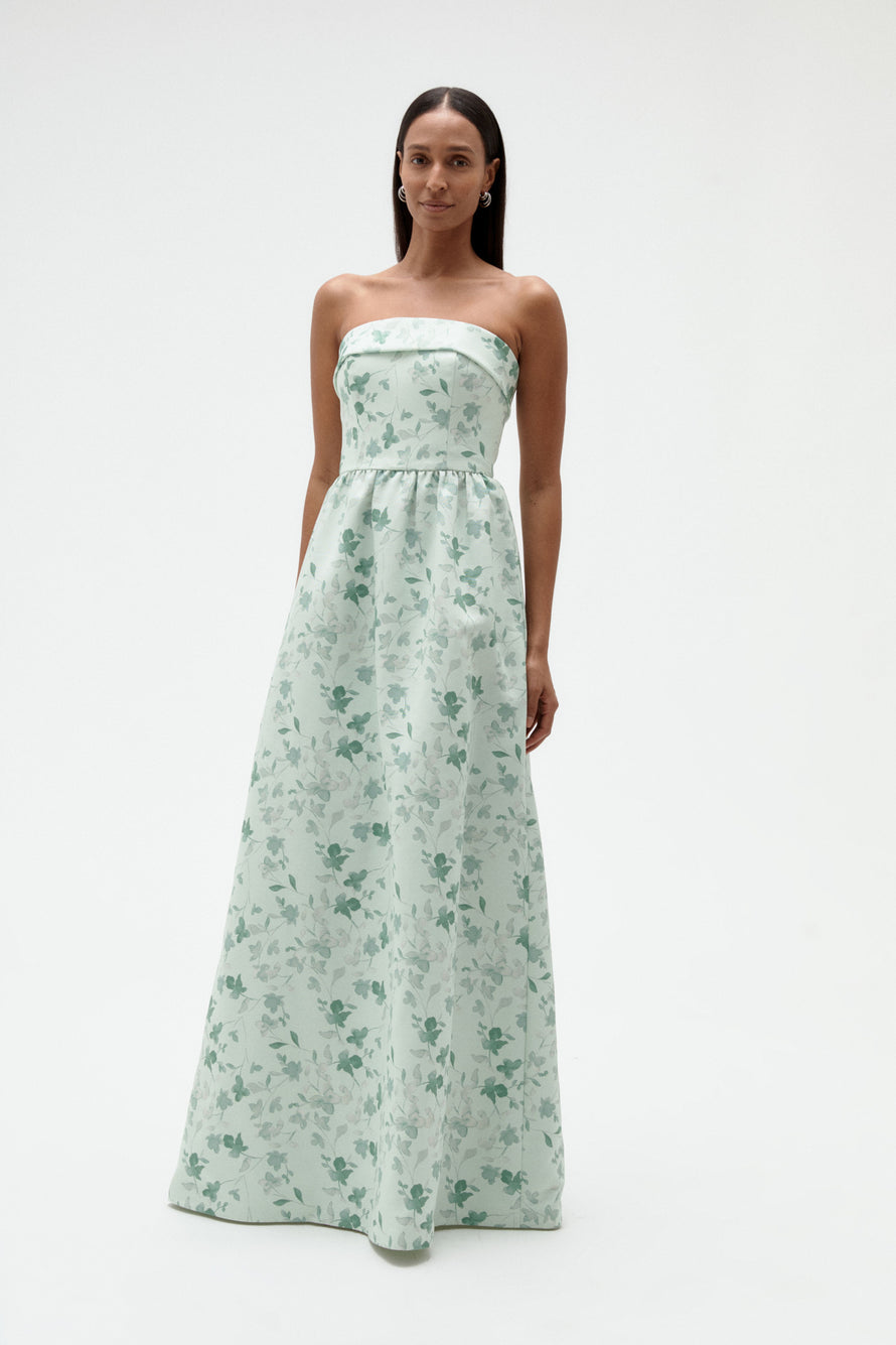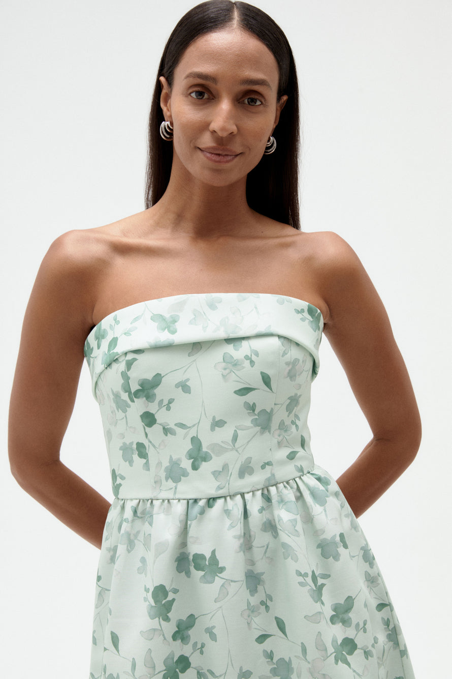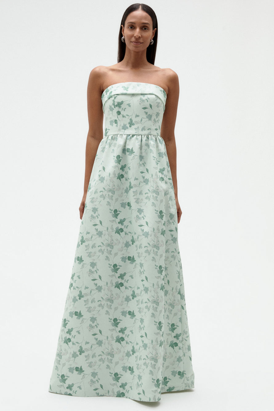 Tailored foldover strapless bodice and a wide, structured dirndl skirt with pockets. This simple yet stylish gown is an excellent choice for any bridal party!