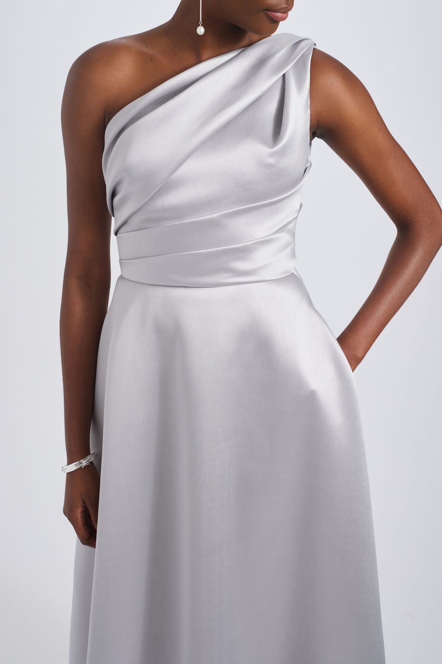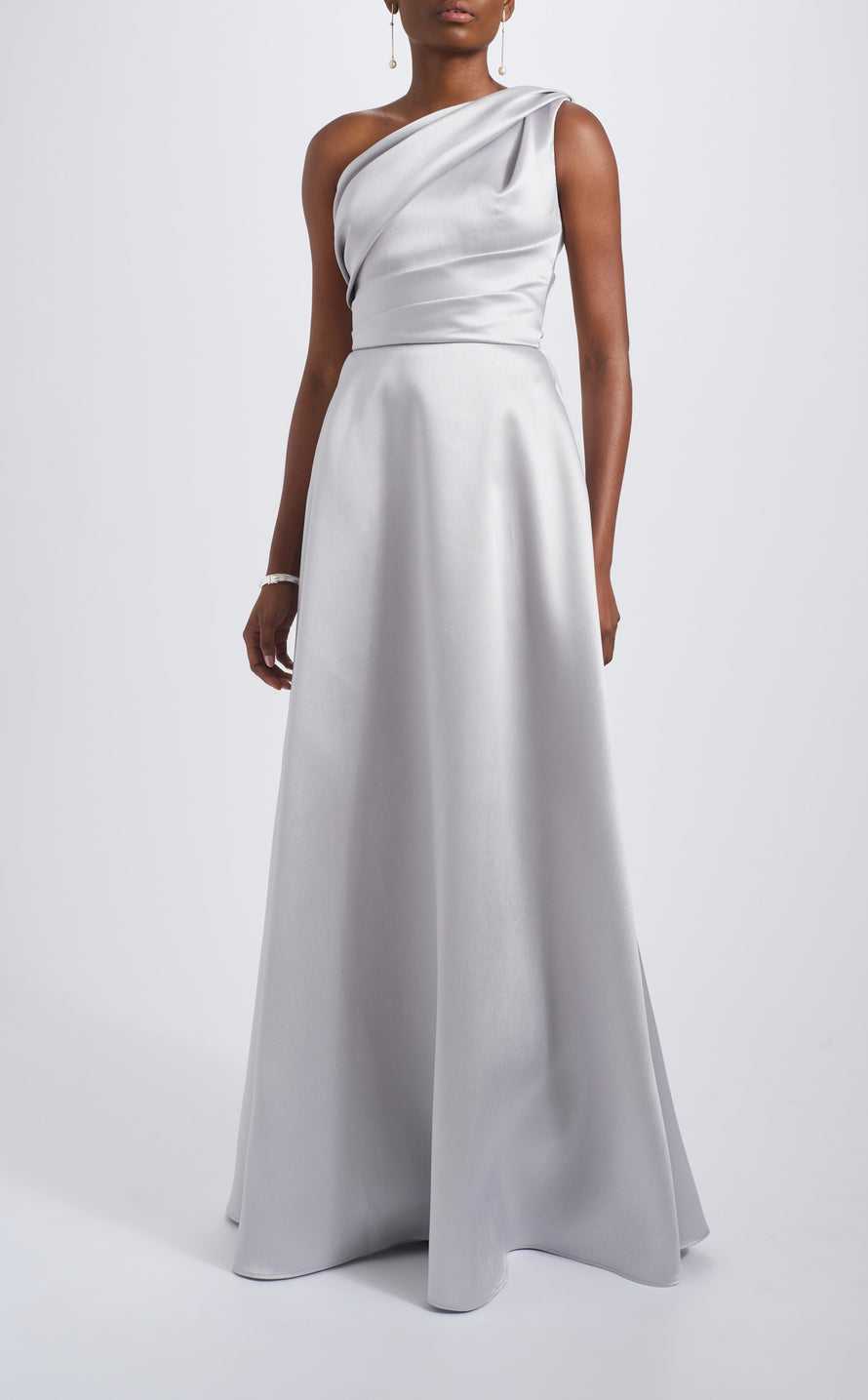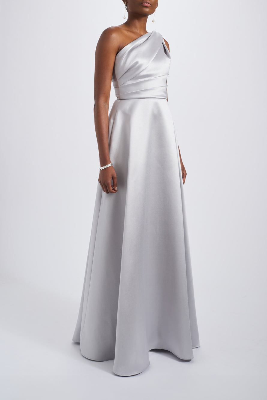 Mikado one-shoulder draped A-line gown.