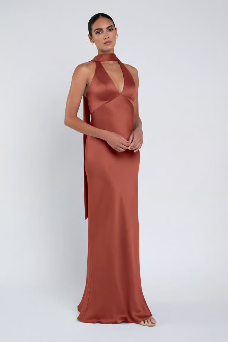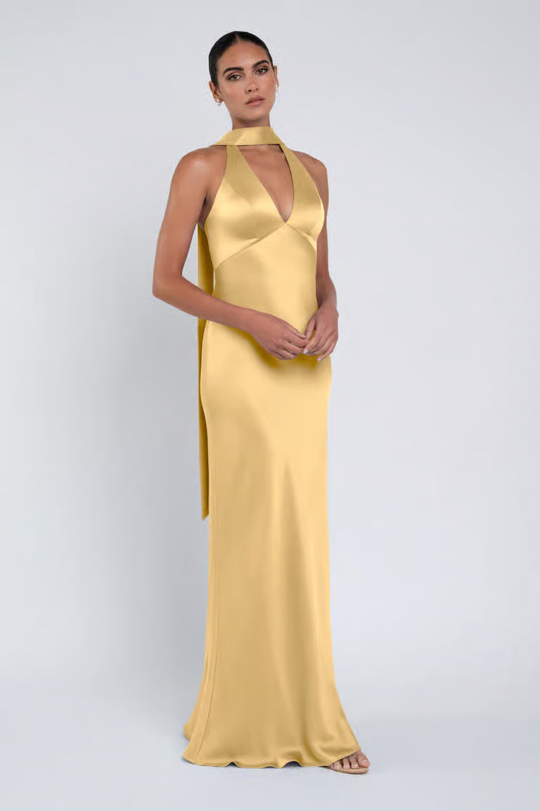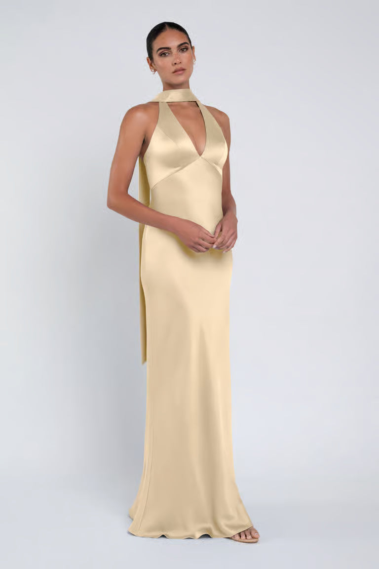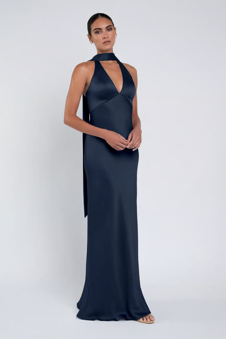 The luxe satin Louisa dress features a plunging halter neckline, slinky bias cut skirt, and a chic scarf accessory.