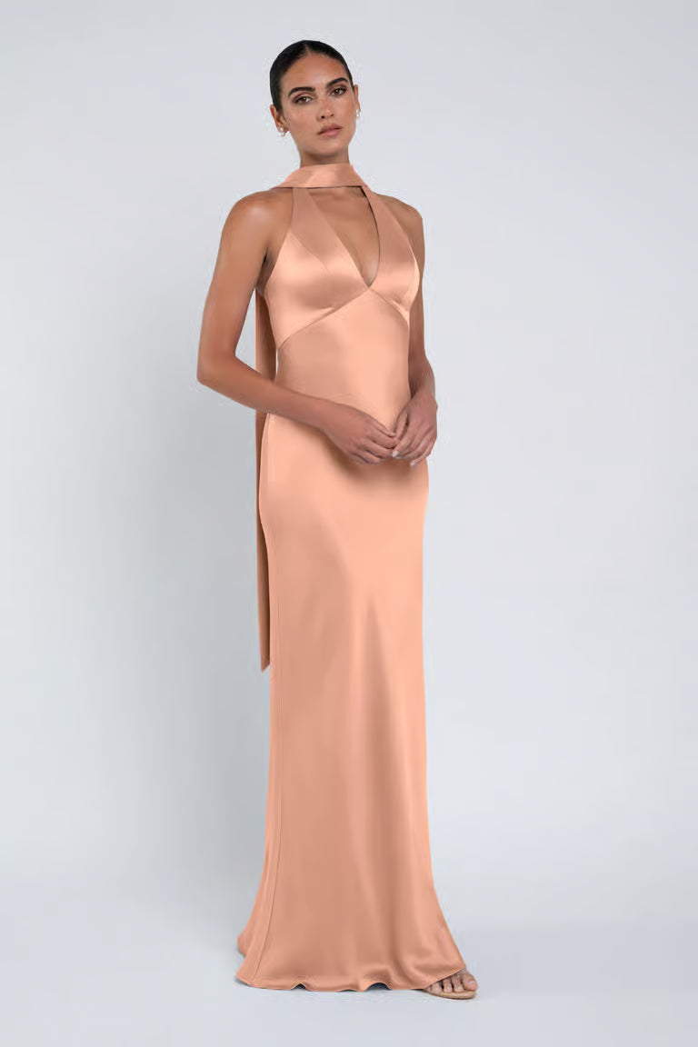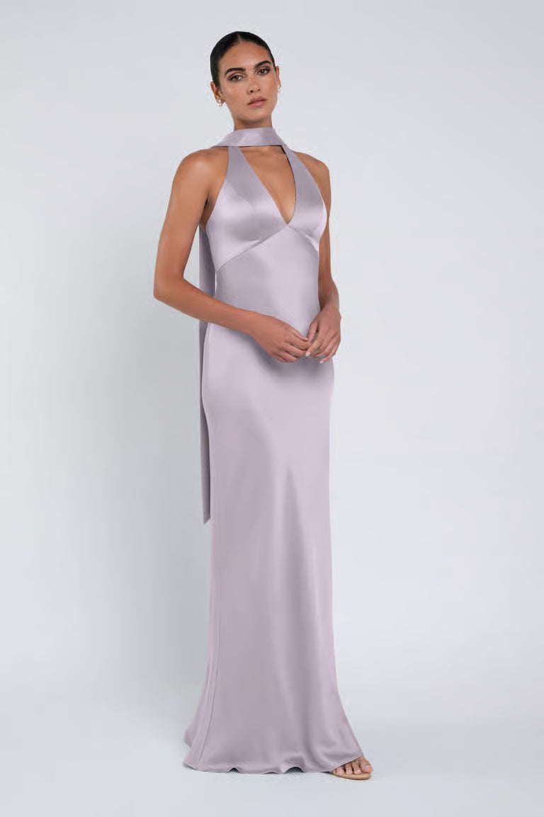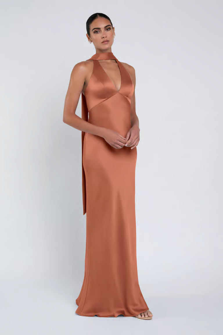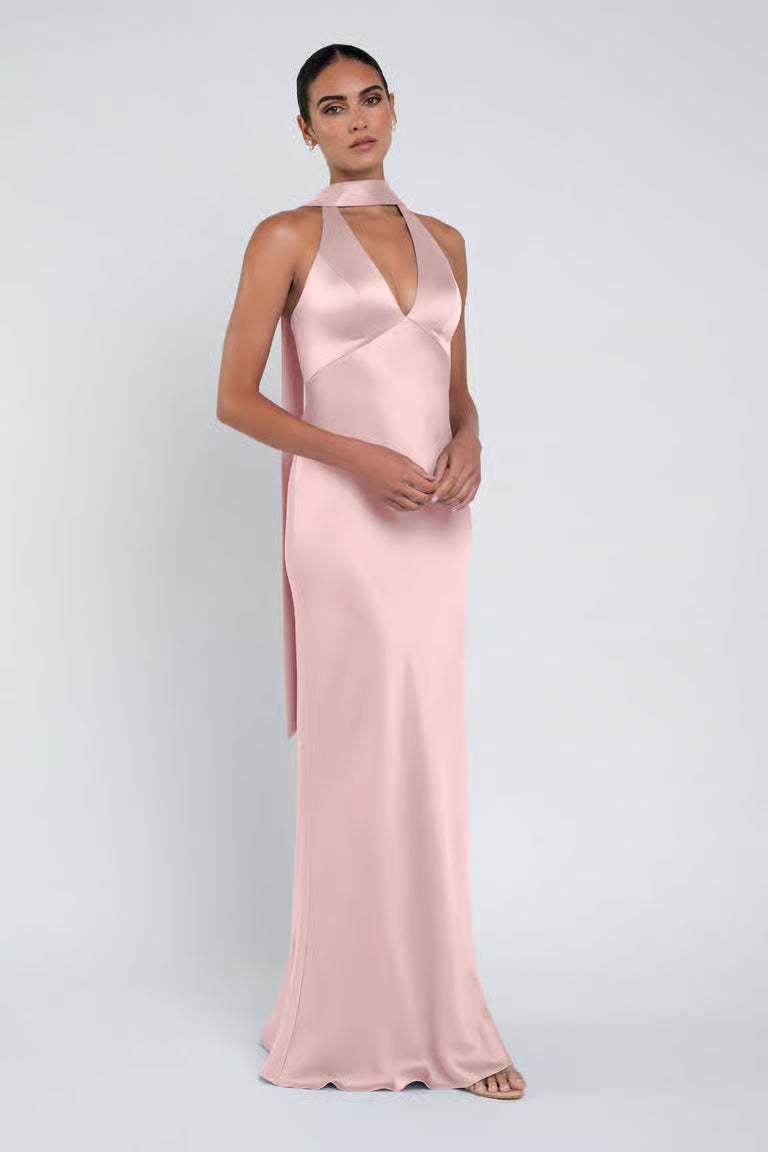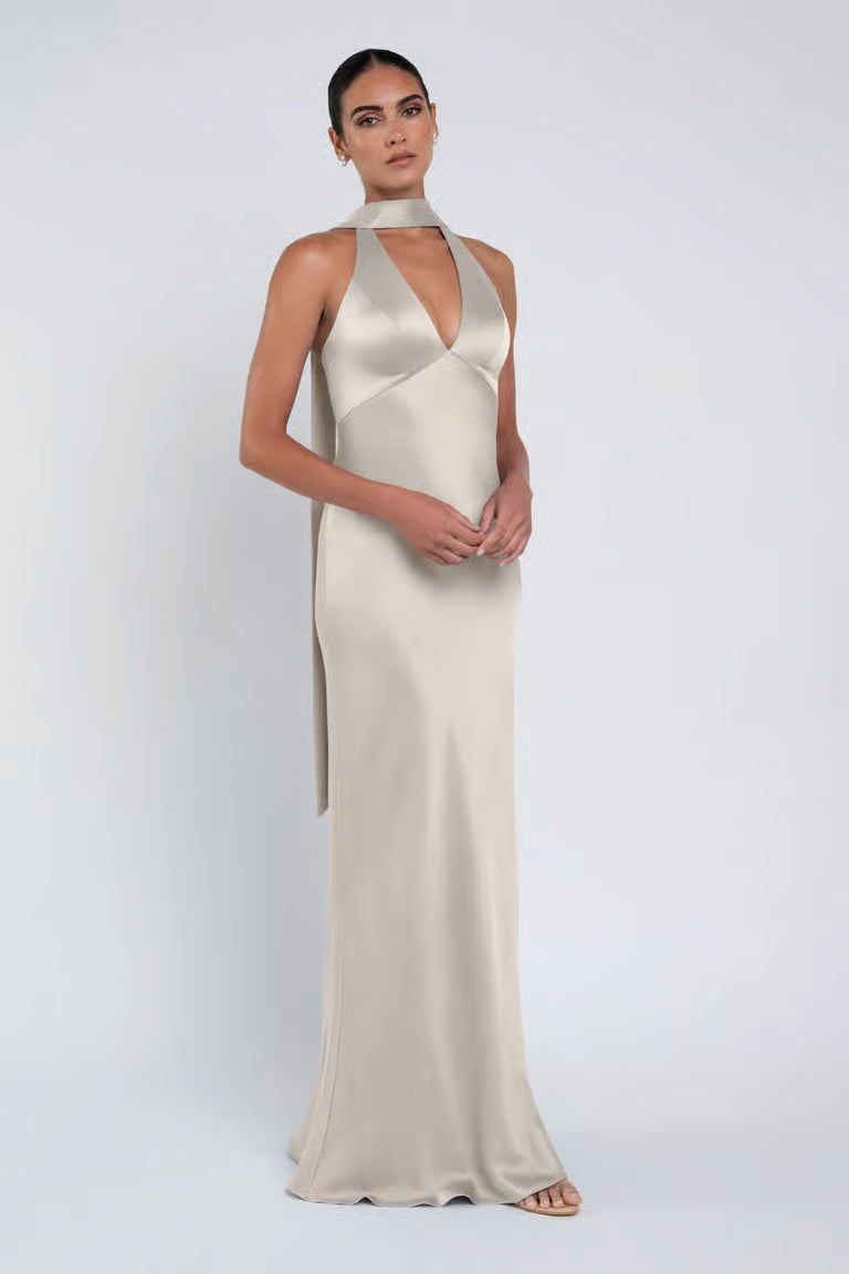 The luxe satin Louisa dress features a plunging halter neckline, slinky bias cut skirt, and a chic scarf accessory.
