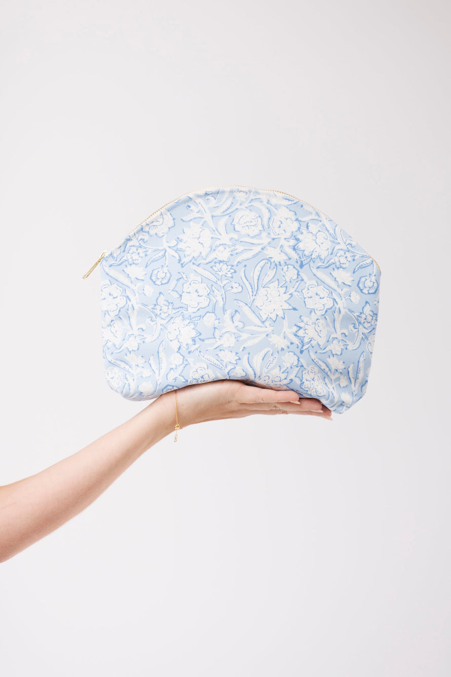 The everything pouch. The perfect gift for your wedding party or bachelorette weekend accessory. Shown here in our Ocean Mist print. Made in durable cotton canvas with a brass zipper closure. •  Canvas shell - 100% Polyester•   Canvas lining - 100% Cotton •  Pouch measures 11"L x 8.5"H x 3"W