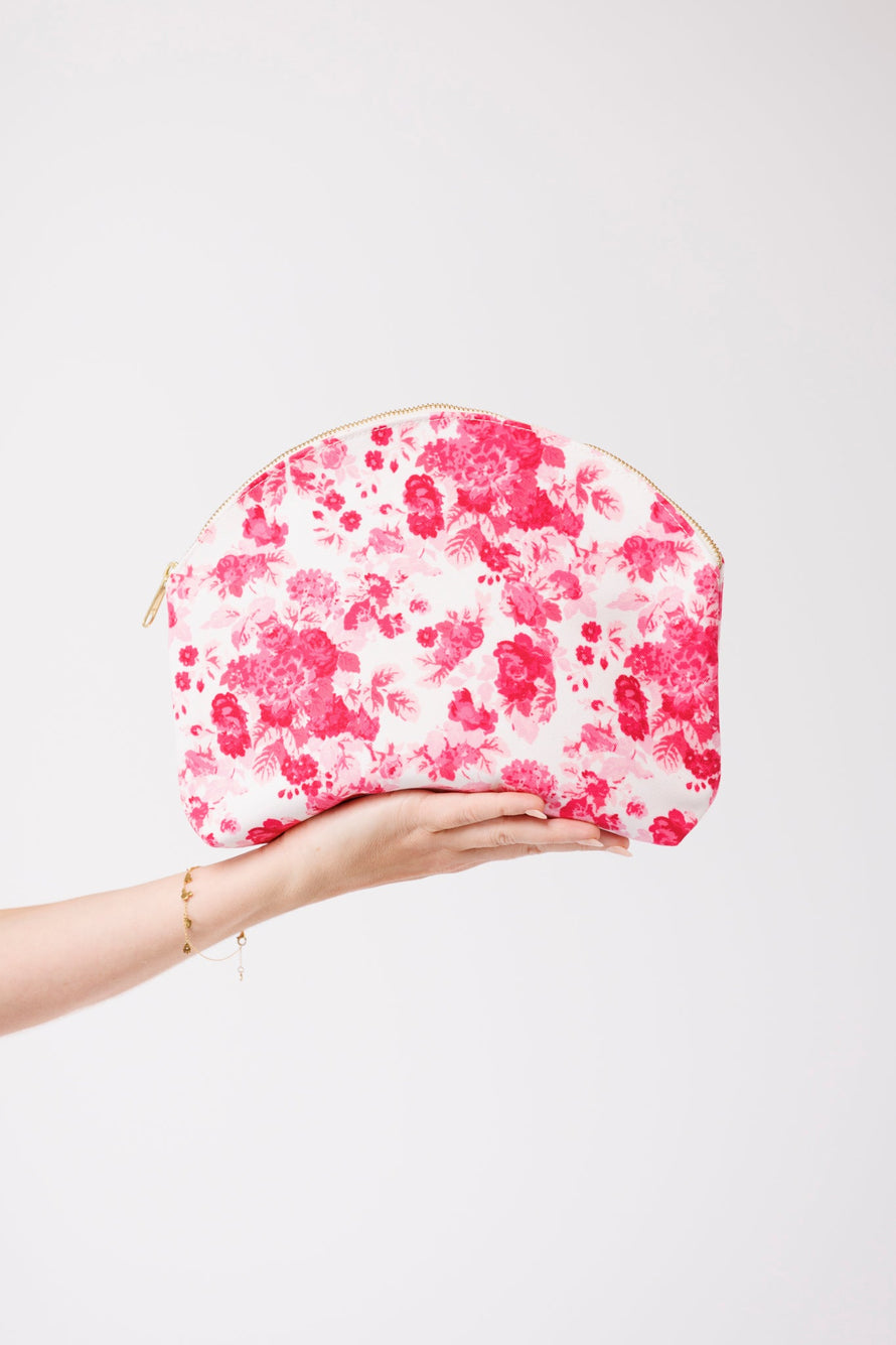 The everything pouch. The perfect gift for your wedding party or bachelorette weekend accessory. Shown here in our Raspberry Chateau print. Made in durable cotton canvas with a brass zipper closure. • Canvas shell - 100% Polyester• Canvas lining - 100% Cotton • Pouch measures 11"L x 8.5"H x 3"W