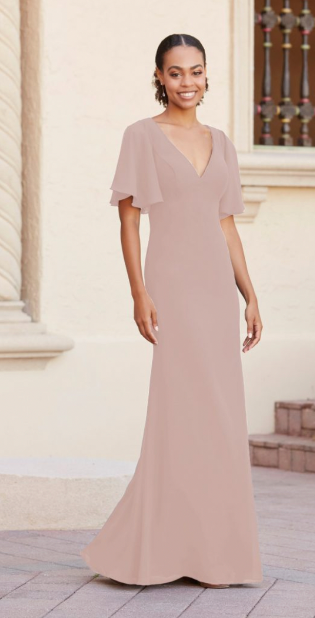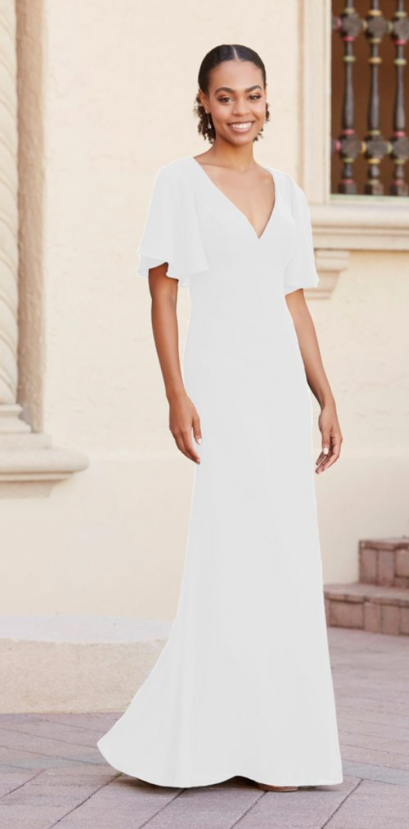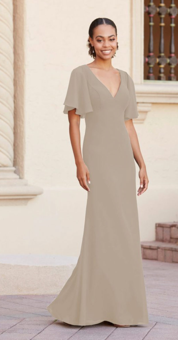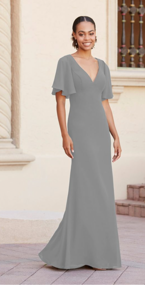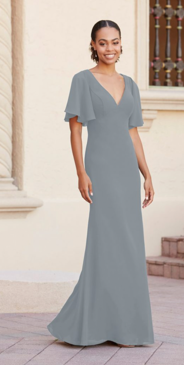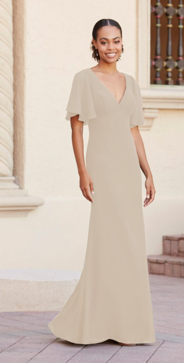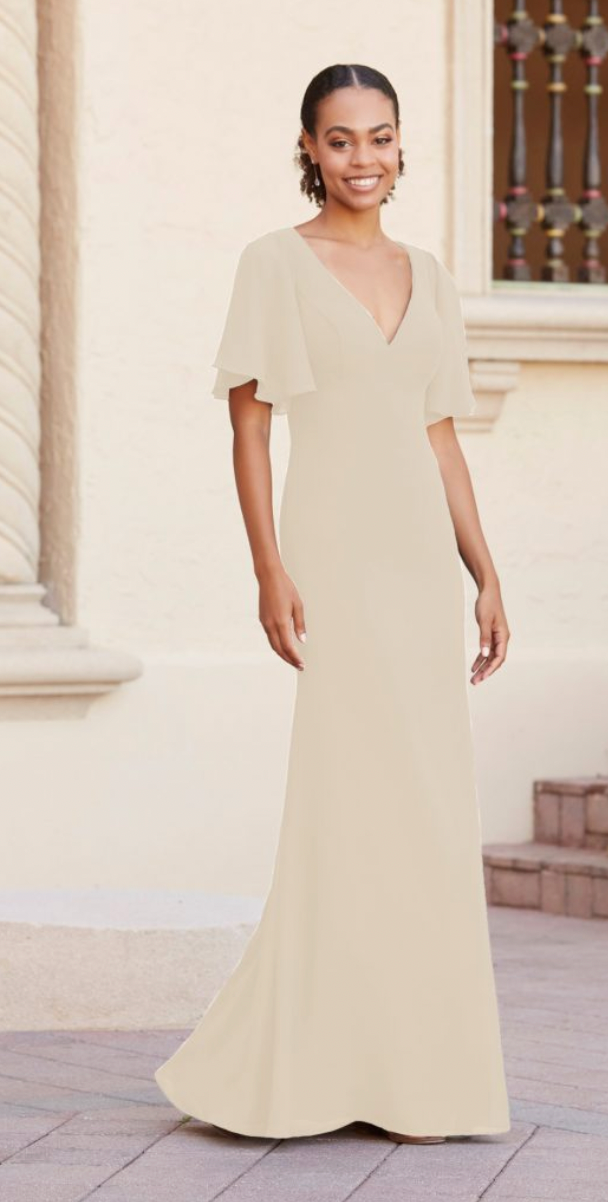 This gown features a v-neckline, empire bodice with flutter sleeves and a subtle fit to flare skirt to help accentuate your figure. While this dress is understated there is an element of elegance that makes it perfect for any occasion.