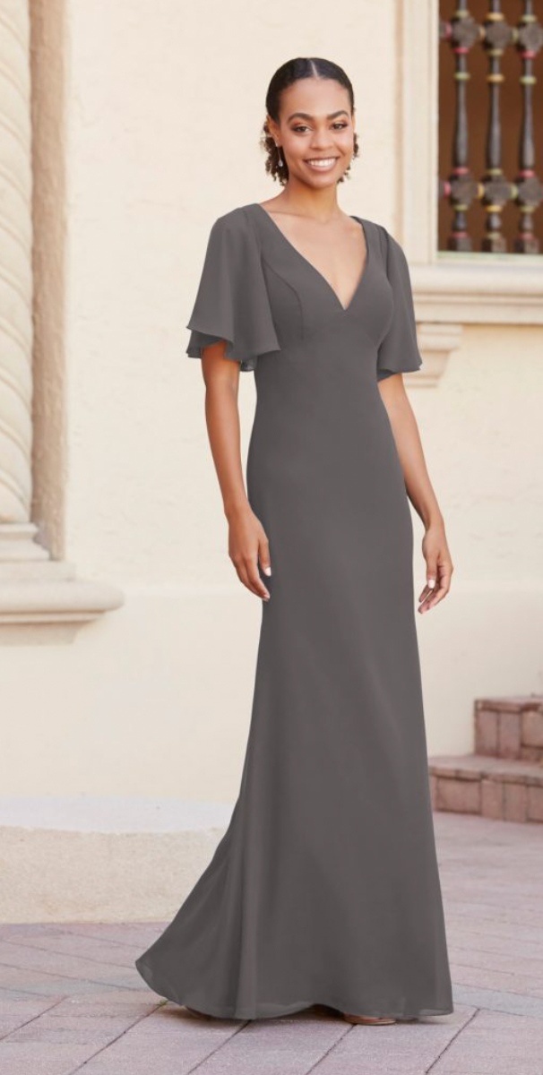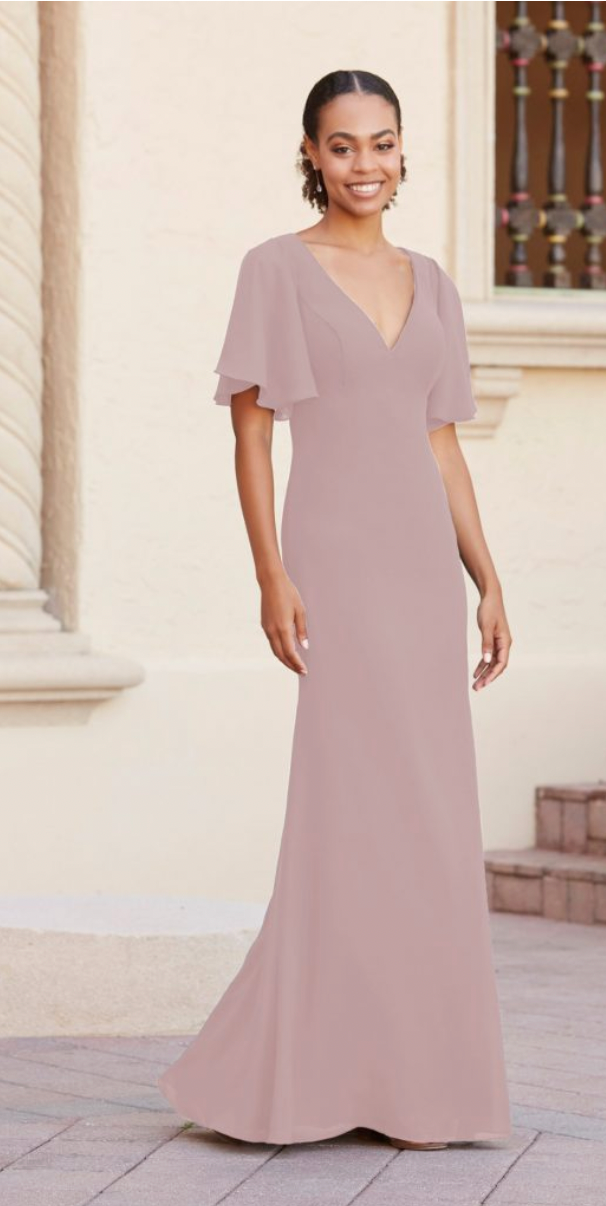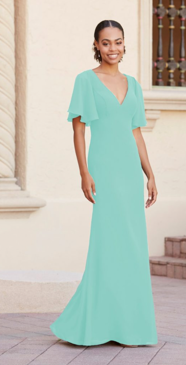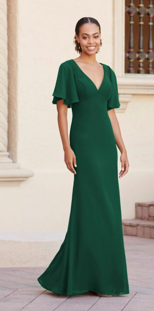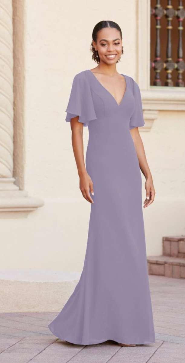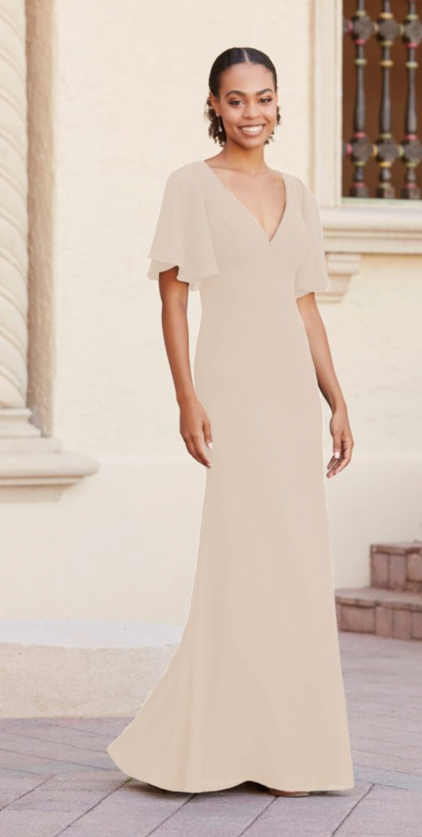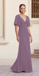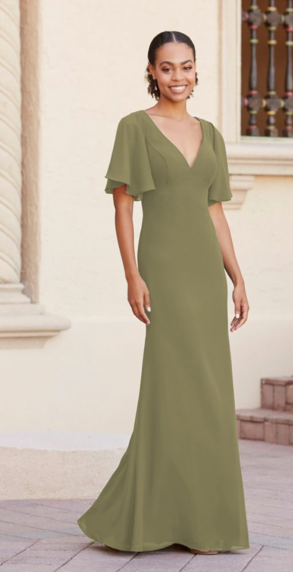 This gown features a v-neckline, empire bodice with flutter sleeves and a subtle fit to flare skirt to help accentuate your figure. While this dress is understated there is an element of elegance that makes it perfect for any occasion.