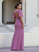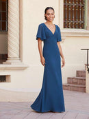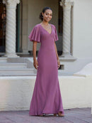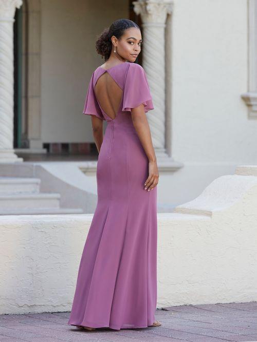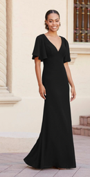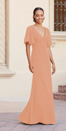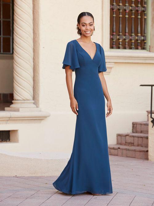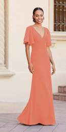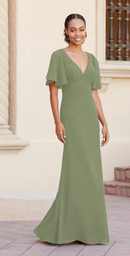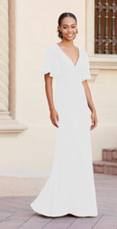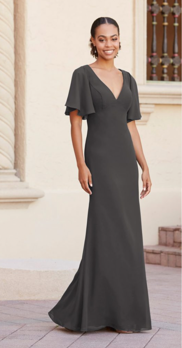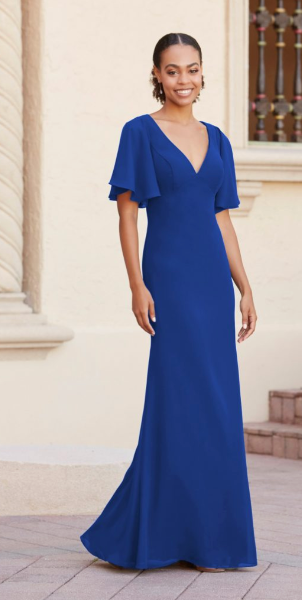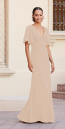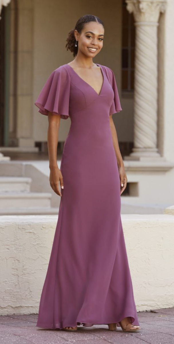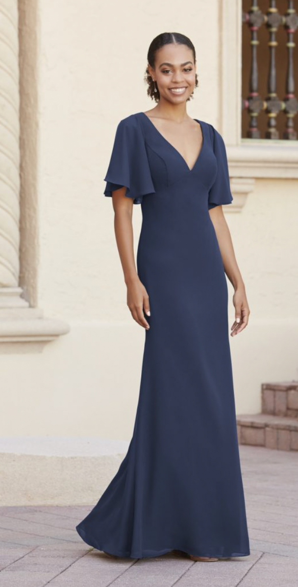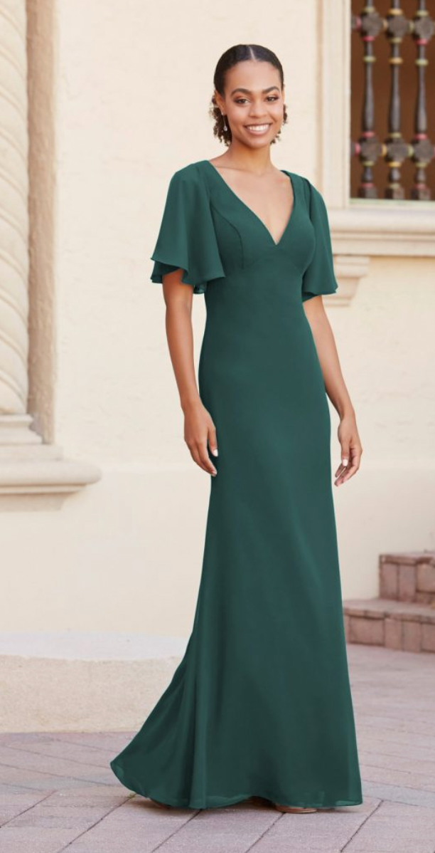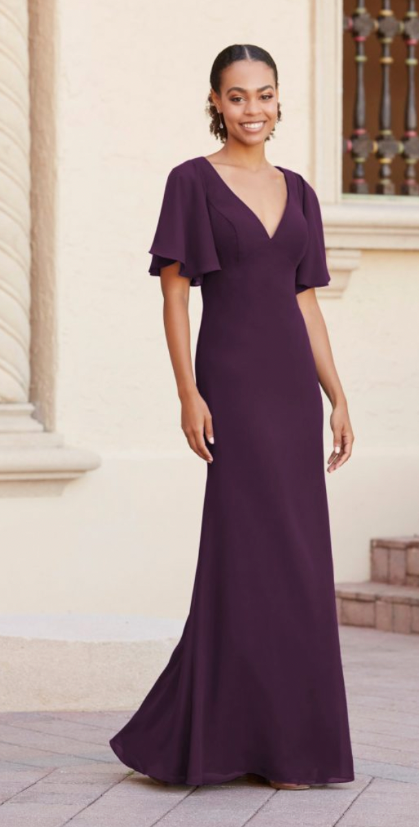 This gown features a v-neckline, empire bodice with flutter sleeves and a subtle fit to flare skirt to help accentuate your figure. While this dress is understated there is an element of elegance that makes it perfect for any occasion.