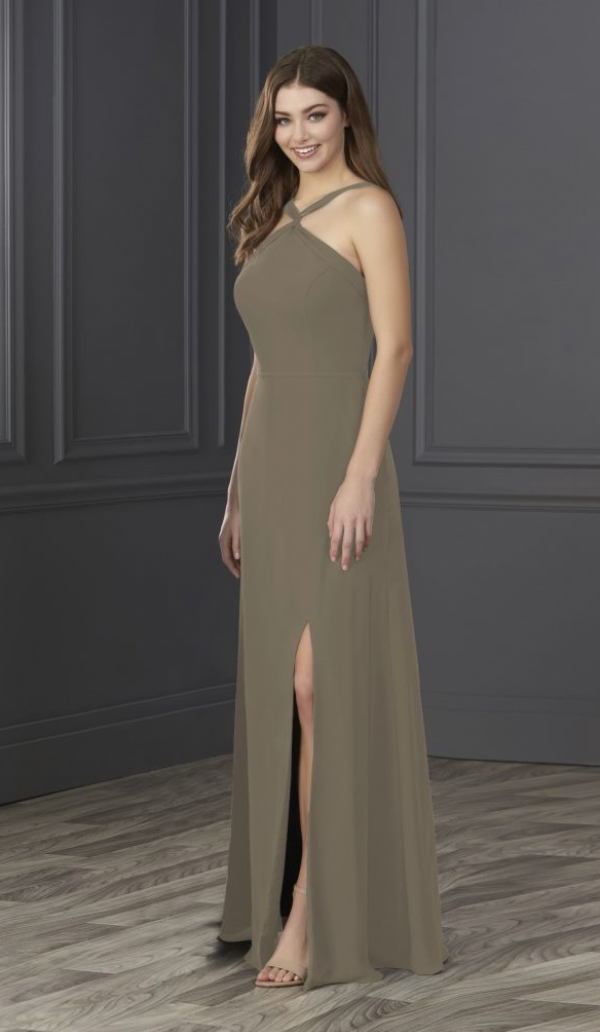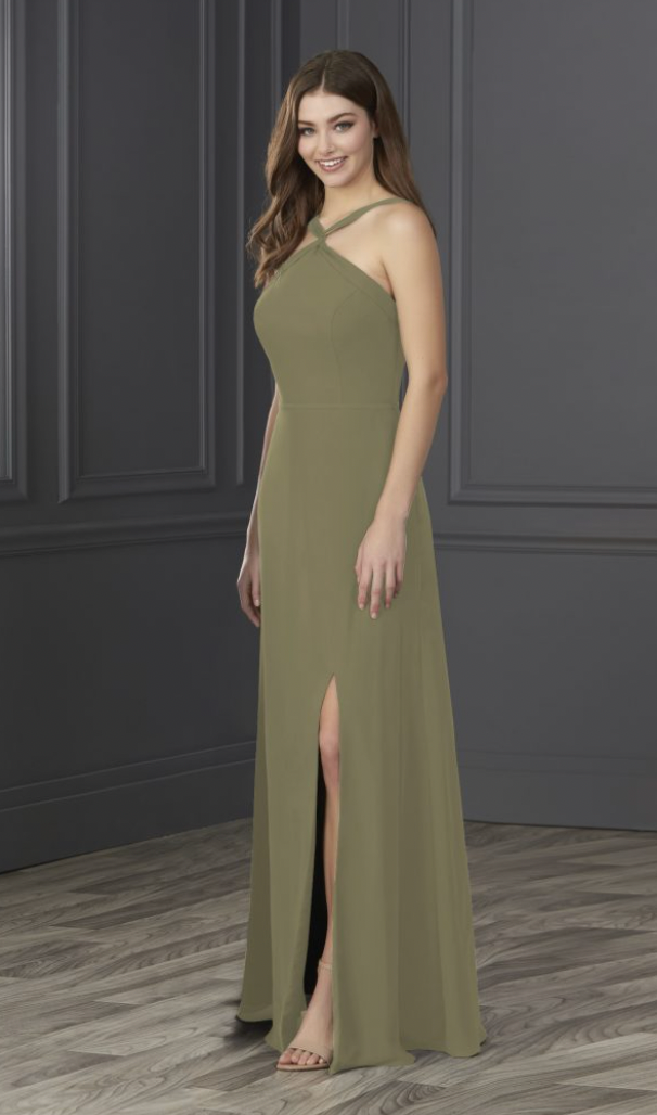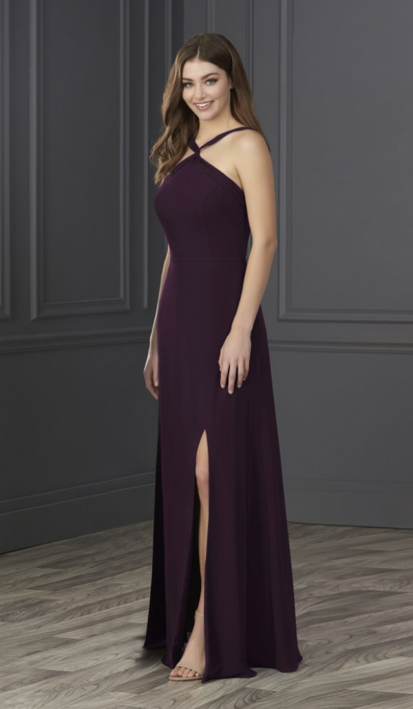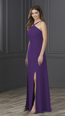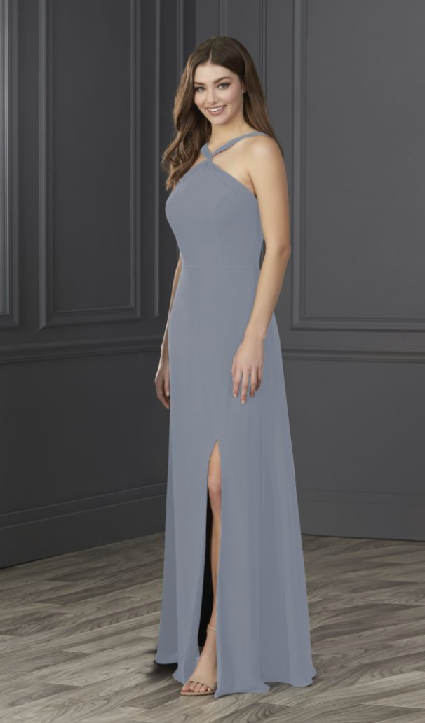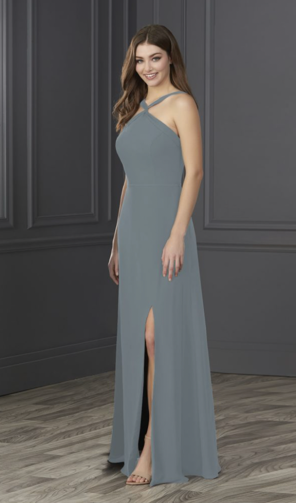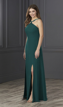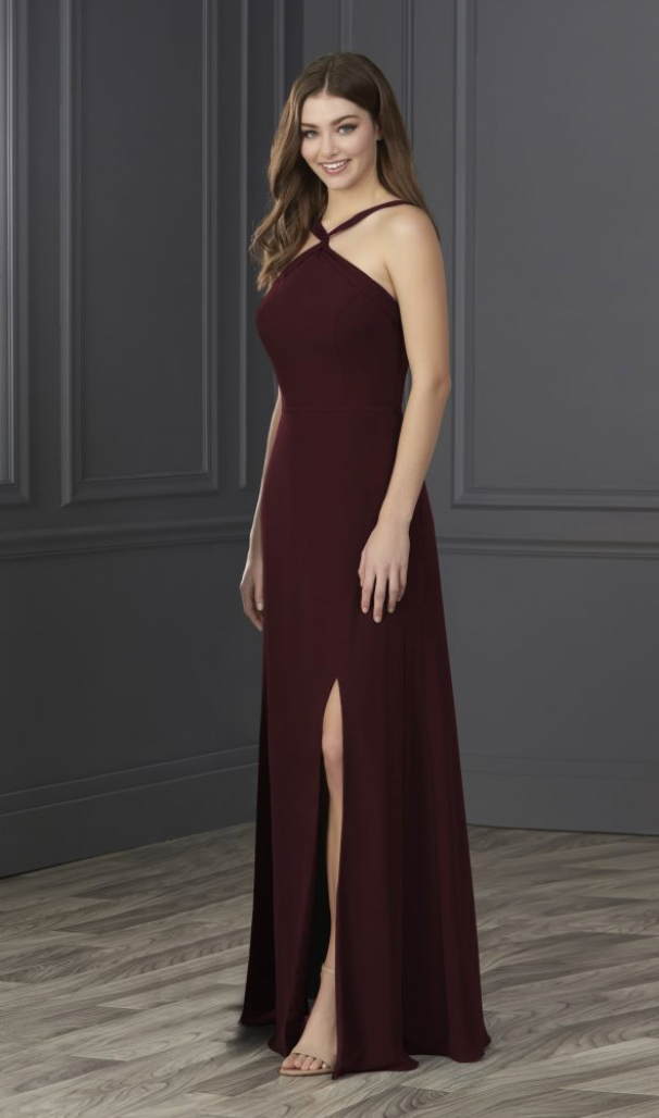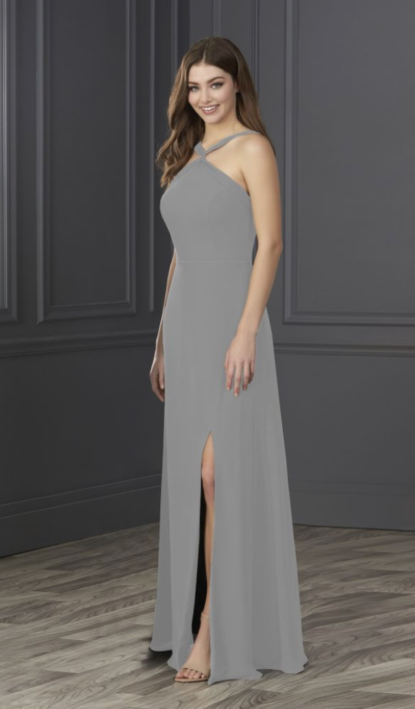 This chiffon halter is chic and sultry featuring an open back, slim A-line skirt, and a front skirt slit.