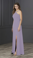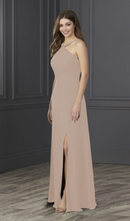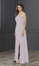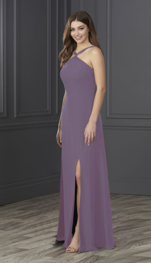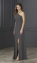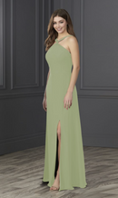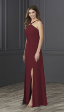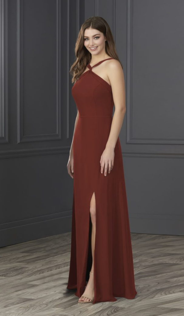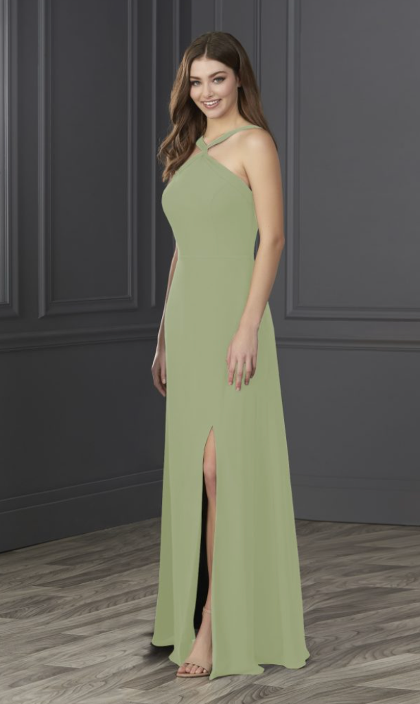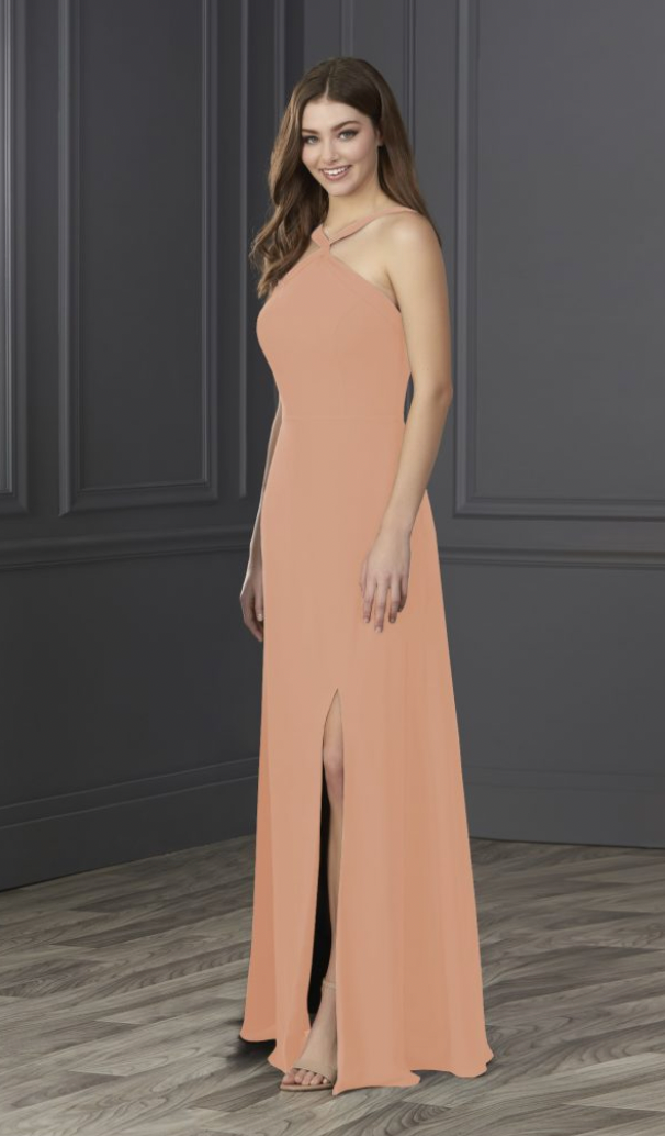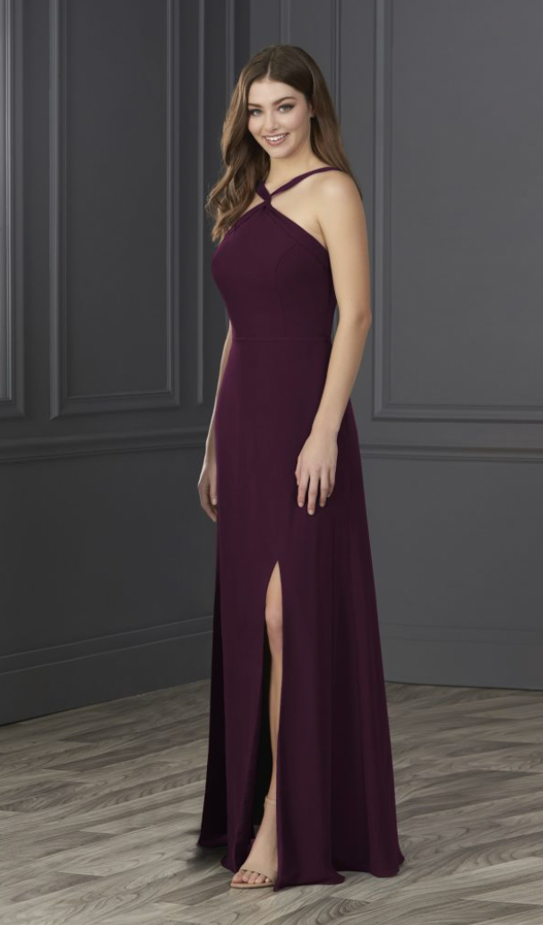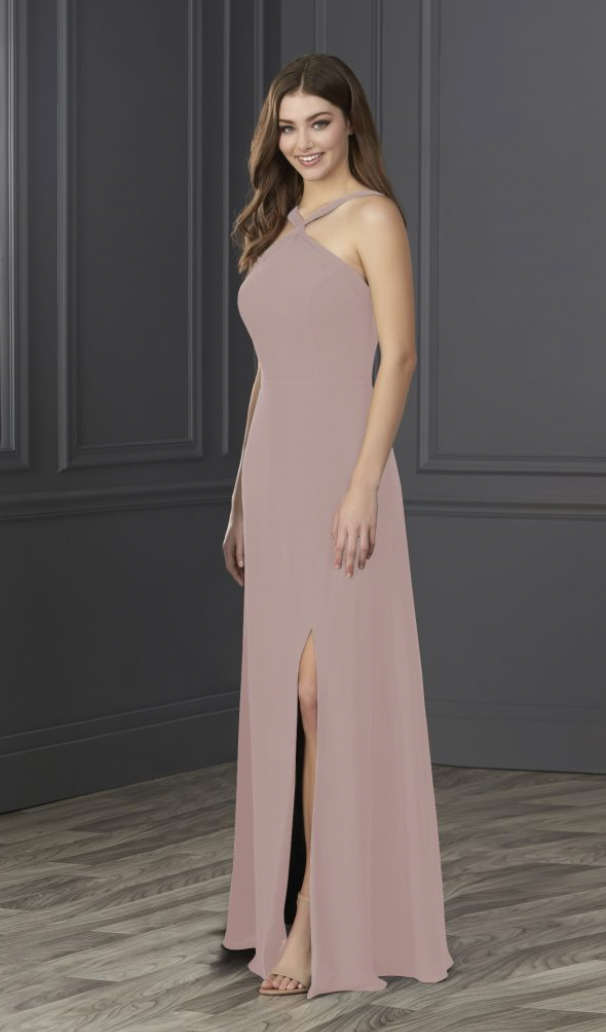 This chiffon halter is chic and sultry featuring an open back, slim A-line skirt, and a front skirt slit.