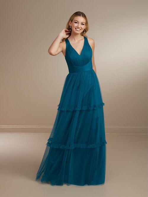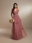 A dress your boho dreams are made of with its multi-tiered ruffle tulle A-line silhouette. The plisse tulle bodice features a V-neckline with tank-style straps that meet and close with self-cover buttons at the center back creating an open back statement.