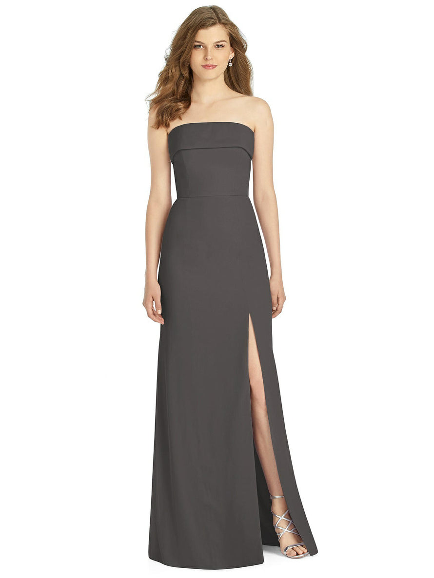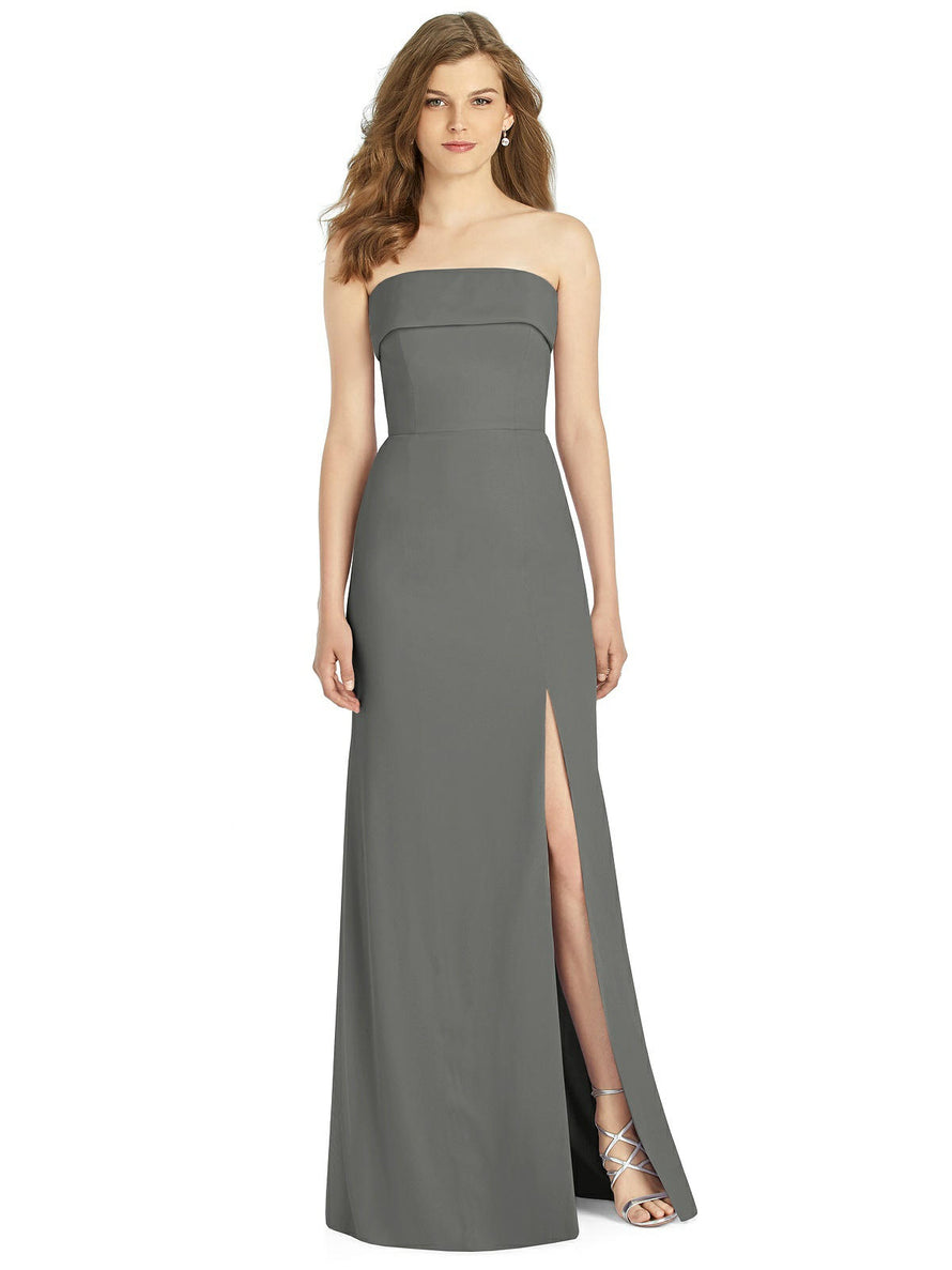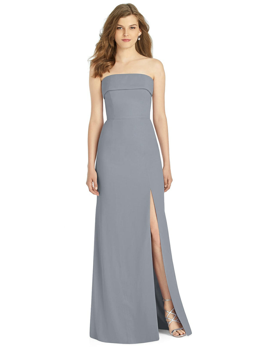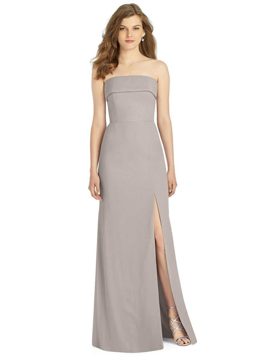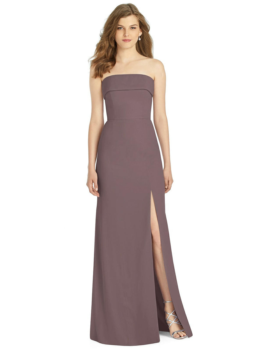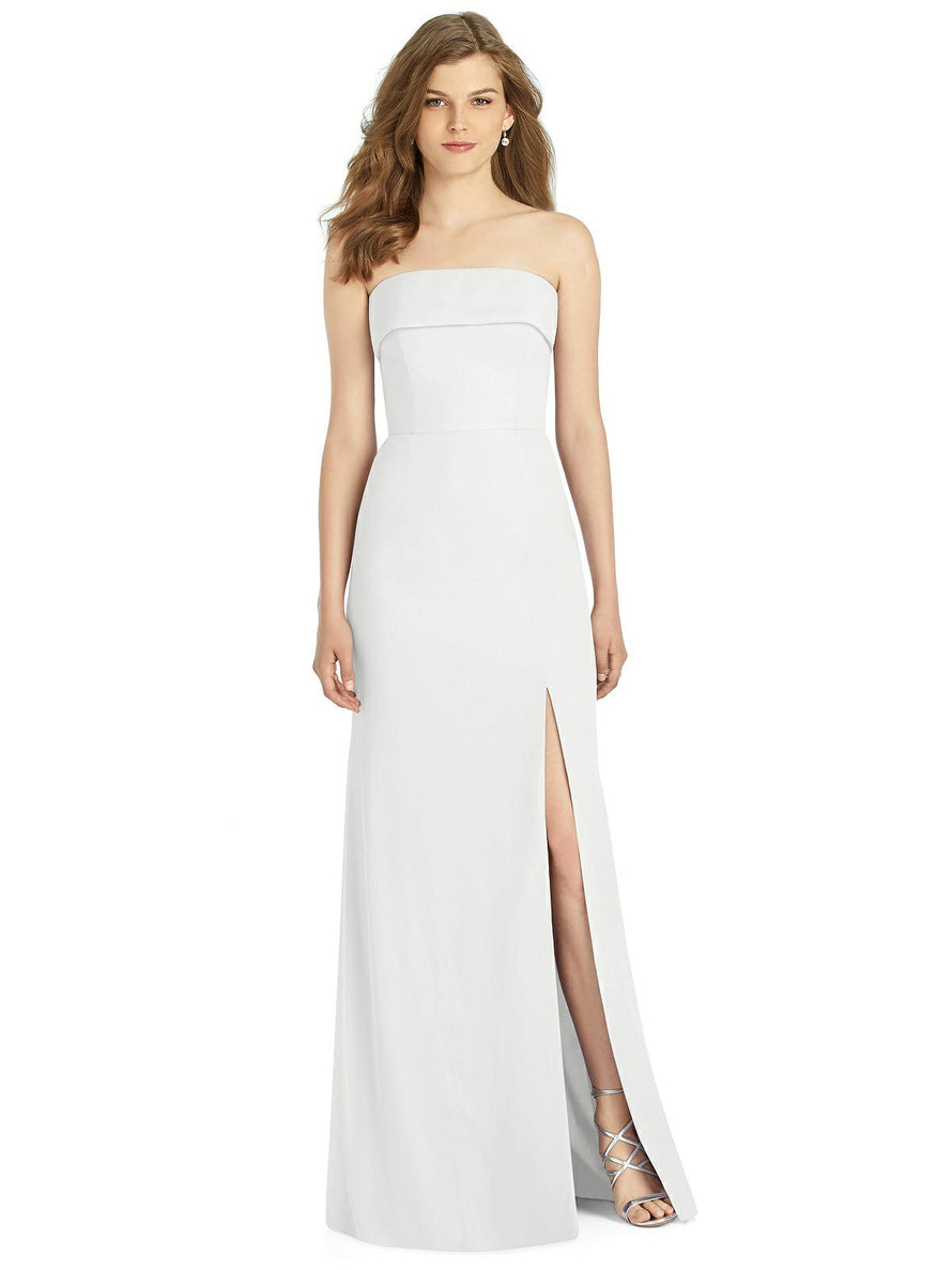 Gorgeous for a wedding or any formal occasion, this full-length strapless lux chiffon dress is a dramatic choice. A trumpet skirt features a thigh-high slit while the strapless neck is cuffed to add a hint of elegant detail to the bodice.