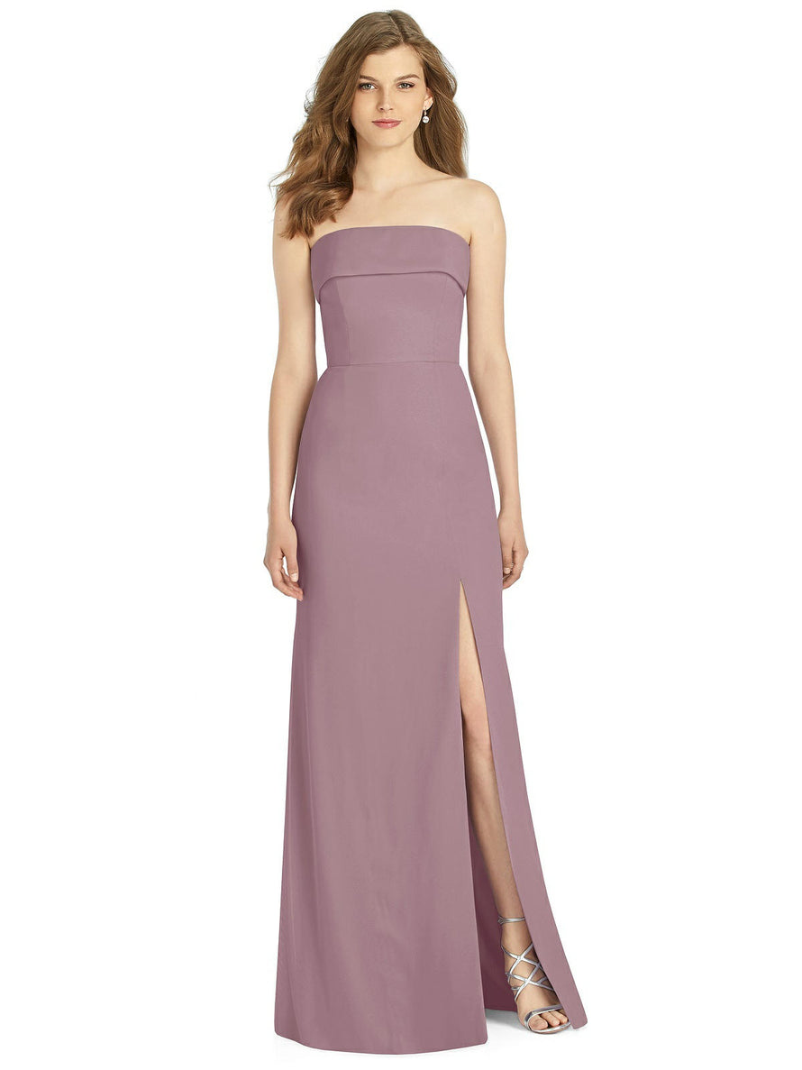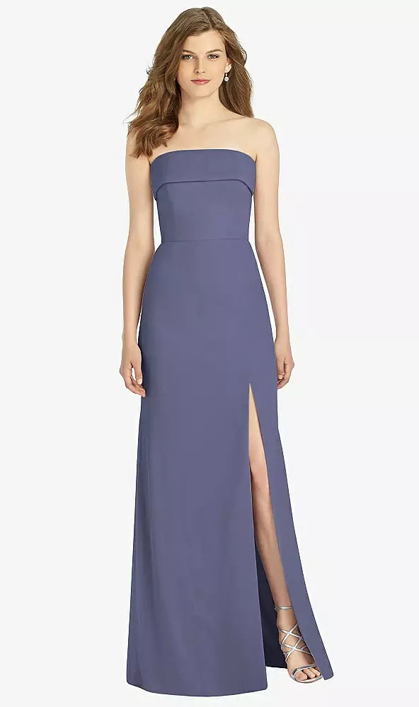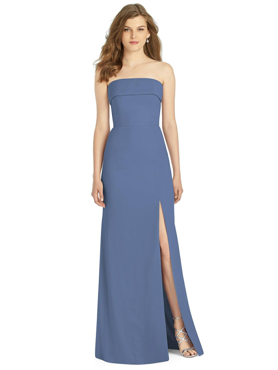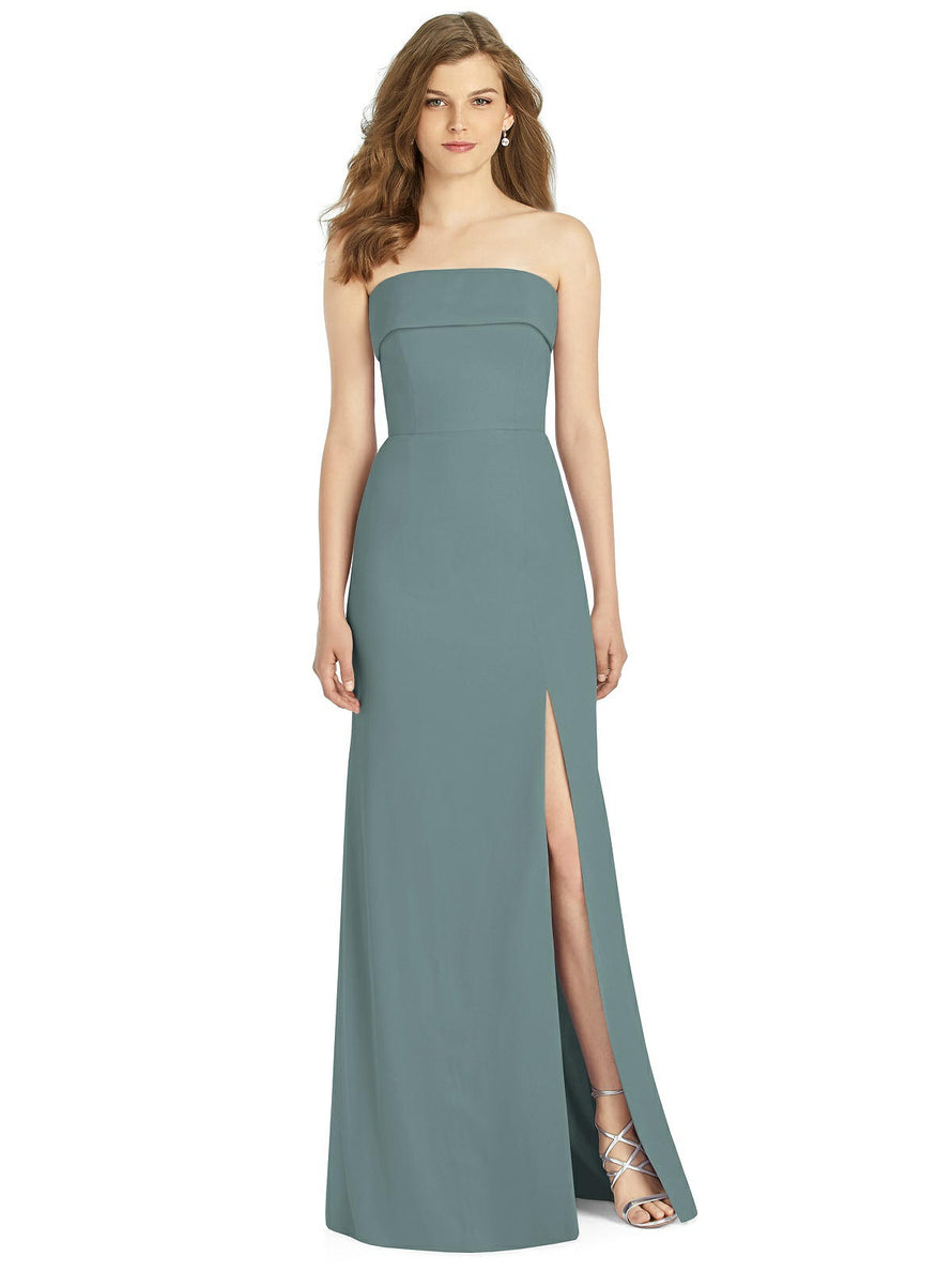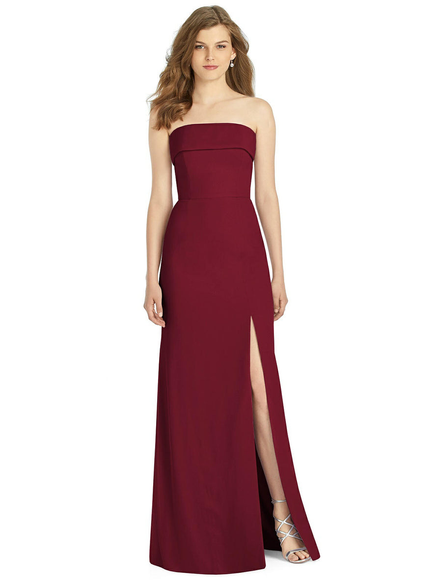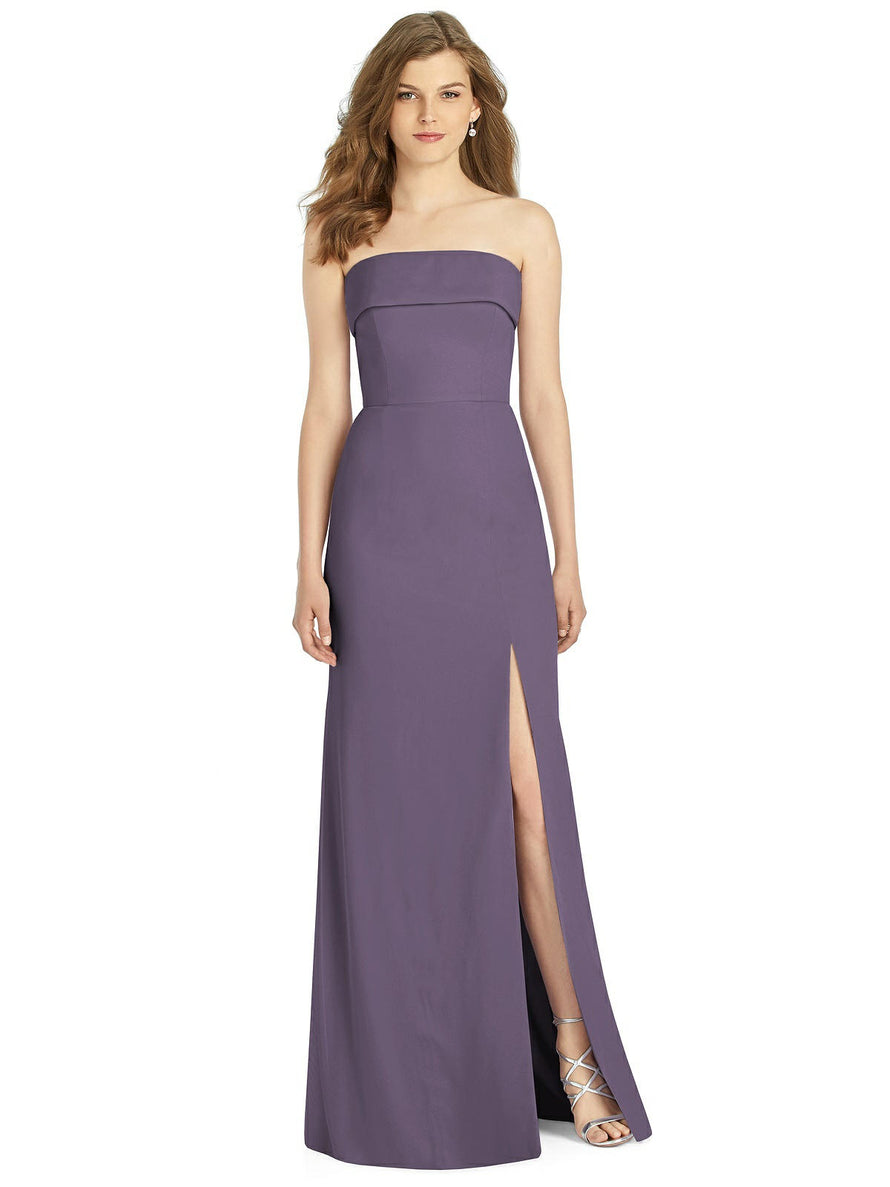 Gorgeous for a wedding or any formal occasion, this full-length strapless lux chiffon dress is a dramatic choice. A trumpet skirt features a thigh-high slit while the strapless neck is cuffed to add a hint of elegant detail to the bodice.