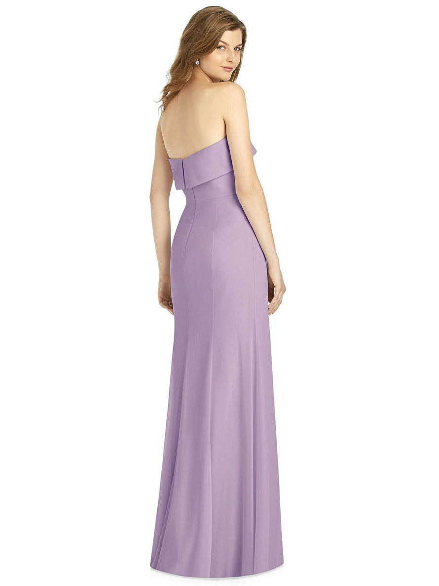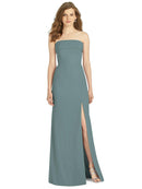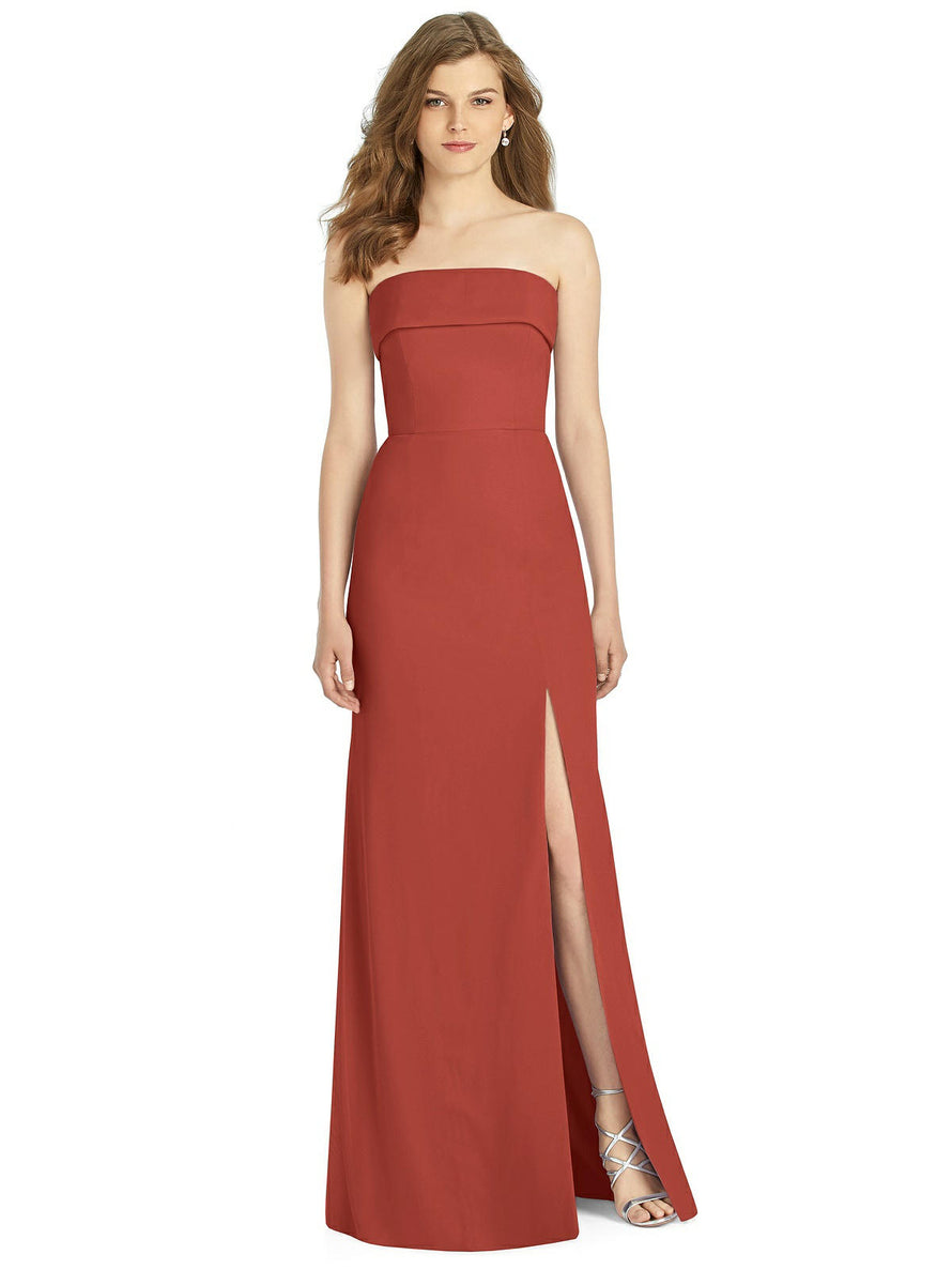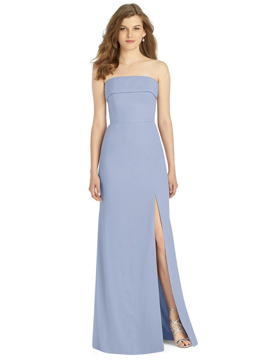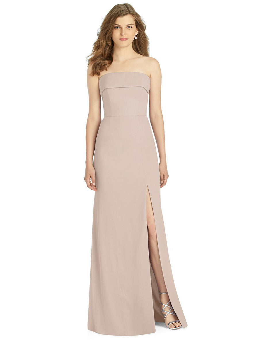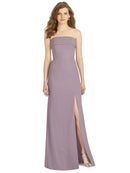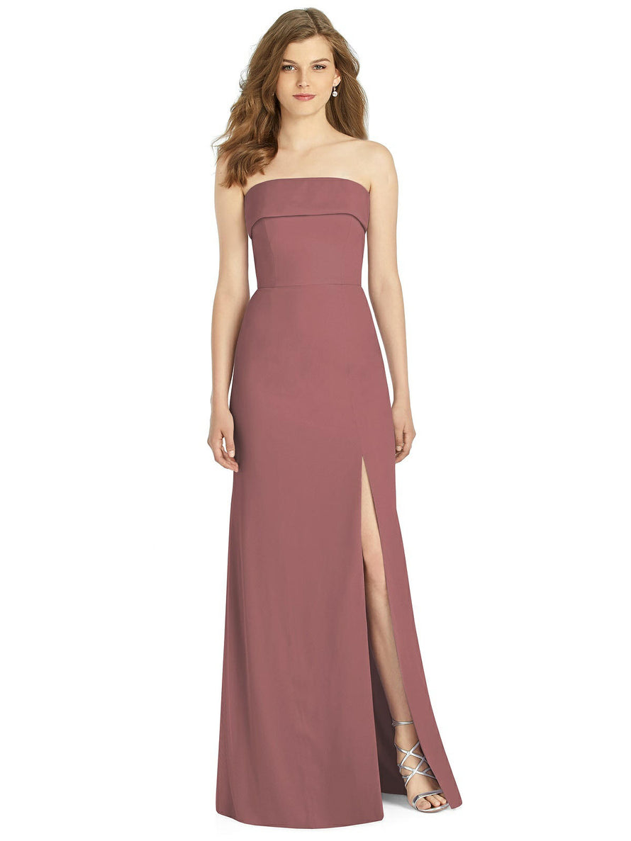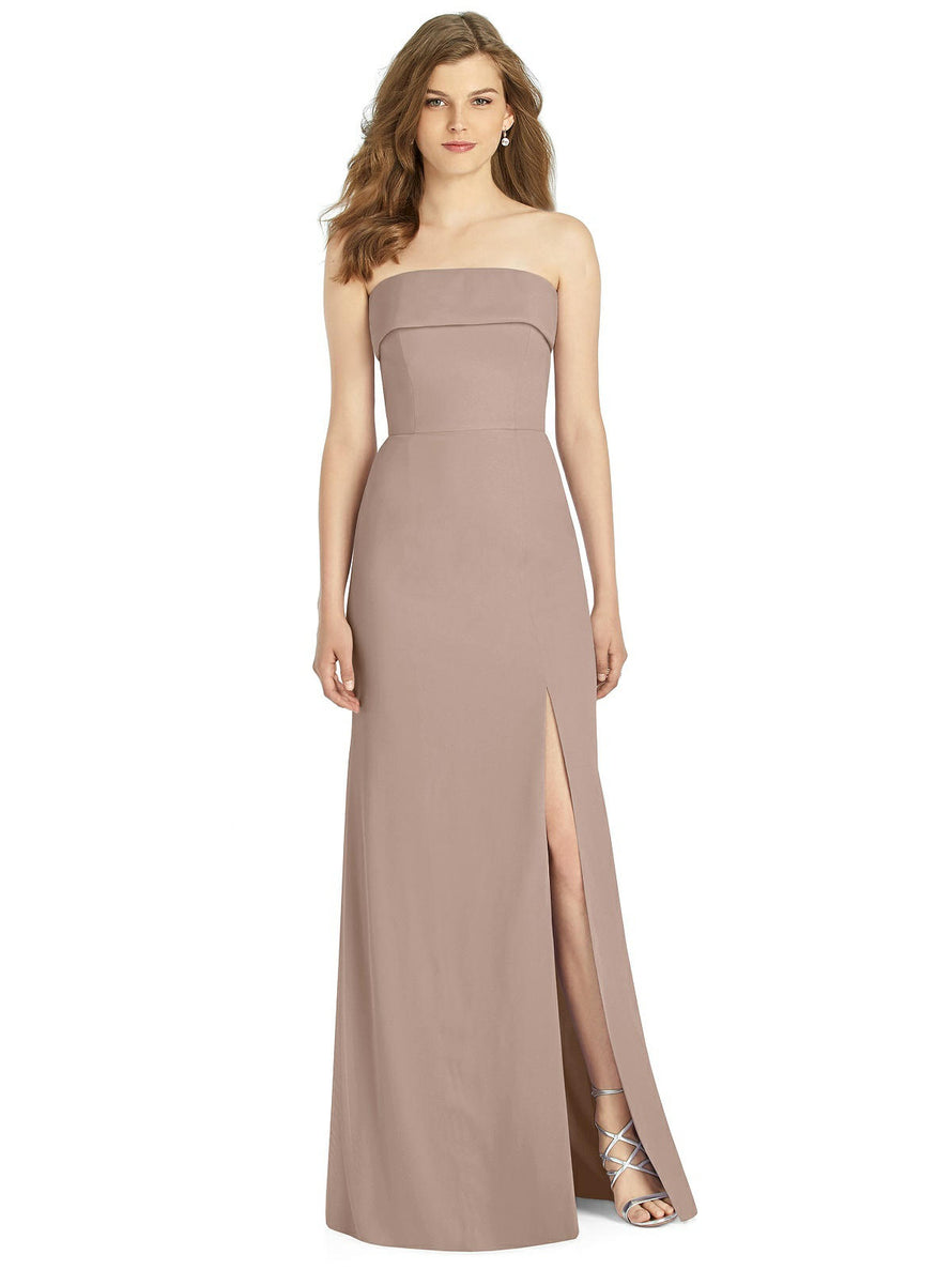 Gorgeous for a wedding or any formal occasion, this full-length strapless lux chiffon dress is a dramatic choice. A trumpet skirt features a thigh-high slit while the strapless neck is cuffed to add a hint of elegant detail to the bodice.