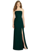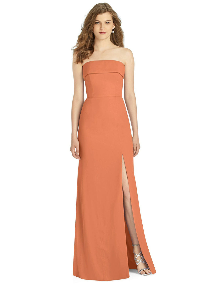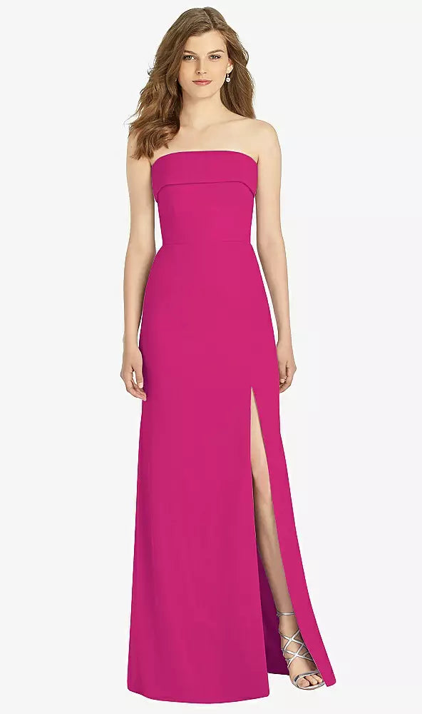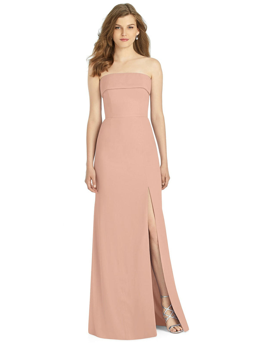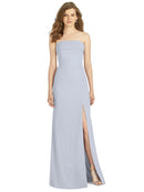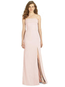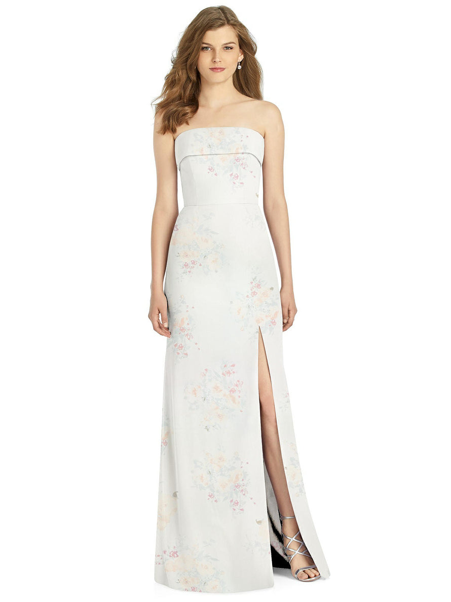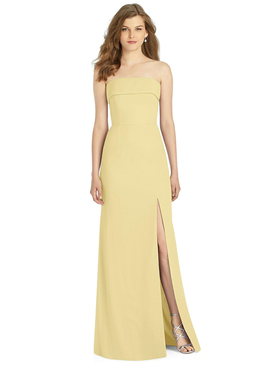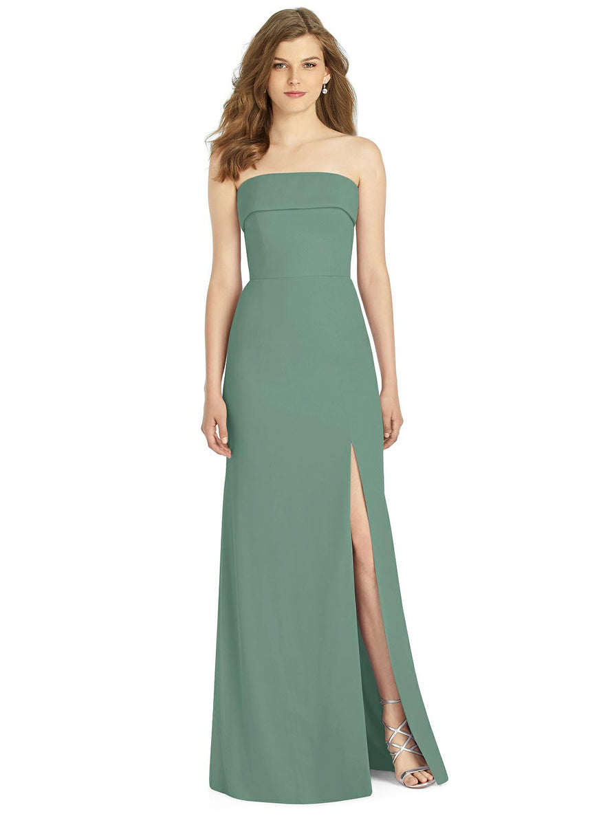 Gorgeous for a wedding or any formal occasion, this full-length strapless lux chiffon dress is a dramatic choice. A trumpet skirt features a thigh-high slit while the strapless neck is cuffed to add a hint of elegant detail to the bodice.