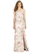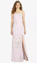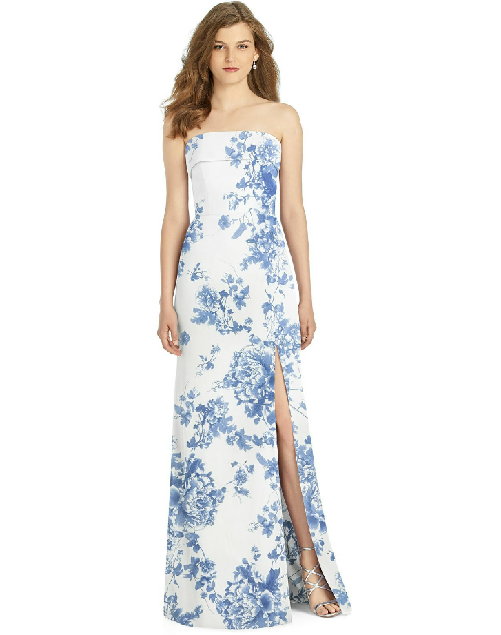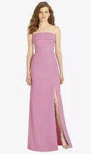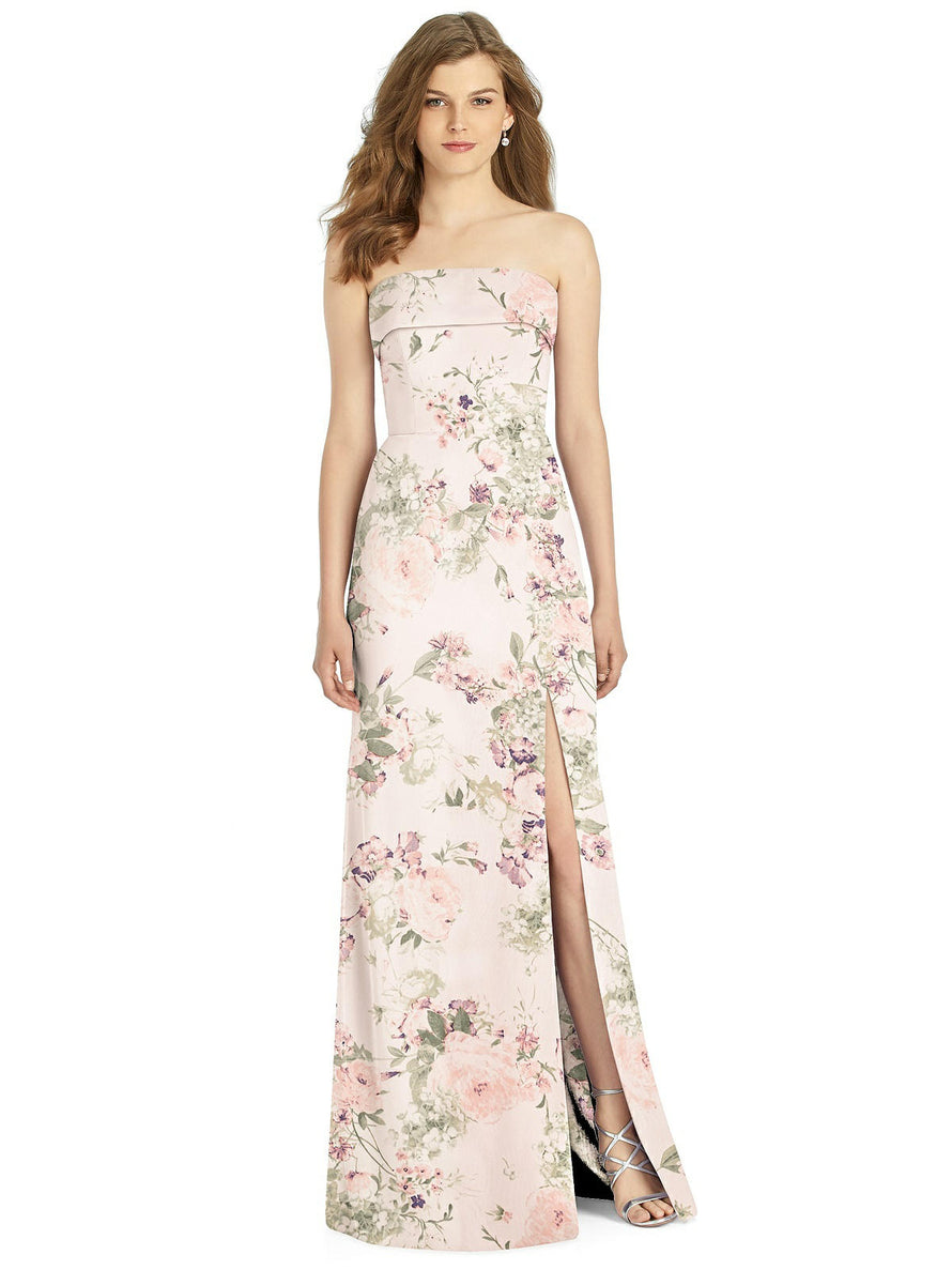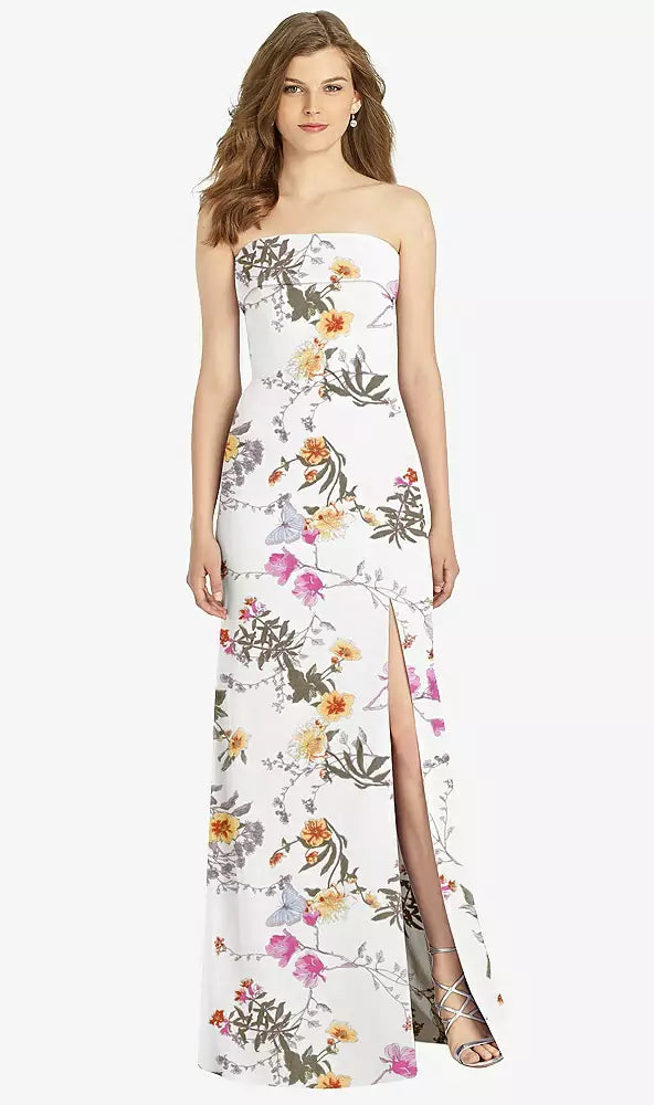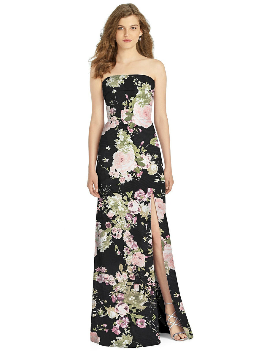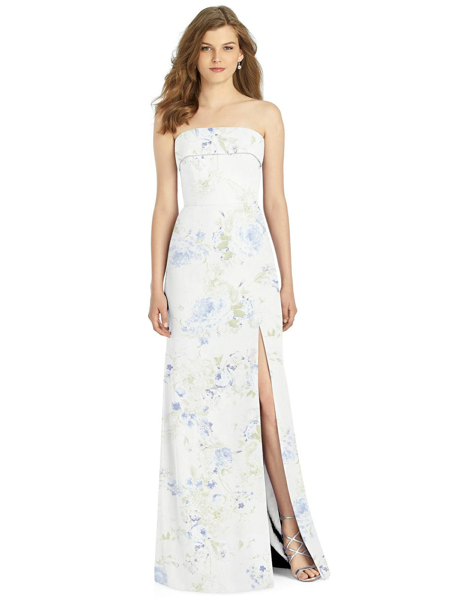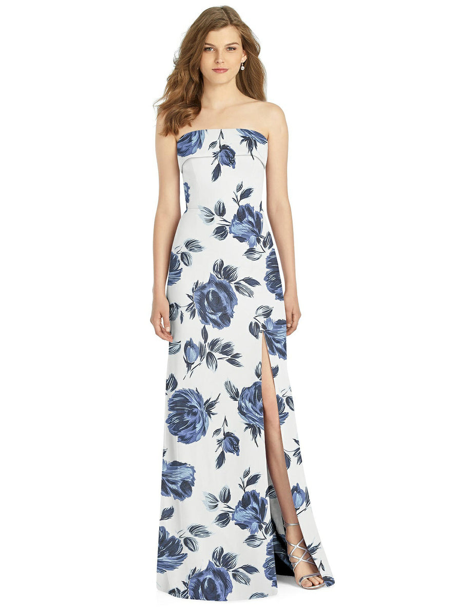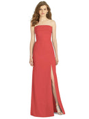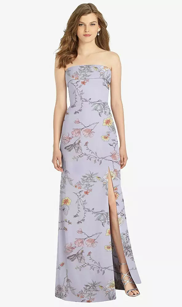 Gorgeous for a wedding or any formal occasion, this full-length strapless lux chiffon dress is a dramatic choice. A trumpet skirt features a thigh-high slit while the strapless neck is cuffed to add a hint of elegant detail to the bodice.