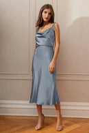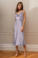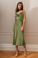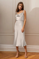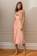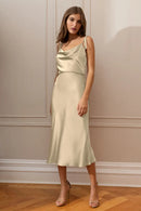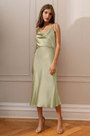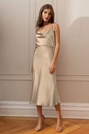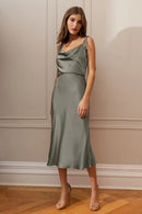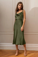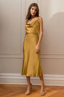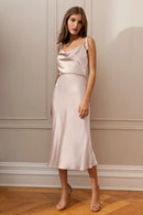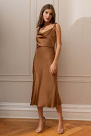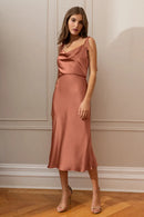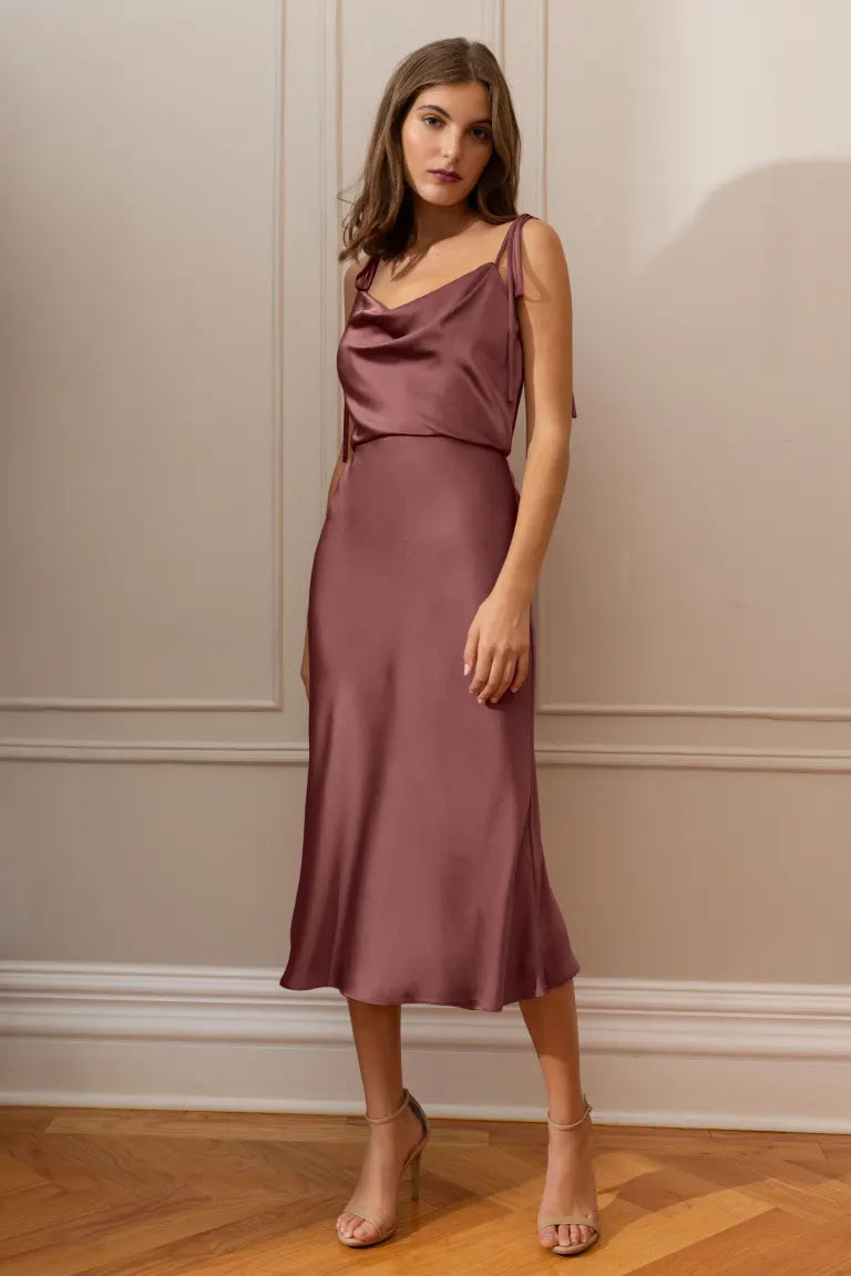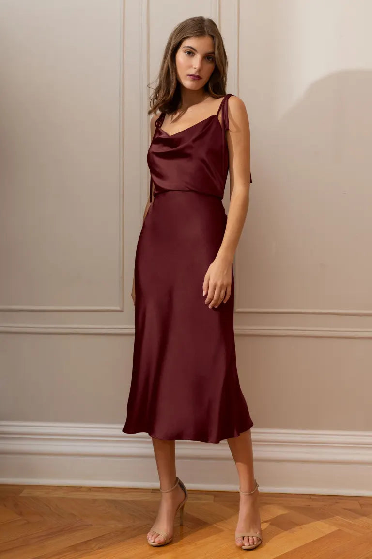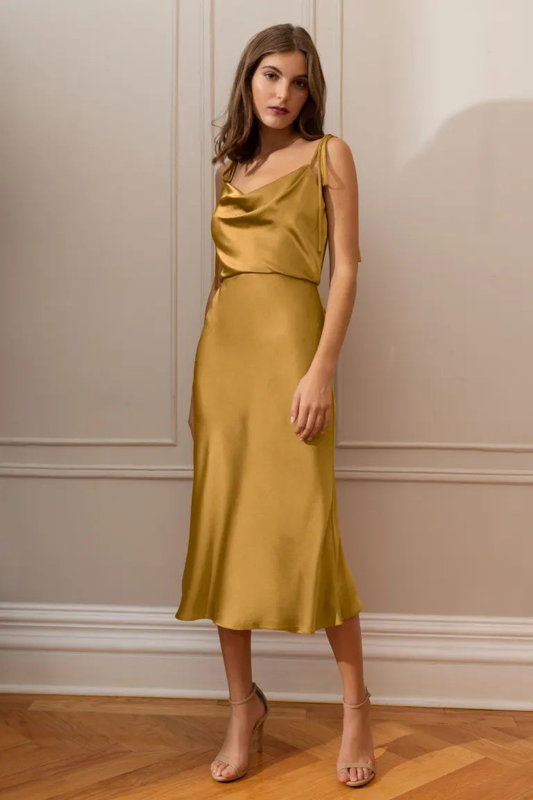 The Kat dress exudes an effortless romantic vibe with its delicate spaghetti straps that can be tied at the shoulders to customize the fit and add a feminine touch. The gentle cowl neckline and subtle blouson waist create a relaxed, easygoing look, while the bias-cut skirt gracefully drapes over your figure, ensuring a flattering fit.