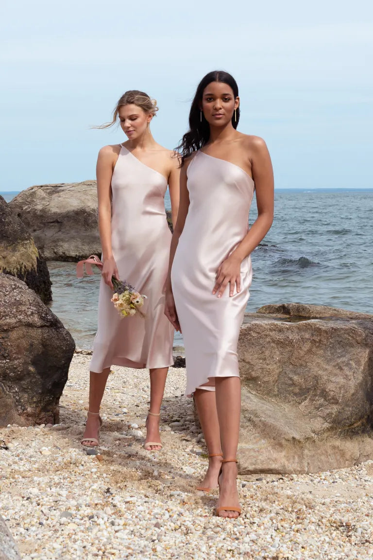 The Abby one-shoulder midi dress offers a sleek and contemporary twist on the classic slip silhouette. With its modern asymmetrical one-shoulder neckline and the luxurious satin fabric cut on the bias, this dress elegantly drapes over your curves, providing an effortlessly flattering fit.