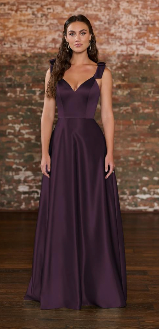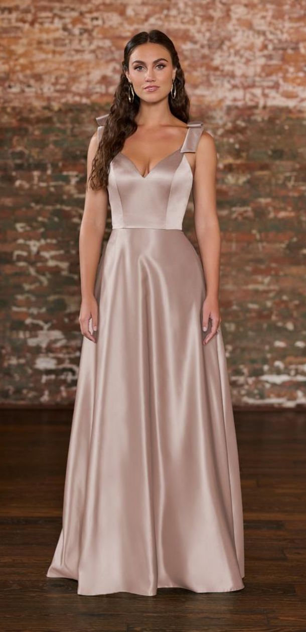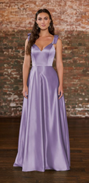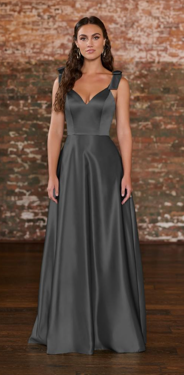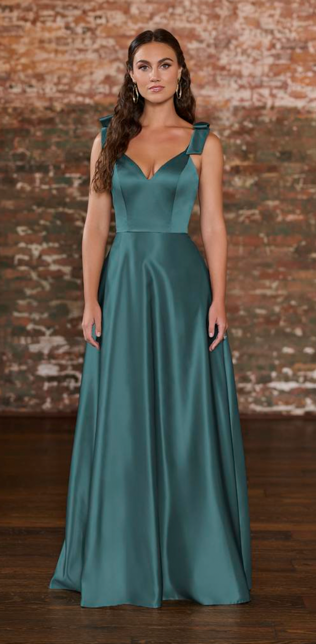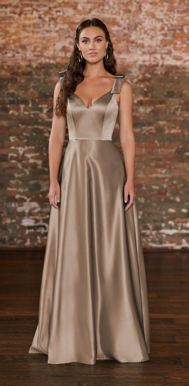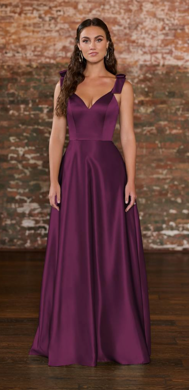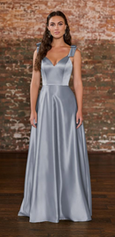 This satin gown features a sweetheart neckline with tailored bows at the shoulders and a full, A-line skirt.