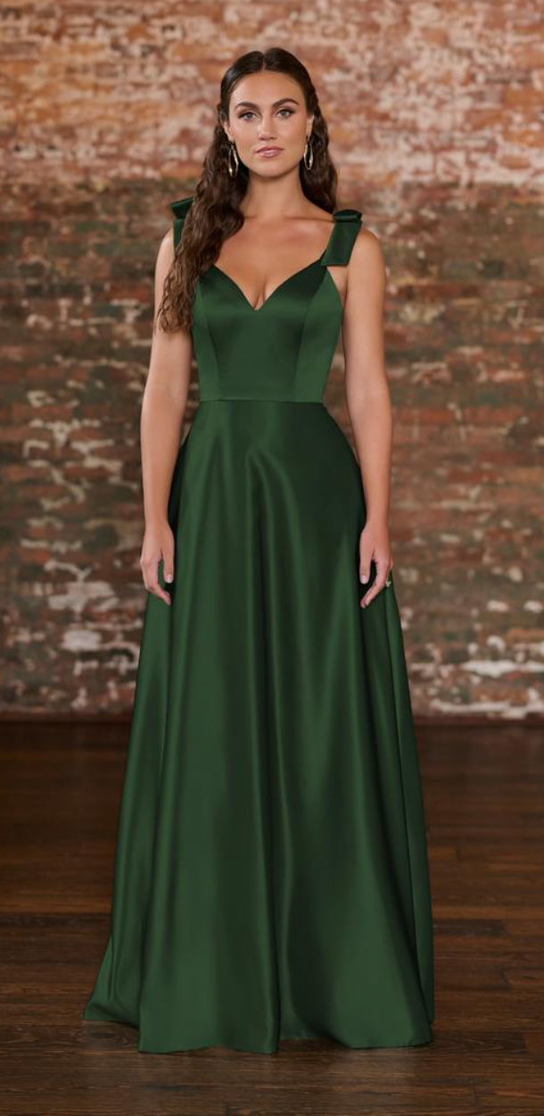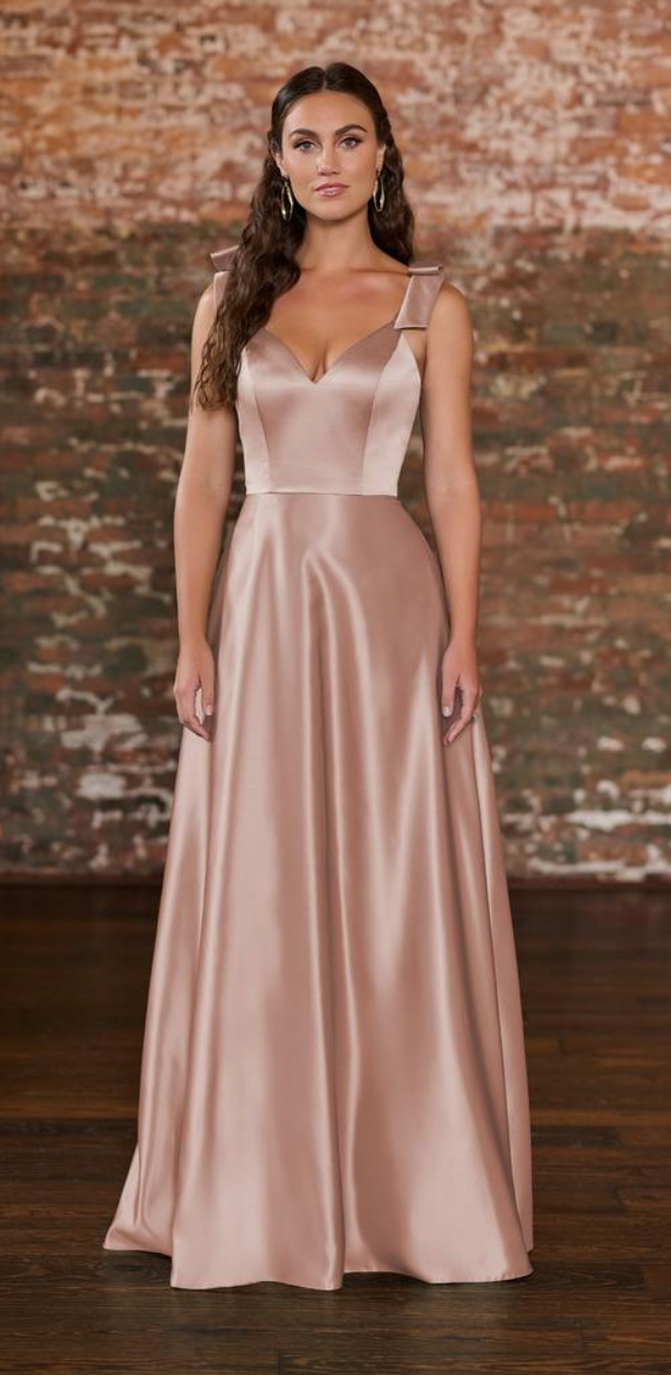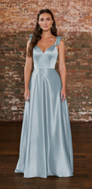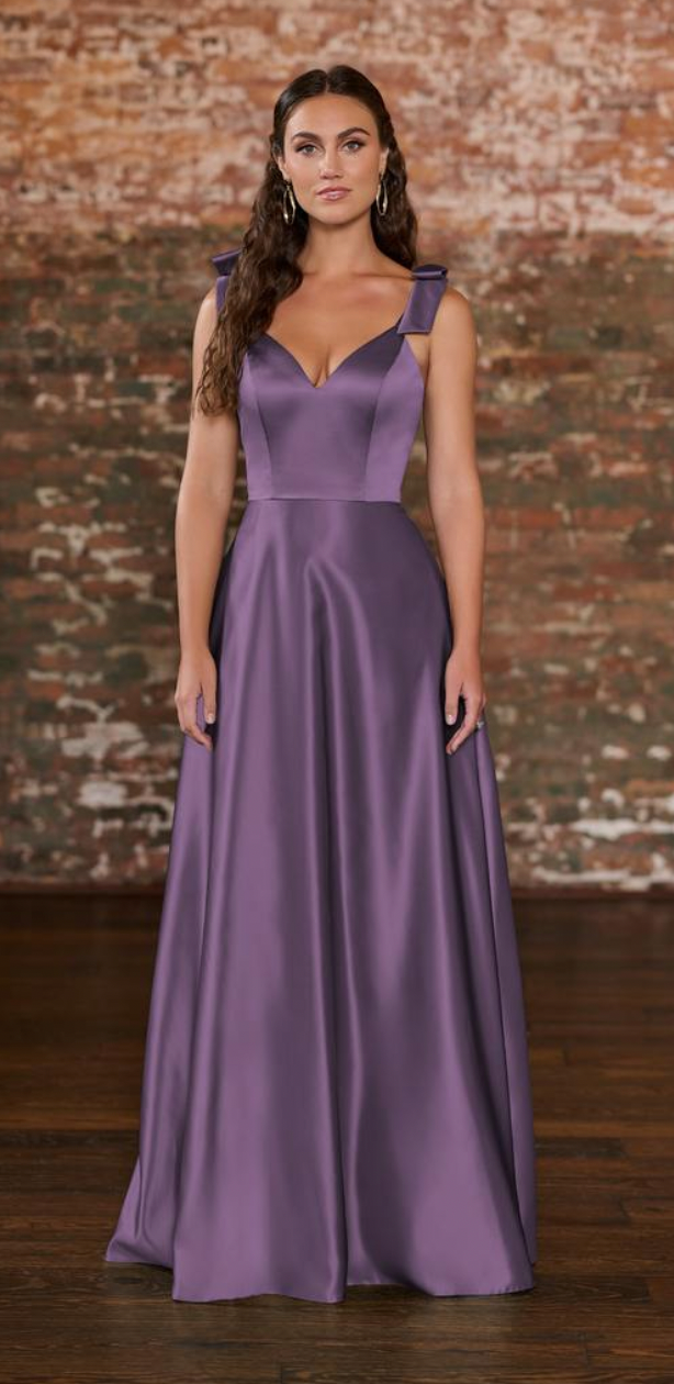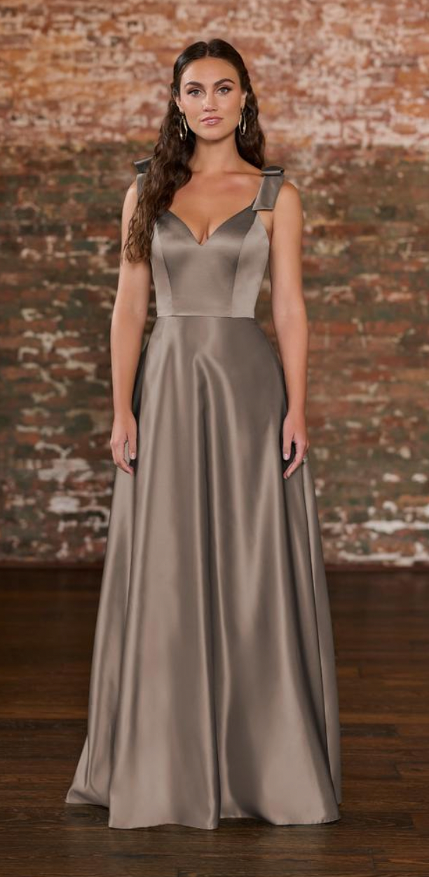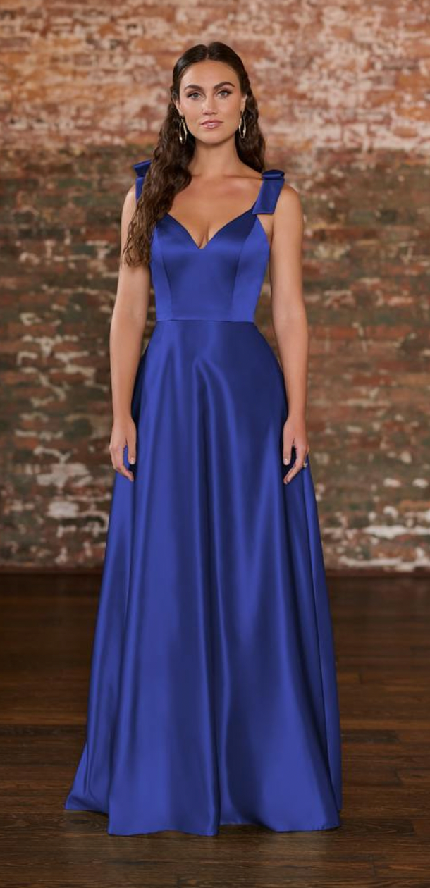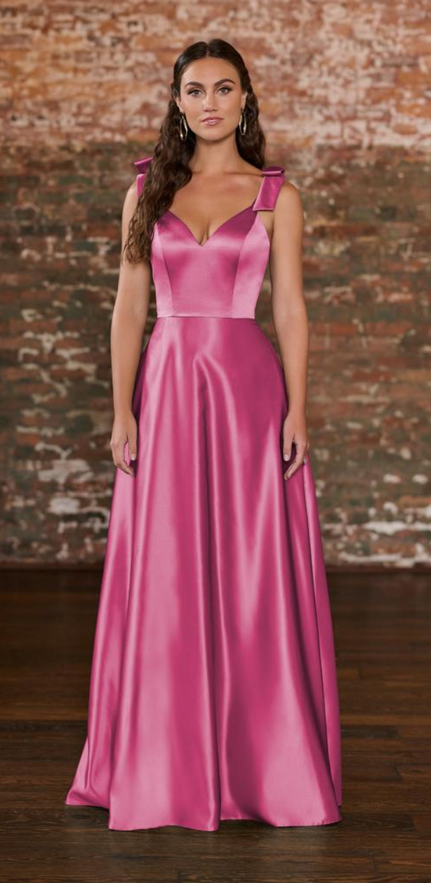 This satin gown features a sweetheart neckline with tailored bows at the shoulders and a full, A-line skirt.