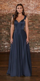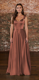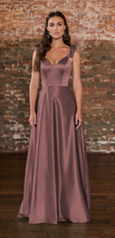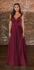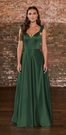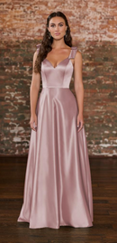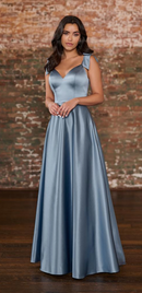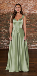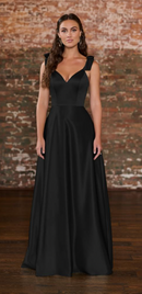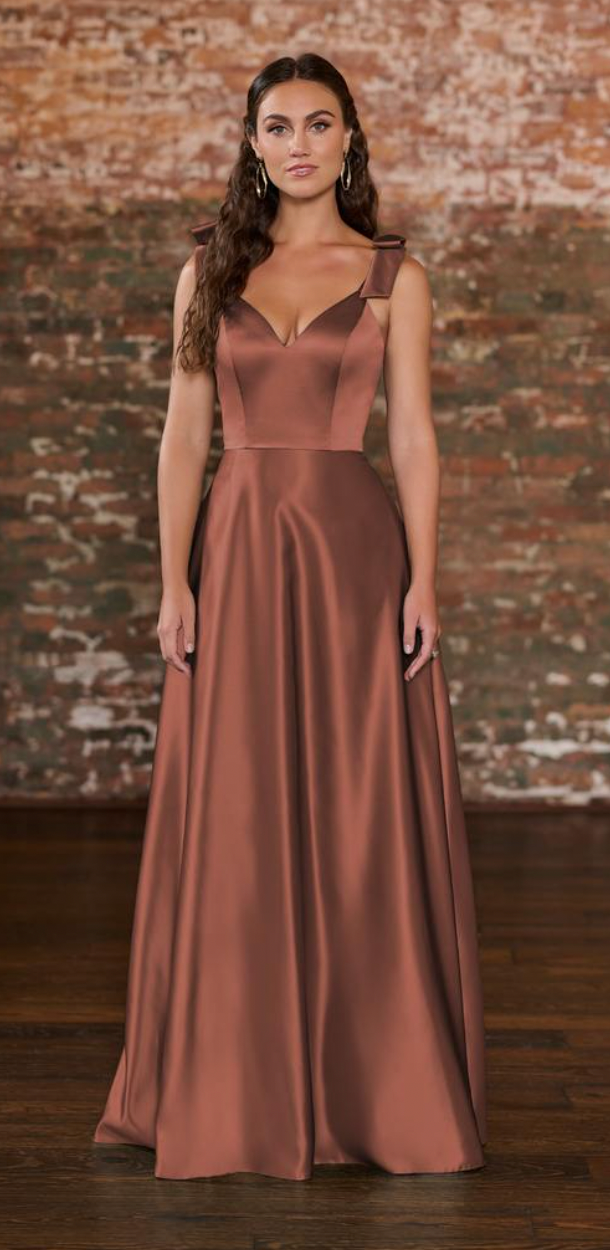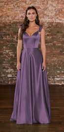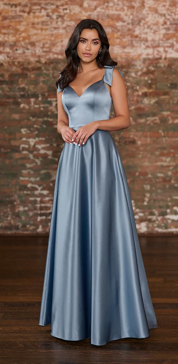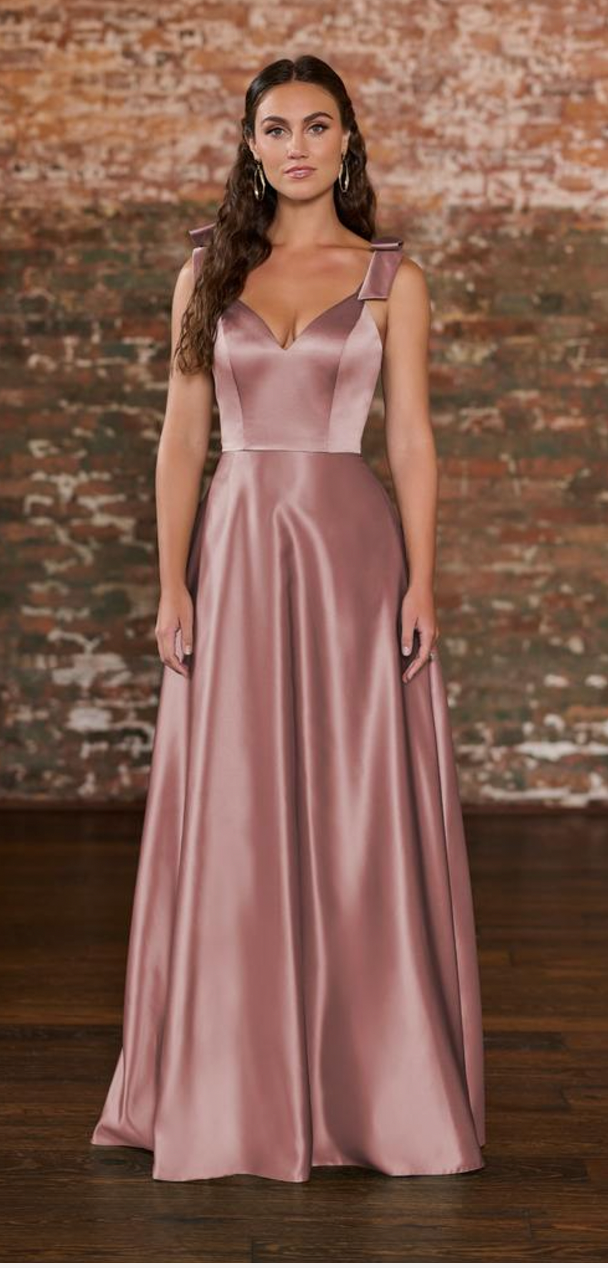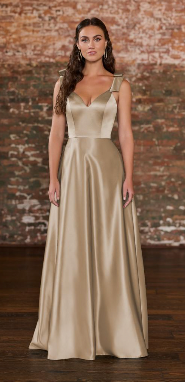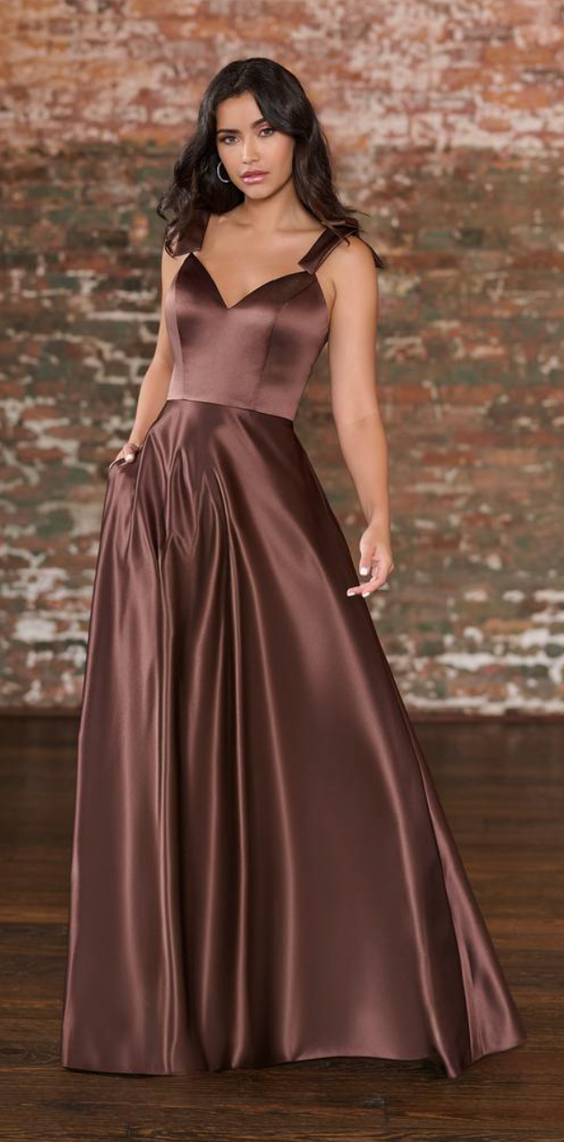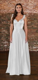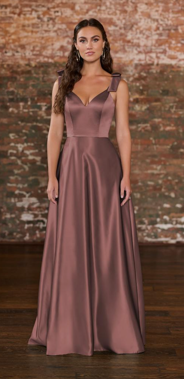 This satin gown features a sweetheart neckline with tailored bows at the shoulders and a full, A-line skirt.