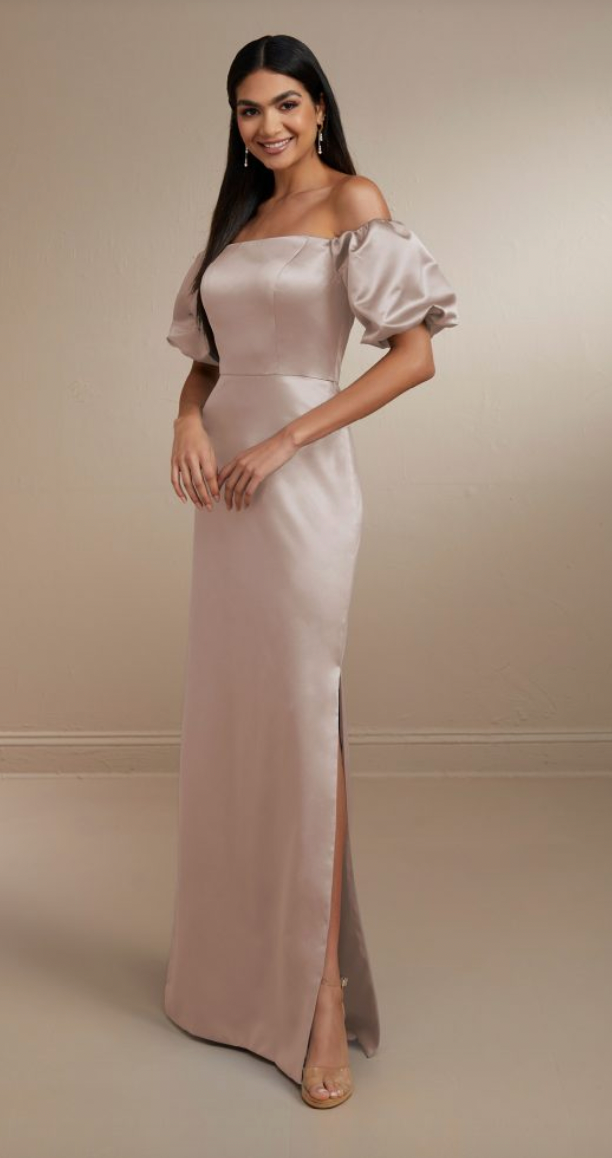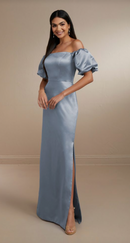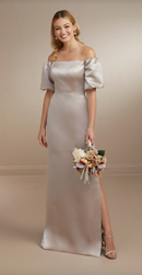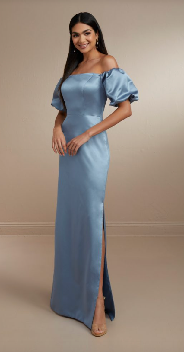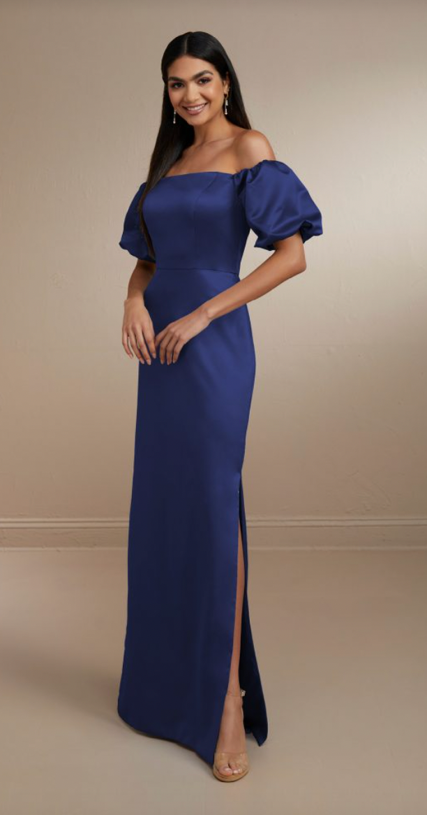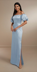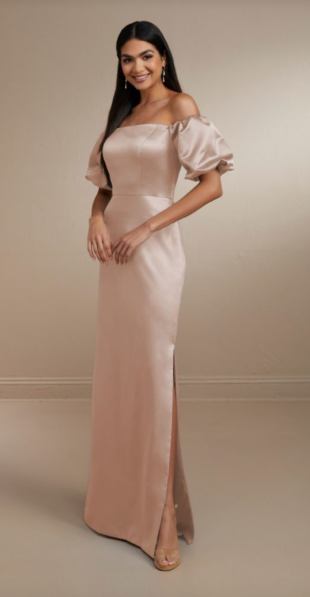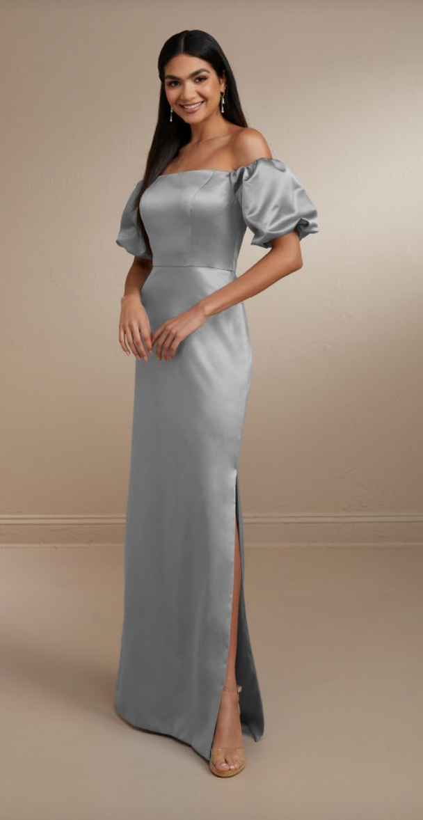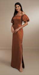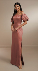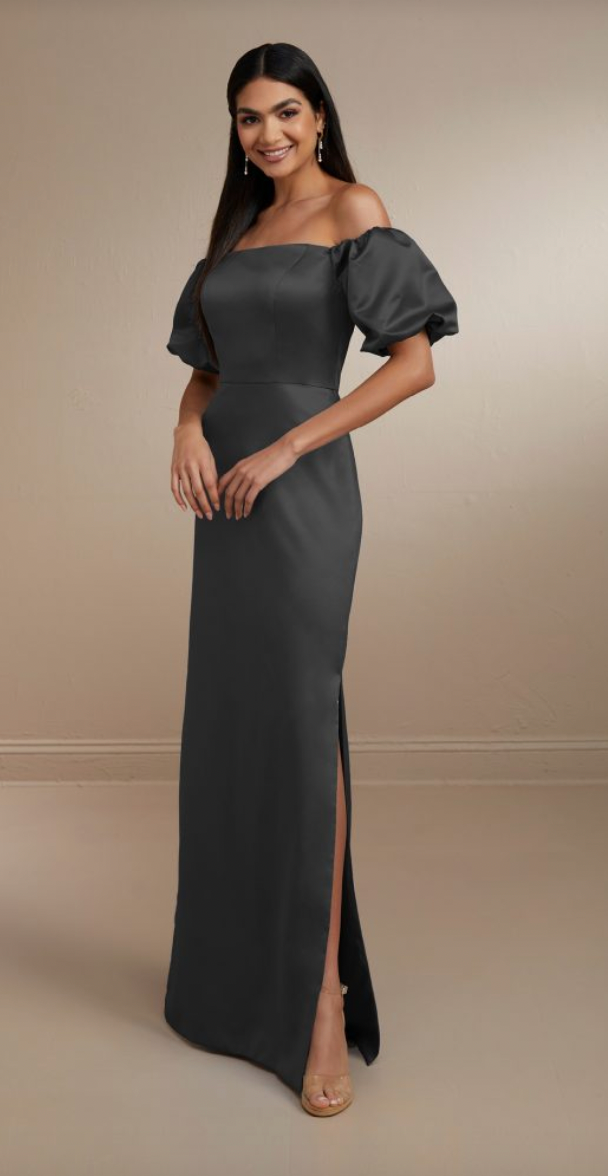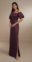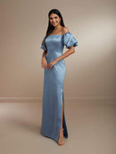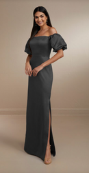Class and chic this strapless satin sheath gown features adjustable puffed sleeves and a natural waist seam. The addition of double slide slits on the column skirt is sure to up your fashion statement.