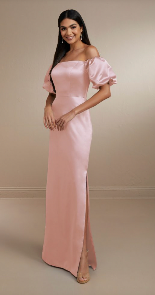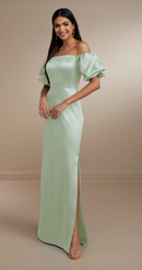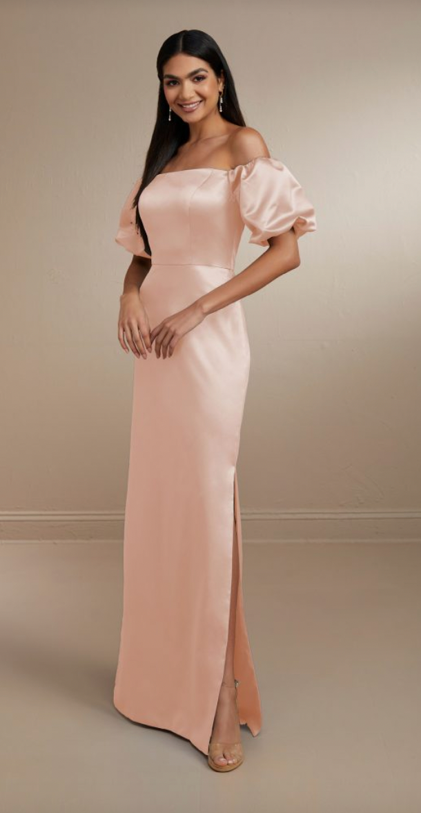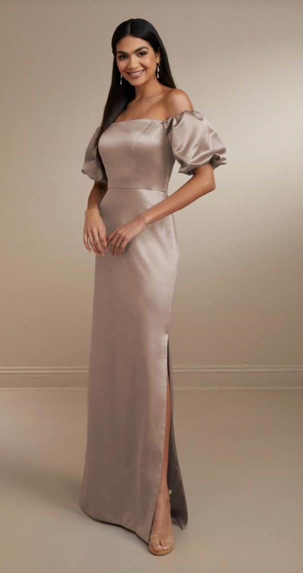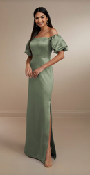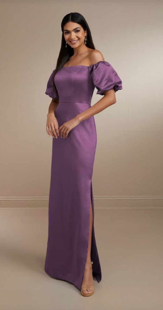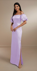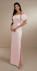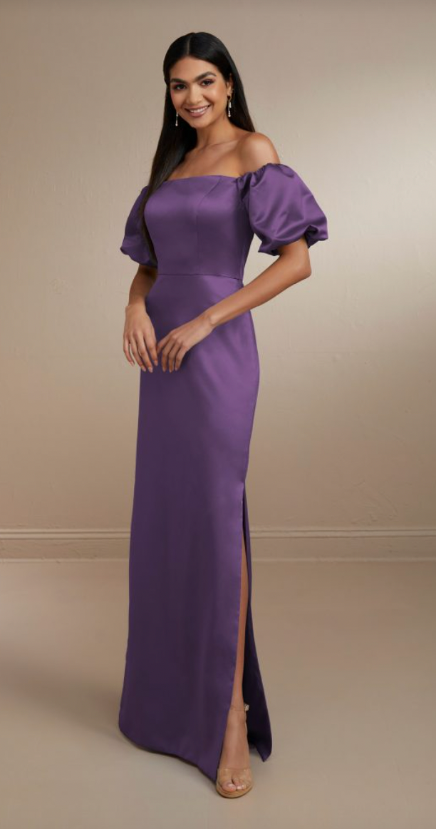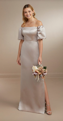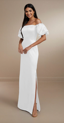Class and chic this strapless satin sheath gown features adjustable puffed sleeves and a natural waist seam. The addition of double slide slits on the column skirt is sure to up your fashion statement.