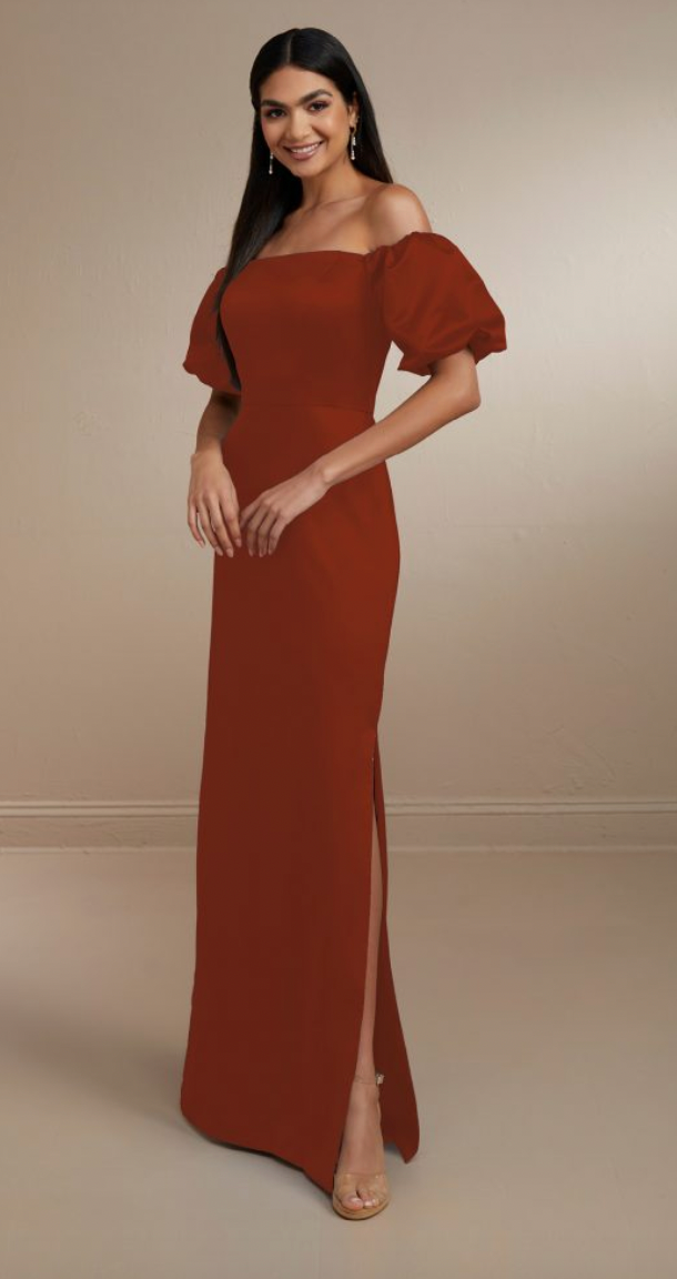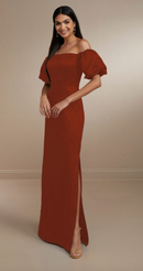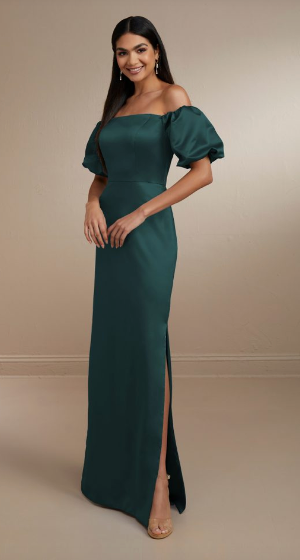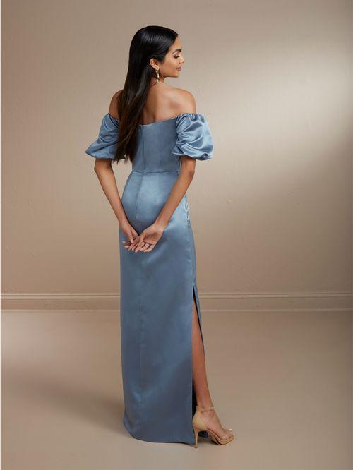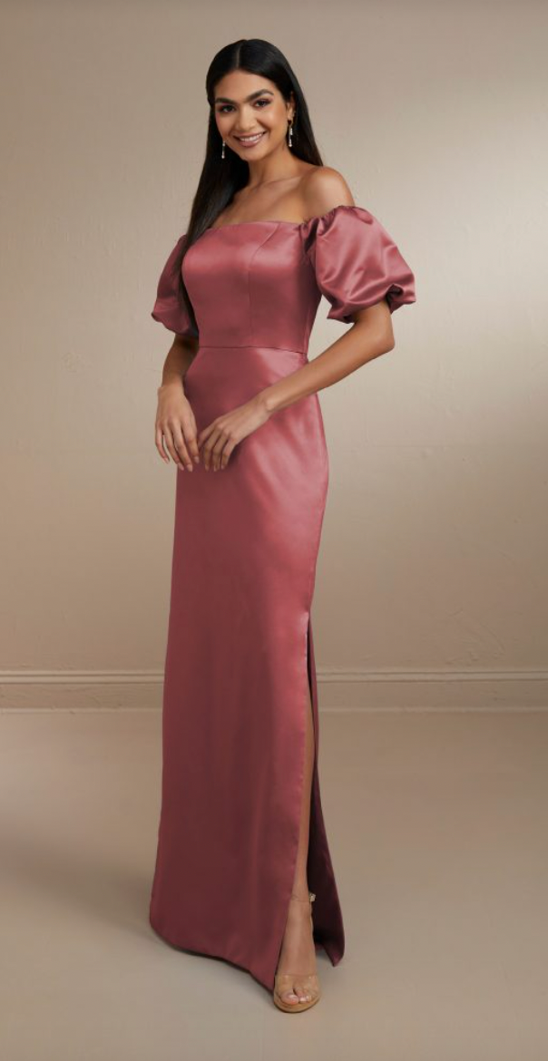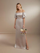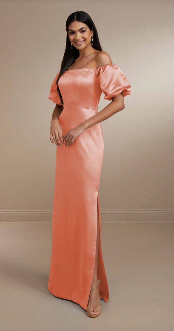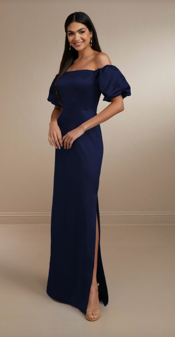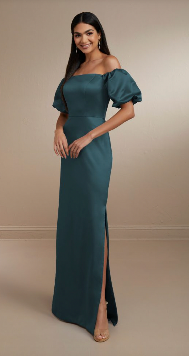 Class and chic this strapless satin sheath gown features adjustable puffed sleeves and a natural waist seam. The addition of double slide slits on the column skirt is sure to up your fashion statement.