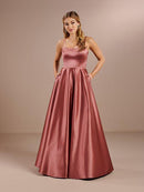 Satin scoop neckline with spaghetti straps features a fitted bodice, an A-line skirt with modern side slit pockets and an asymmetrical back bow.