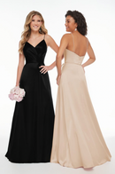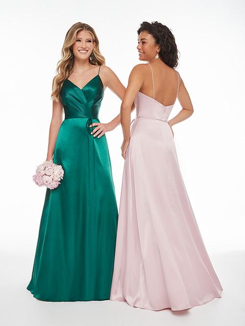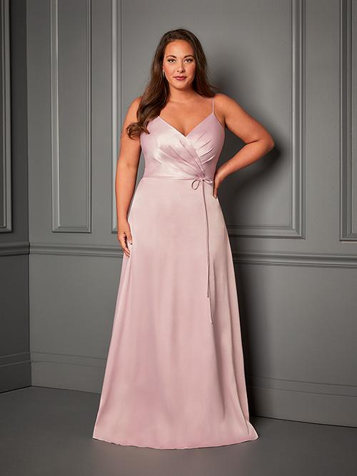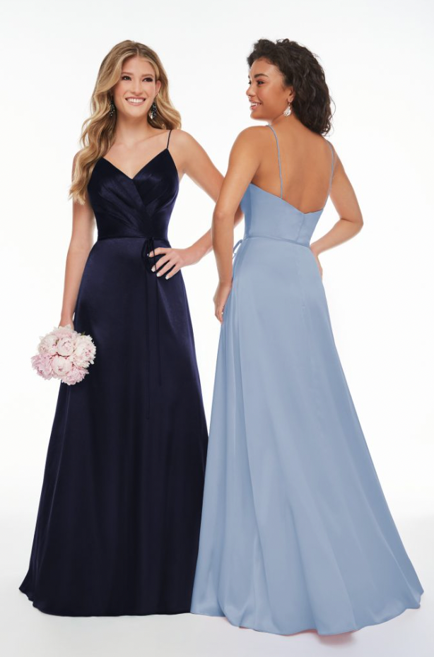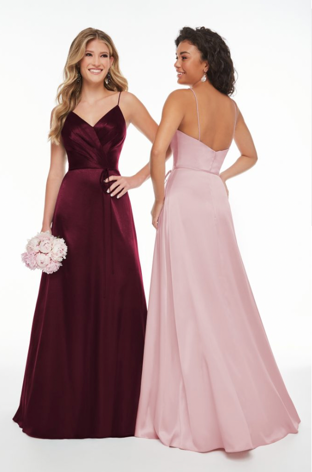 This gown features a surplice neckline that flatters and wraps around the bodice. It is made of our new slipper satin and lined in stretch jersey for added comfort.