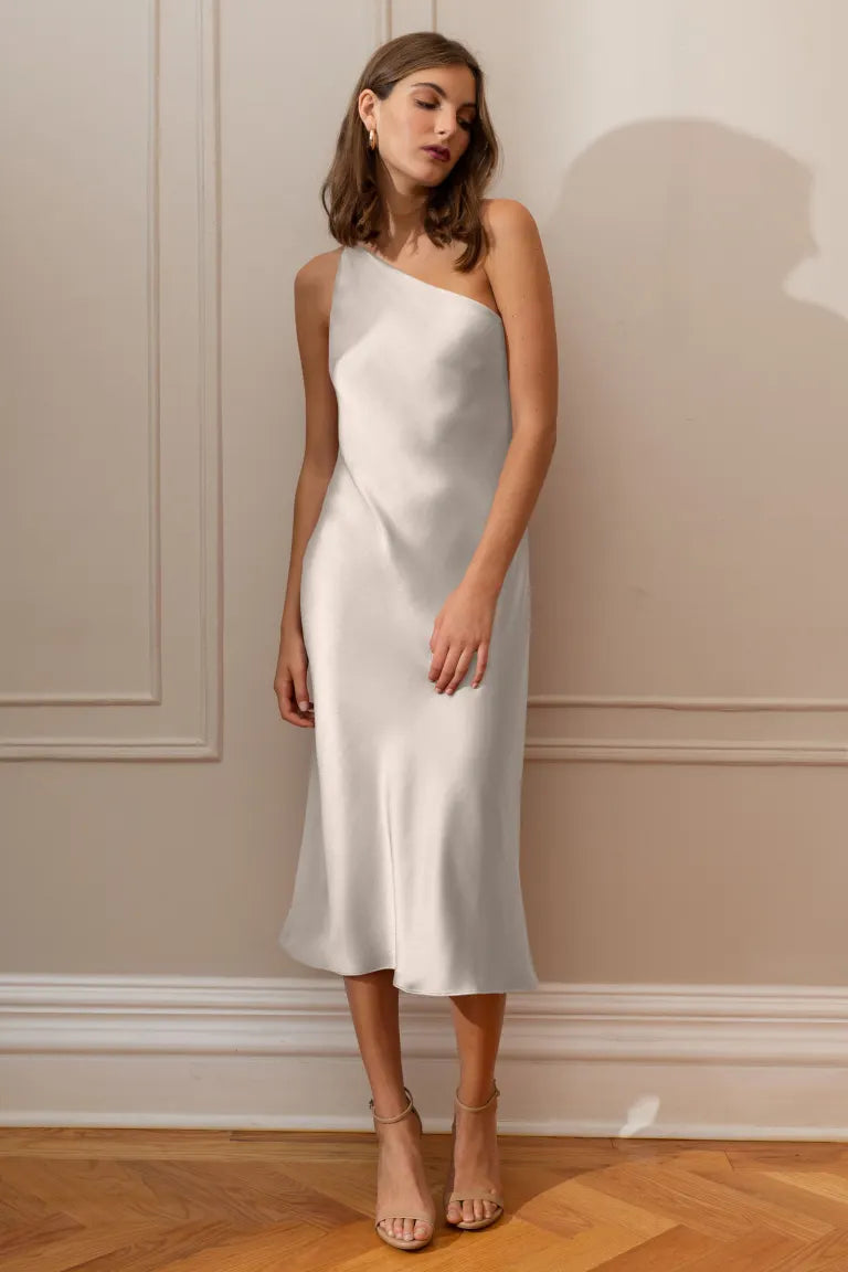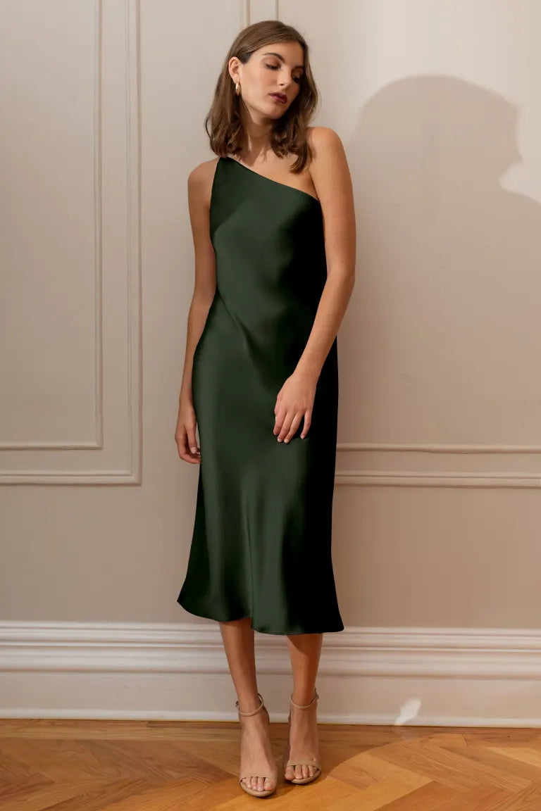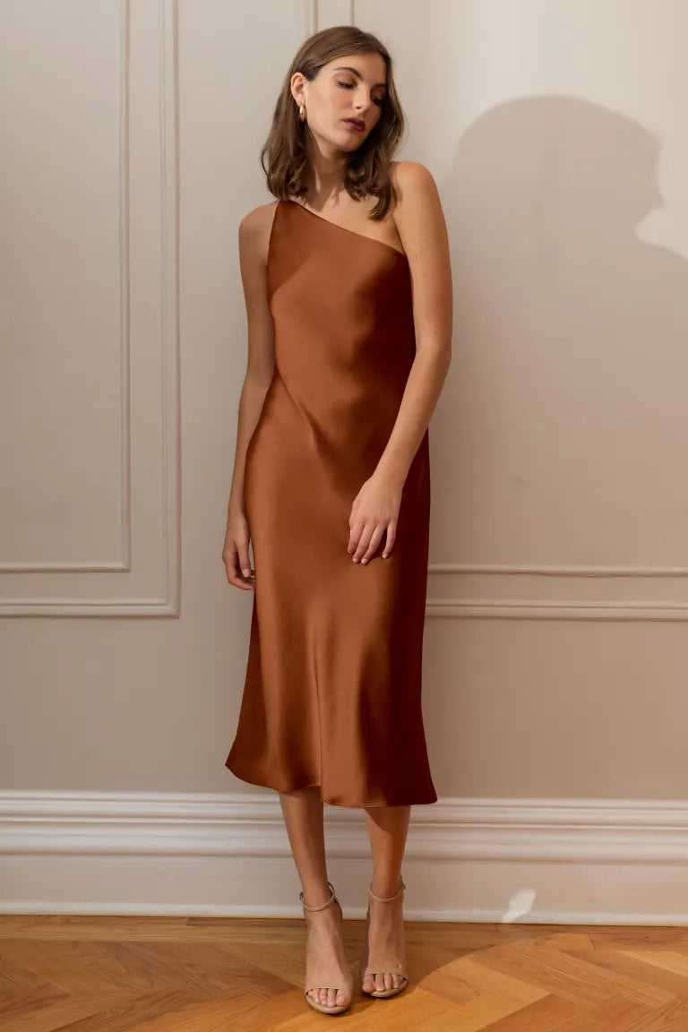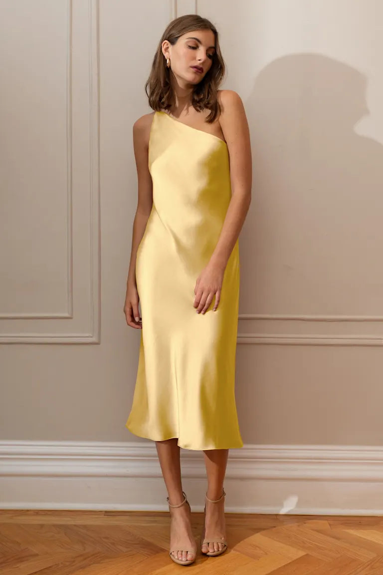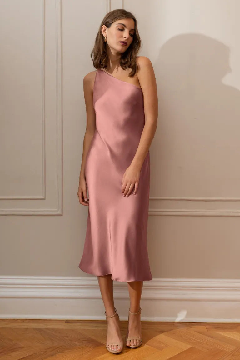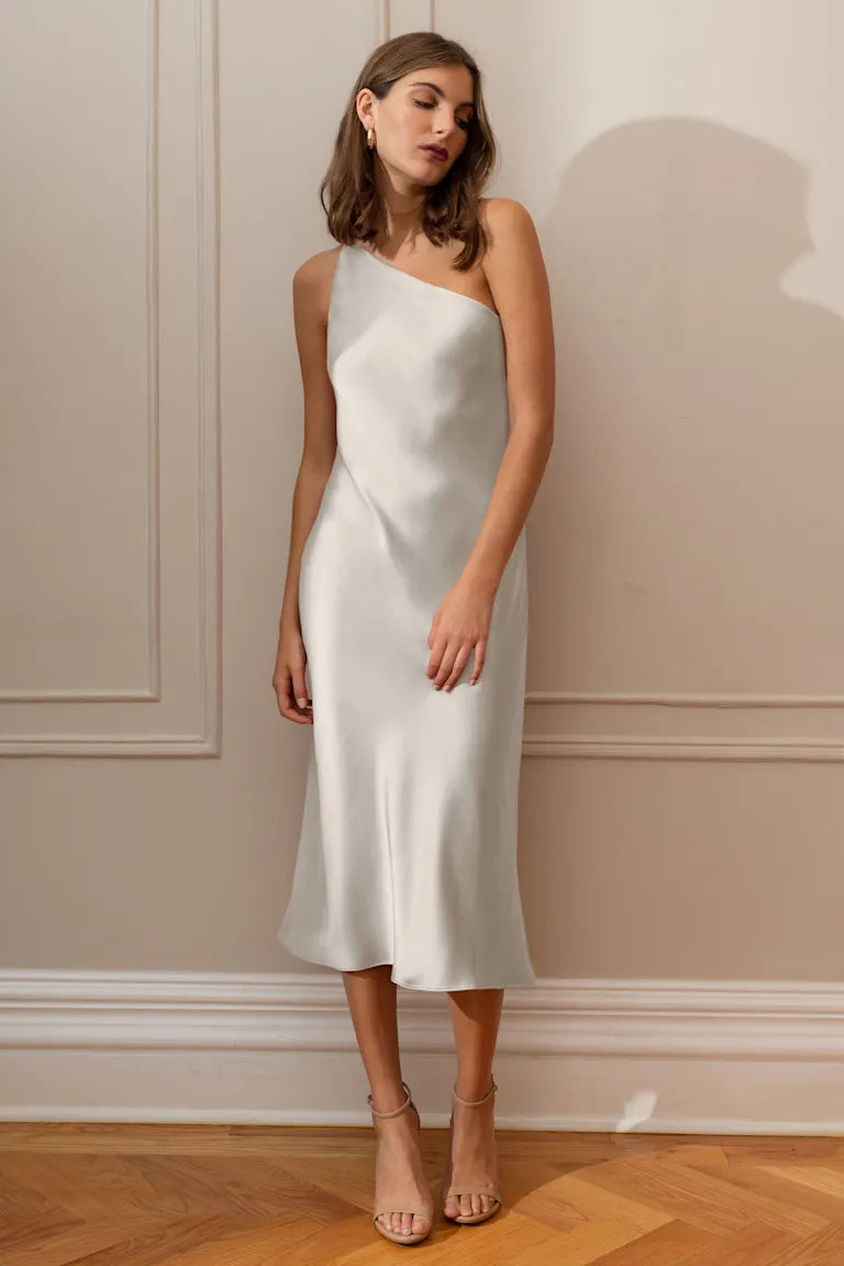 The Abby one-shoulder midi dress offers a sleek and contemporary twist on the classic slip silhouette. With its modern asymmetrical one-shoulder neckline and the luxurious satin fabric cut on the bias, this dress elegantly drapes over your curves, providing an effortlessly flattering fit.
