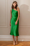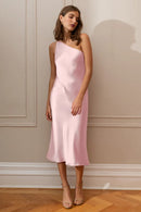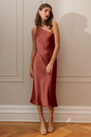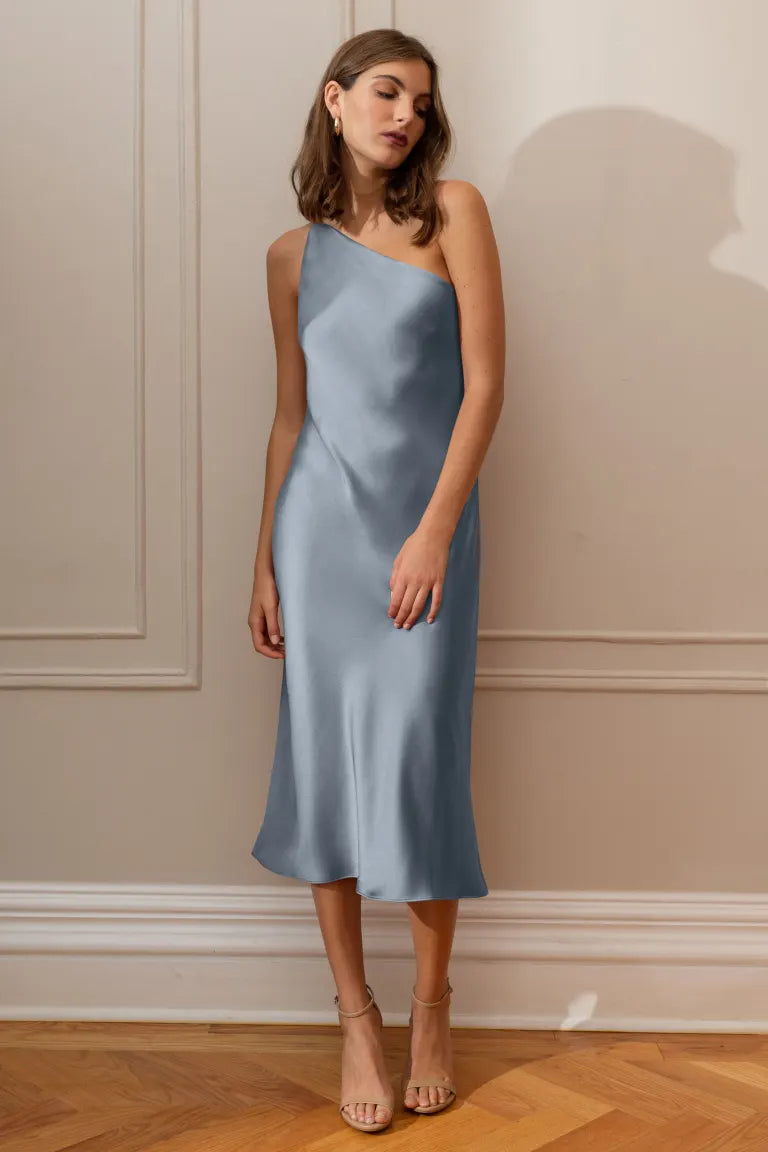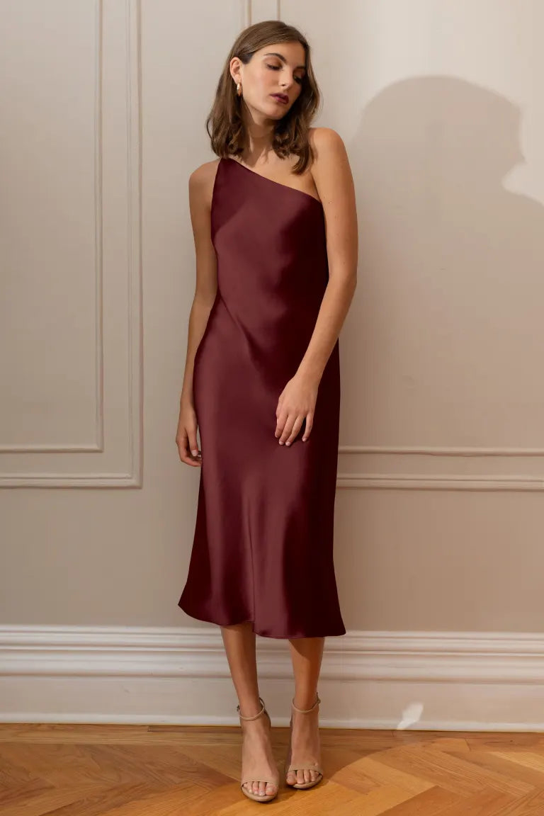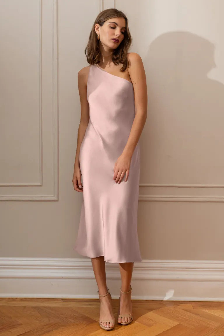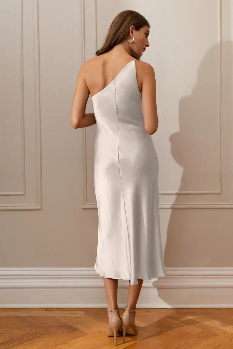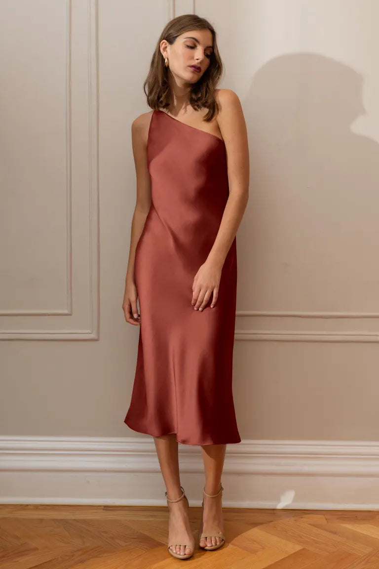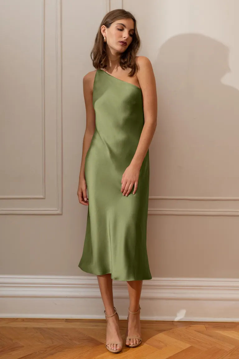 The Abby one-shoulder midi dress offers a sleek and contemporary twist on the classic slip silhouette. With its modern asymmetrical one-shoulder neckline and the luxurious satin fabric cut on the bias, this dress elegantly drapes over your curves, providing an effortlessly flattering fit.