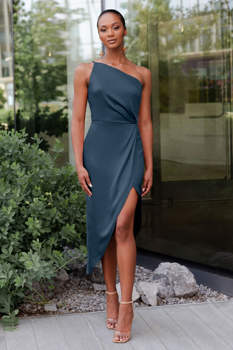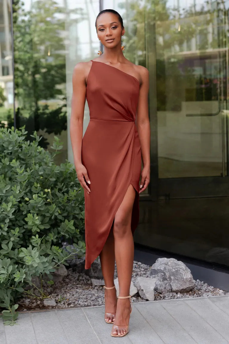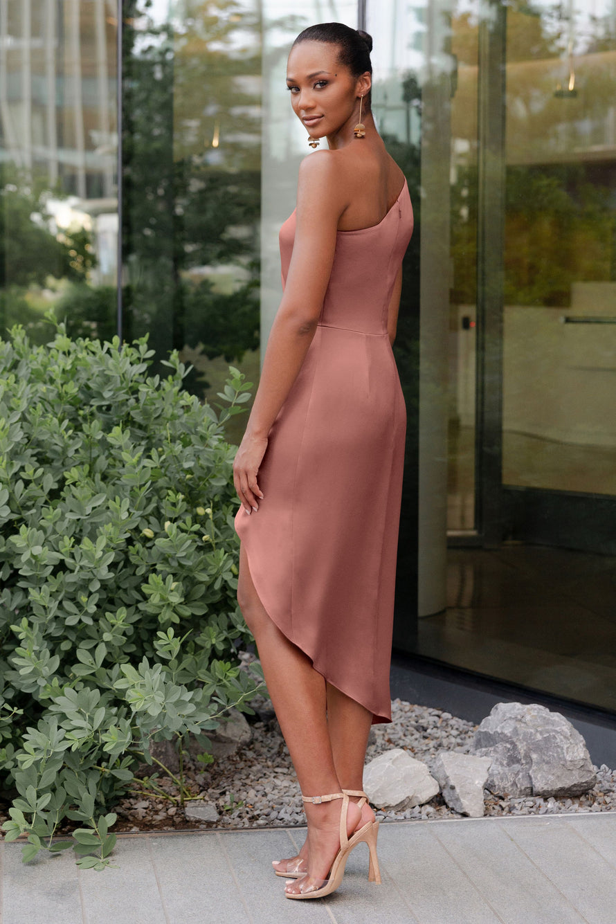 The Calla dress, crafted from our exquisite and radiant luxe satin, is a sophisticated option for any occasion. Its pleasing one-shoulder neckline is accentuated by flattering pleats, and the asymmetrical midi skirt offers you the perfect chance to flaunt a stunning pair of heels.