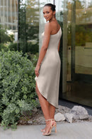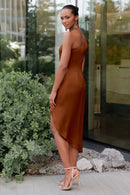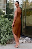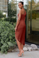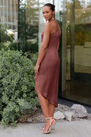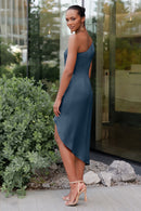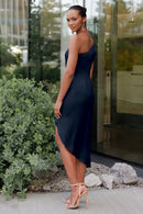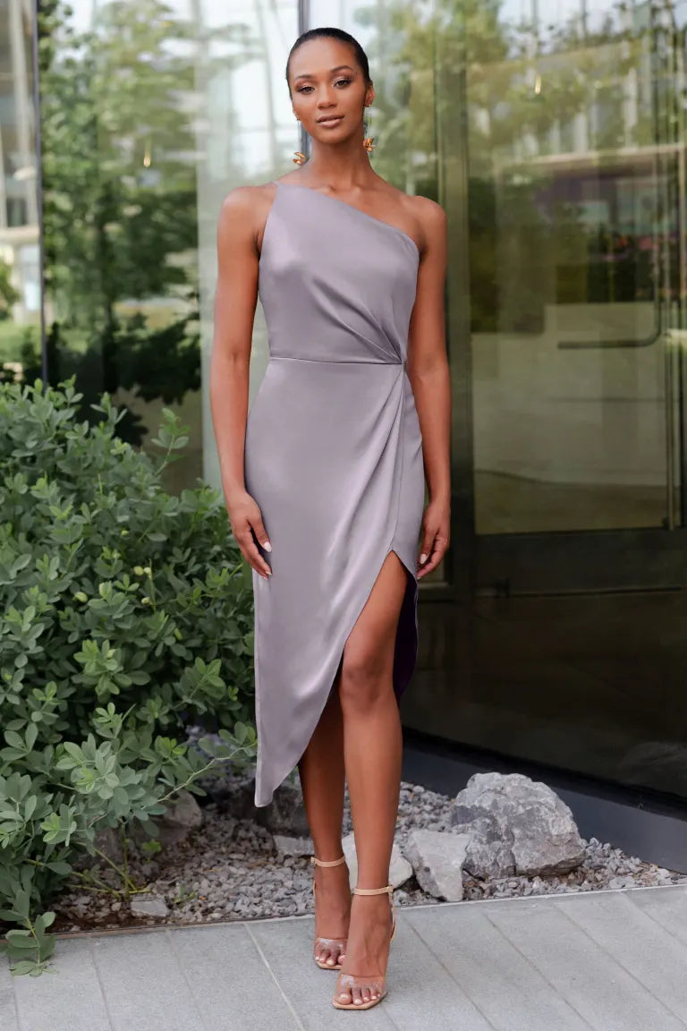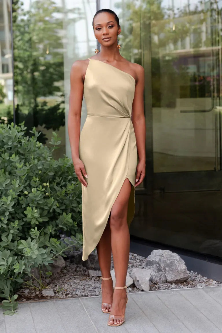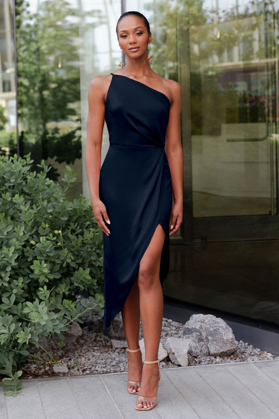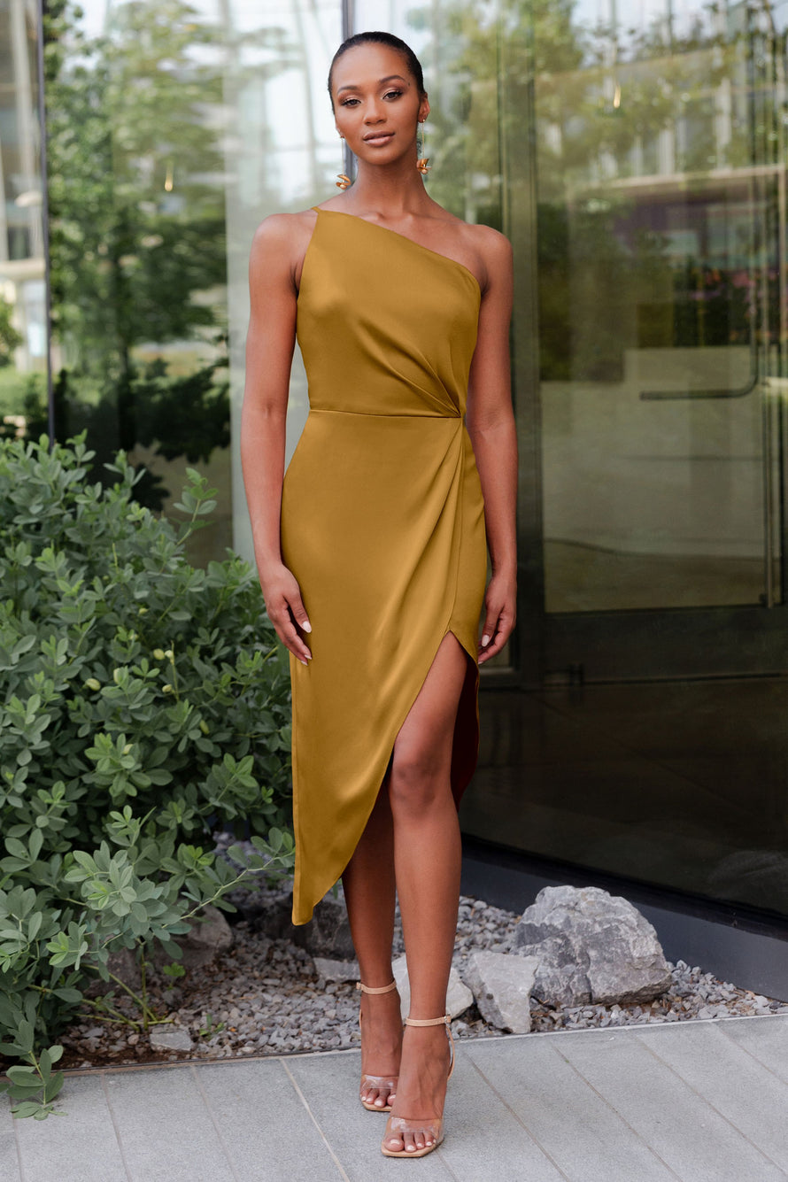 The Calla dress, crafted from our exquisite and radiant luxe satin, is a sophisticated option for any occasion. Its pleasing one-shoulder neckline is accentuated by flattering pleats, and the asymmetrical midi skirt offers you the perfect chance to flaunt a stunning pair of heels.