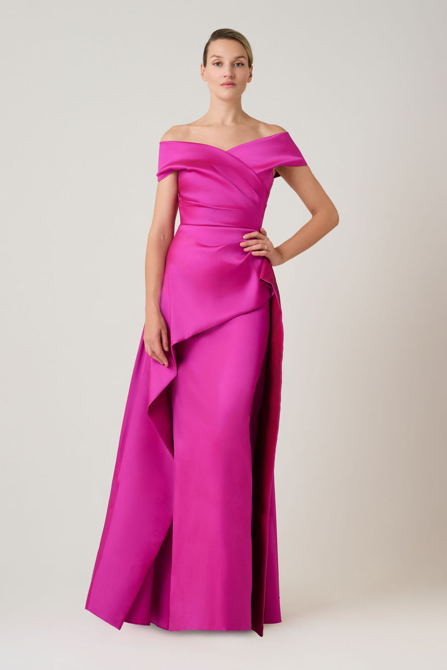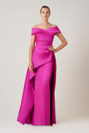Introducing our mikado peplum overskirt dress in regal royal blue! This exquisite gown features meticulous ruching through the bodice, ensuring a flattering and elegant silhouette. The off the shoulder neckline adds a touch of allure, while the peplum overskirt adds a modern and sophisticated flair. Perfect for special occasions, this stretch dress seamlessly blends style and comfort for a truly enchanting look.