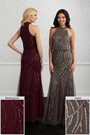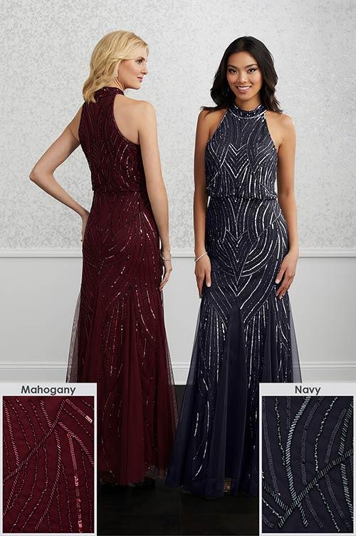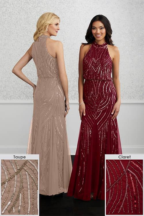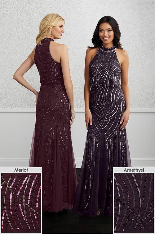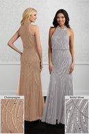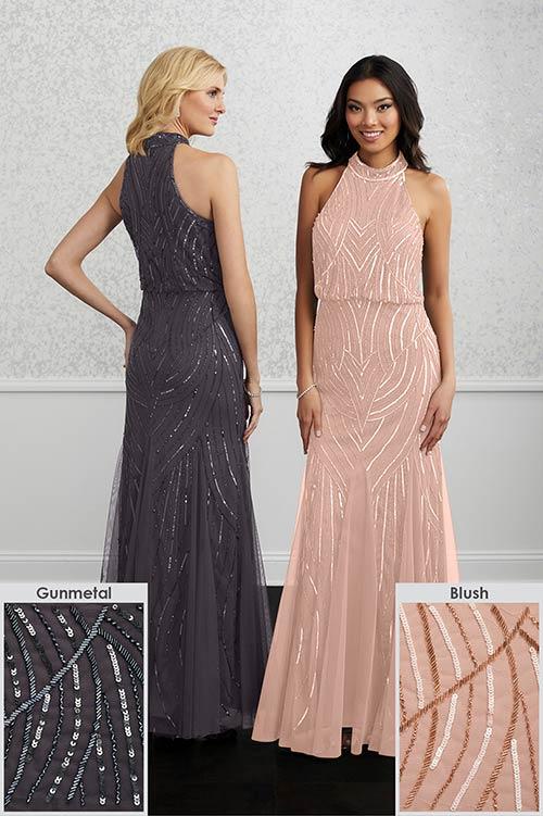 | This high neckline, halter gown features a flattering blouson bodice. The all-over beading pattern trails on to a fitted skirt with soft godets for added drama |