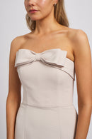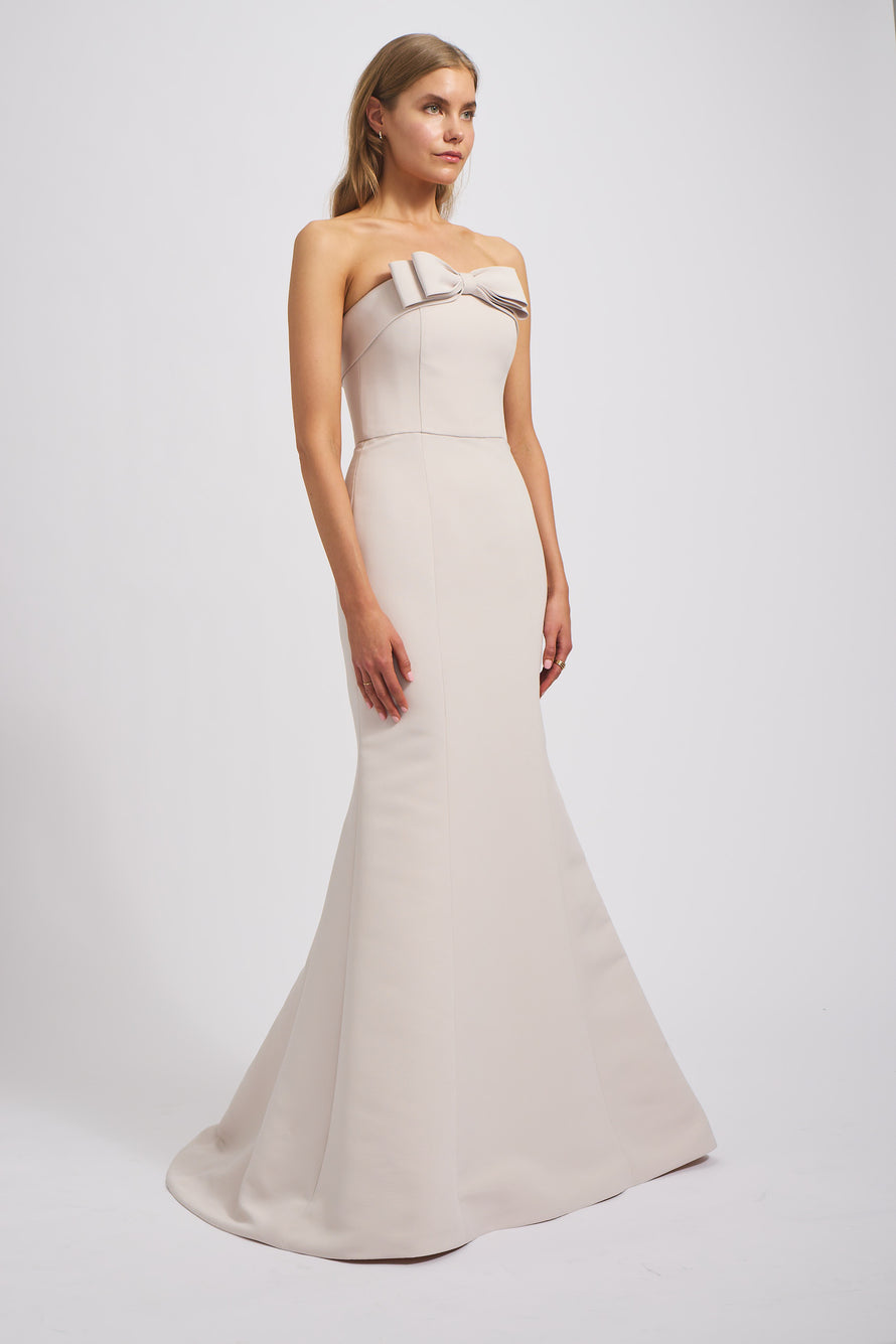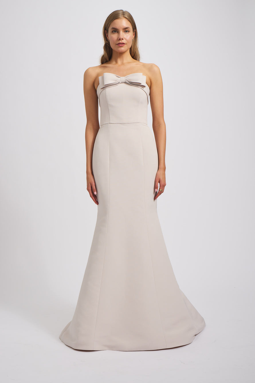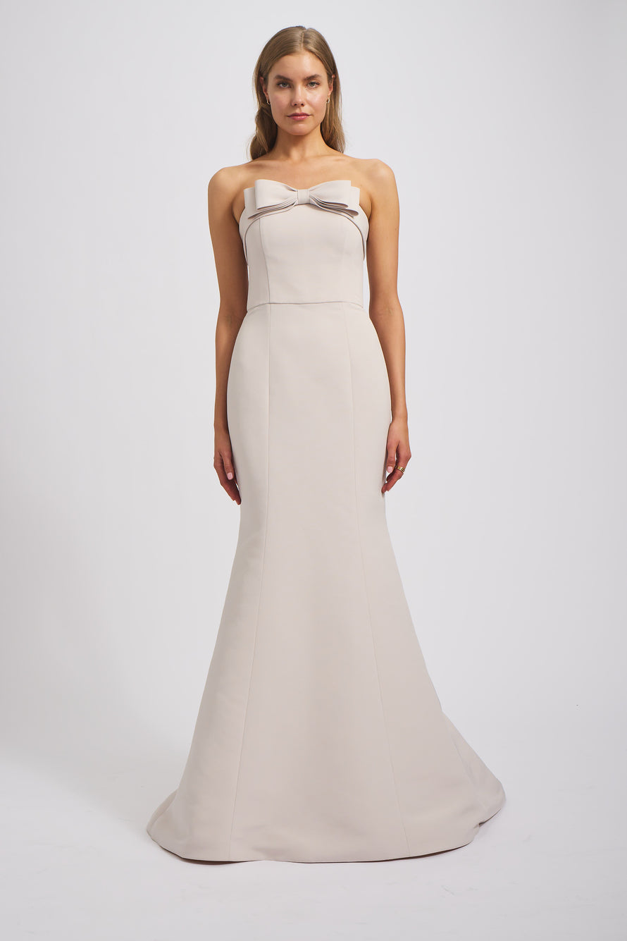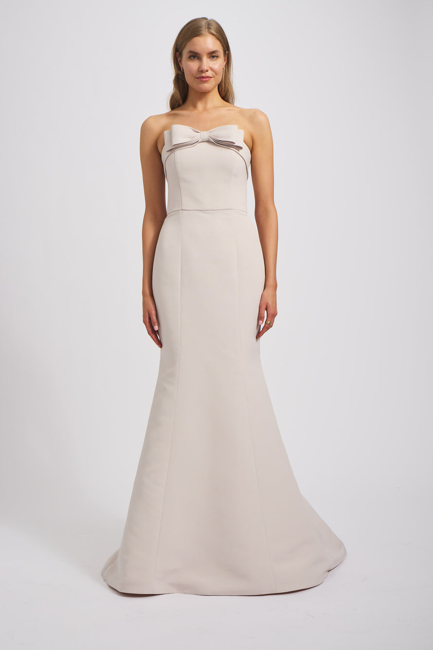 Turn heads in the Delphine bridesmaid dress, a combination of both style and refinement featuring a foldover strapless neckline with a bow detail, a natural waist line to accentuate your figure and a trumpet fit-to-flare skirt in our luxurious Faille fabric.