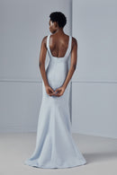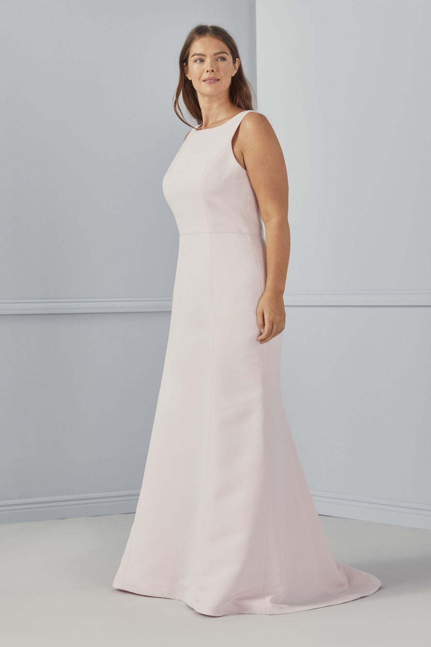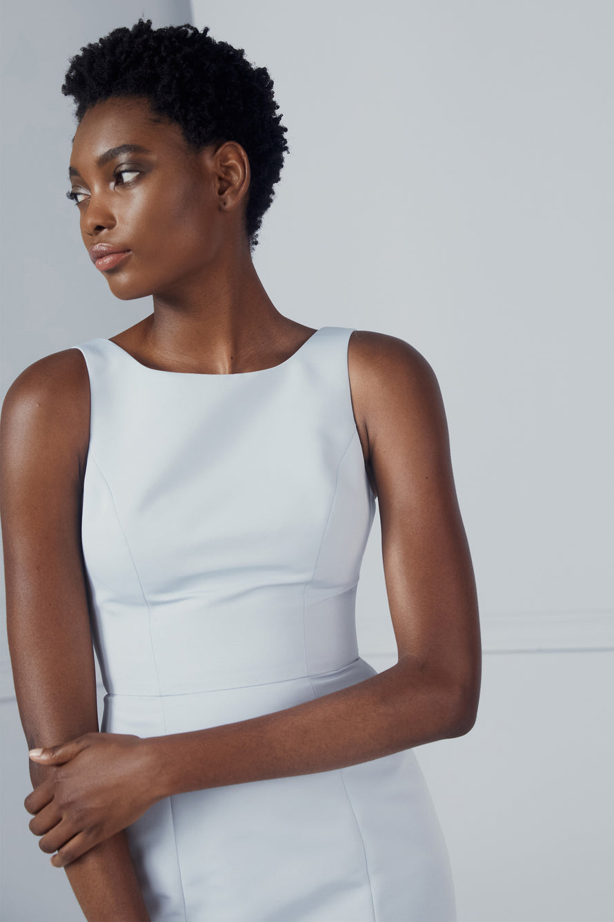 The Eugenia high-neck dress features a wide straps and an open low back, princess seams and fit-to-flare skirt in Faille.