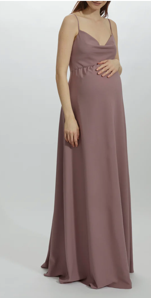 Crafted in our breathable crepe fabric, the Polly maternity dress boasts a stylish cowl neck, spaghetti straps, empire waist and a floor length shirred skirt that accentuates your baby bump.