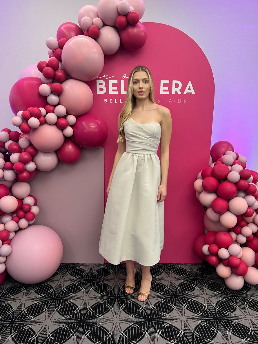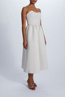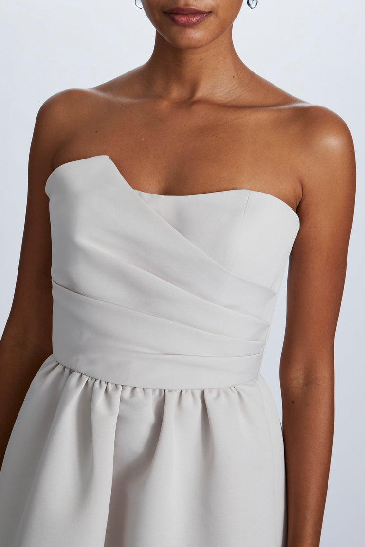 The Henrietta strapless cocktail dress features a beautifully pleated crumb-catcher bodice, open back and gathered midi-length A-line skirt in our structured Faille fabric.