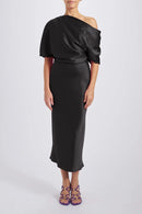 This midi dress features an asymmetrical draped slouch shoulder and a slim midi skirt with a back slit.