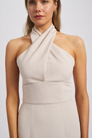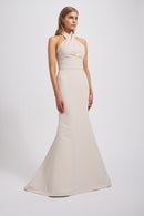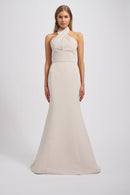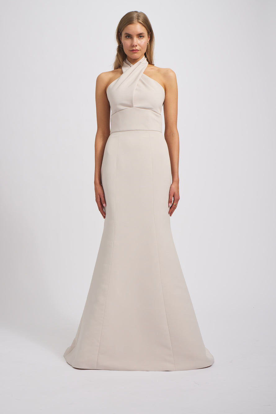 Crafted from our sumptuous Faille, the Rue boasts a criss cross halter neckline, sultry open V-back, thick band waist and a chic fit-to-flare skirt cascading to the floor. This elegant and modern gown will make a lasting impression.