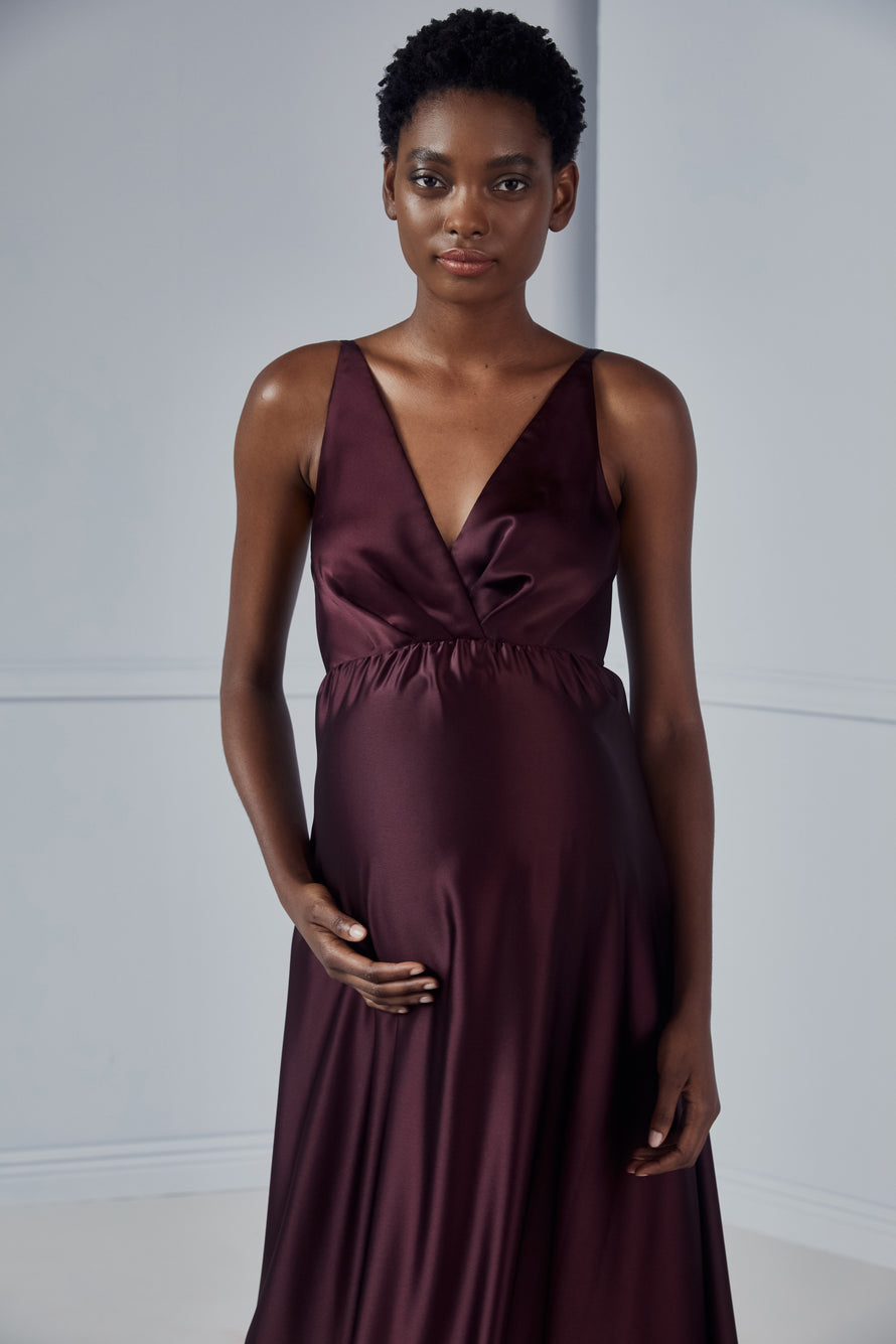 Maternity V-neck overlapping neckline with strappy back detail and shirred skirt in Fluid Satin