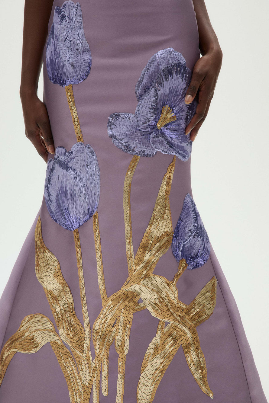 Mikado hand draped strapless fit-to-flare gown with oversized tulip sequin appliqué. Shown in Violet.