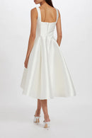Mikado multiple seamed square neck tea length A-line dress.