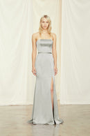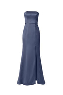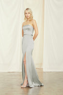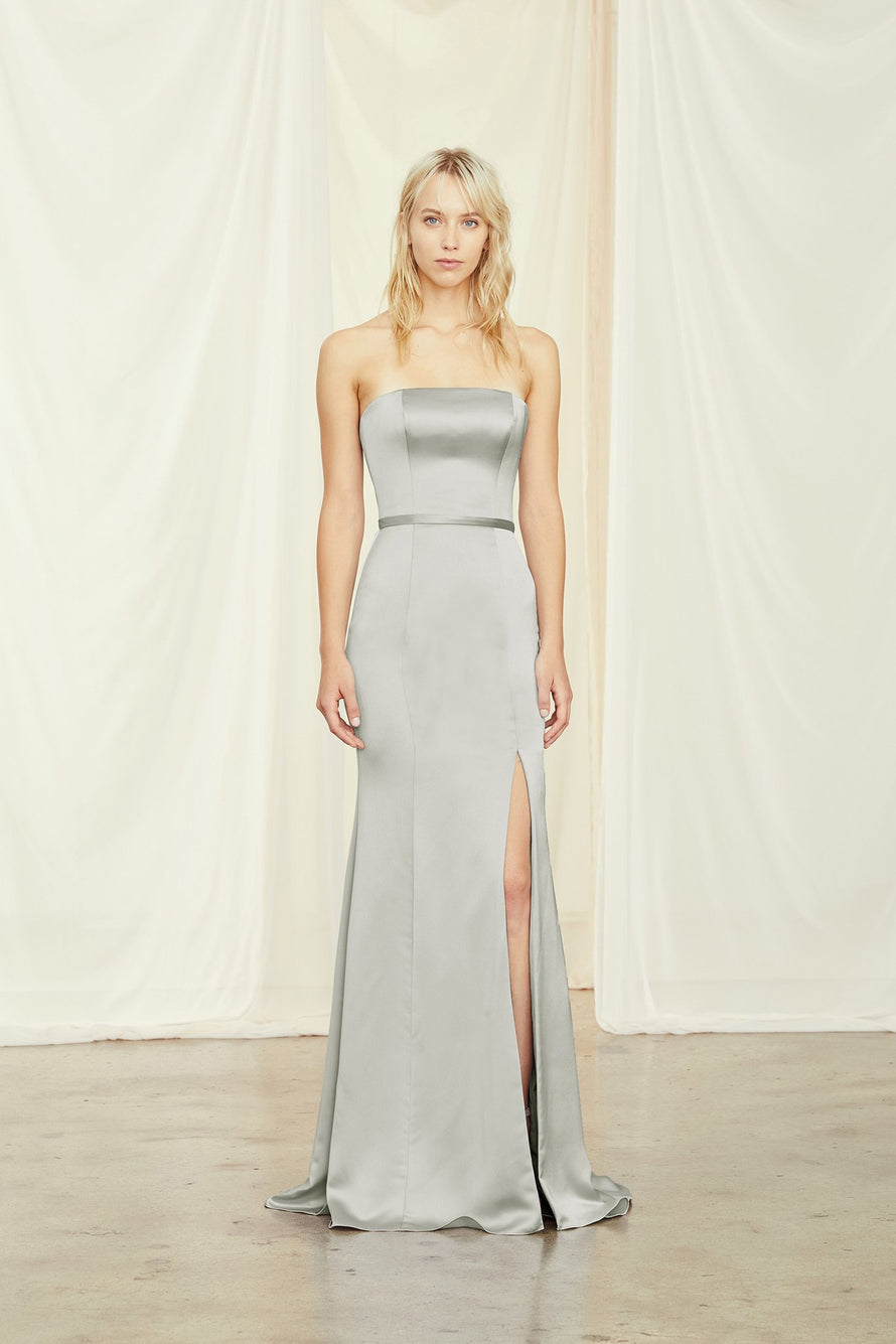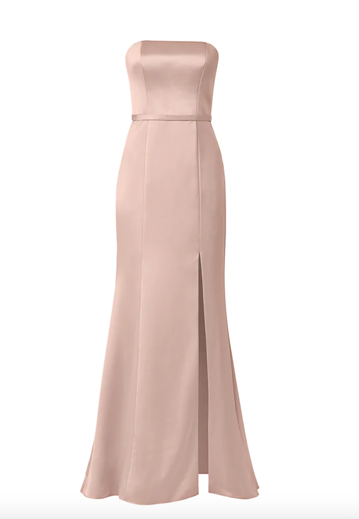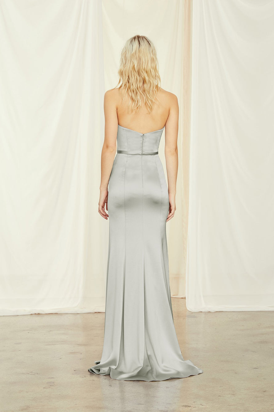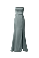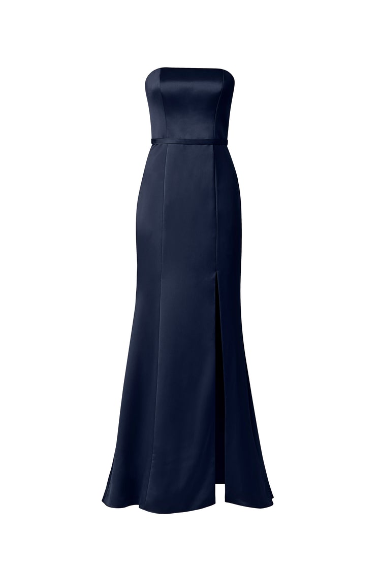 The Marisa strapless dress features straight neckline, a thin belt at the natural waist and a fit to flare skirt with a front slit cut from our sleek Fluid Satin.
