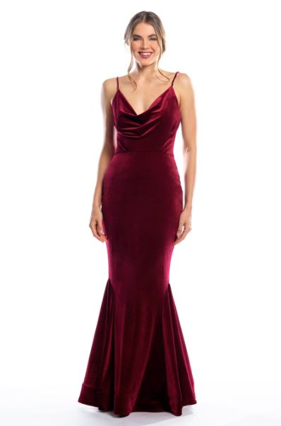 Spaghetti strap cowl neck bodice with mermaid skirt and horsehair hem.
